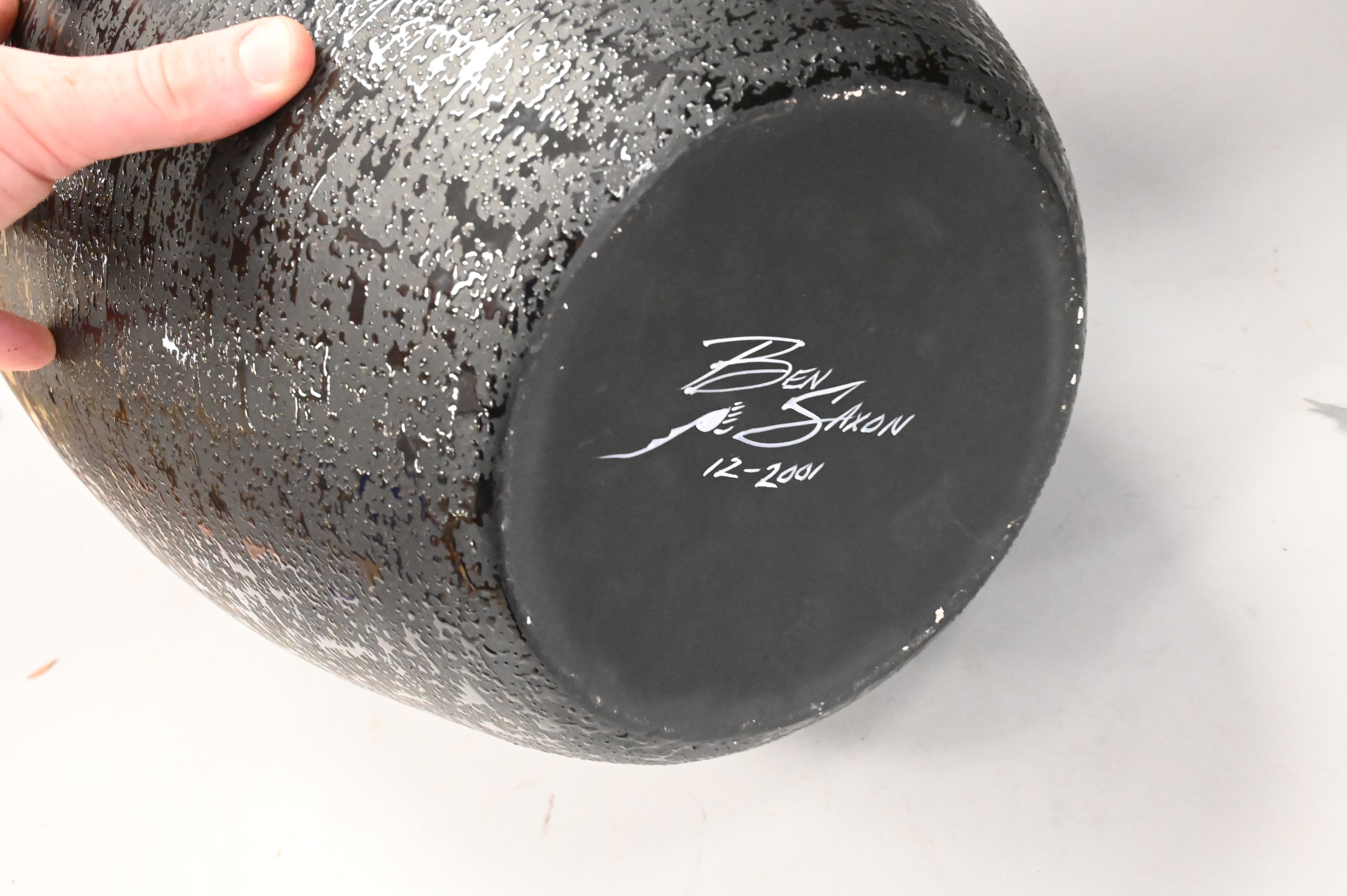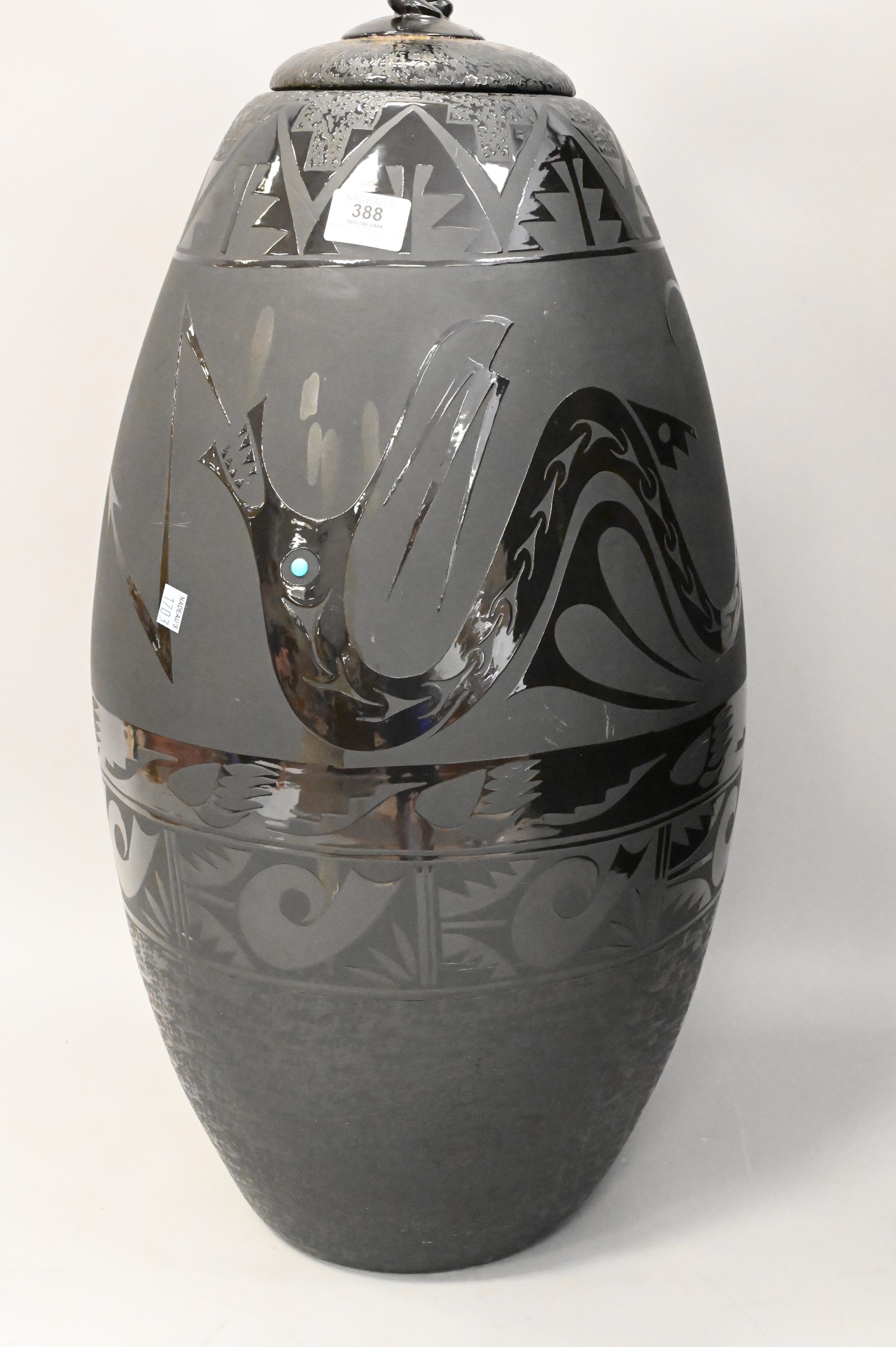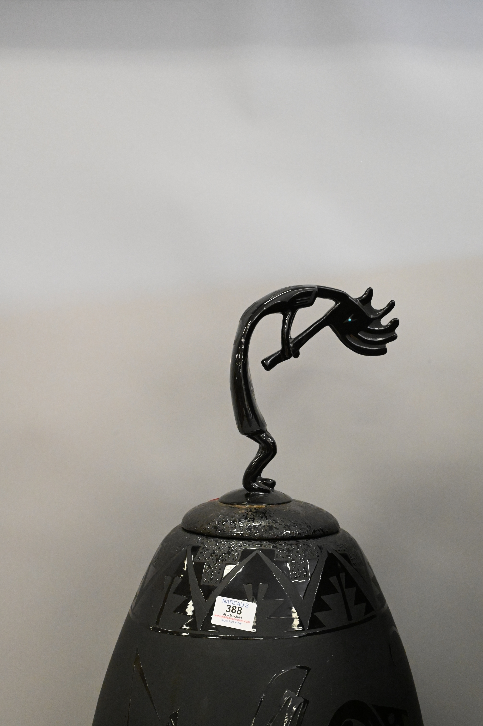 Ben Saxon Native American Black on Black, “Kokopelli” lidded vase with turquoise embellishments, height 37 inches.