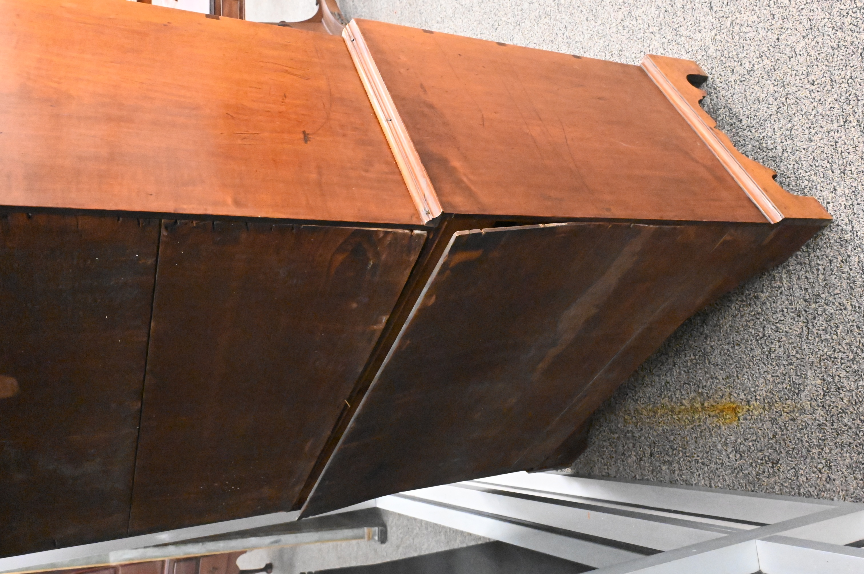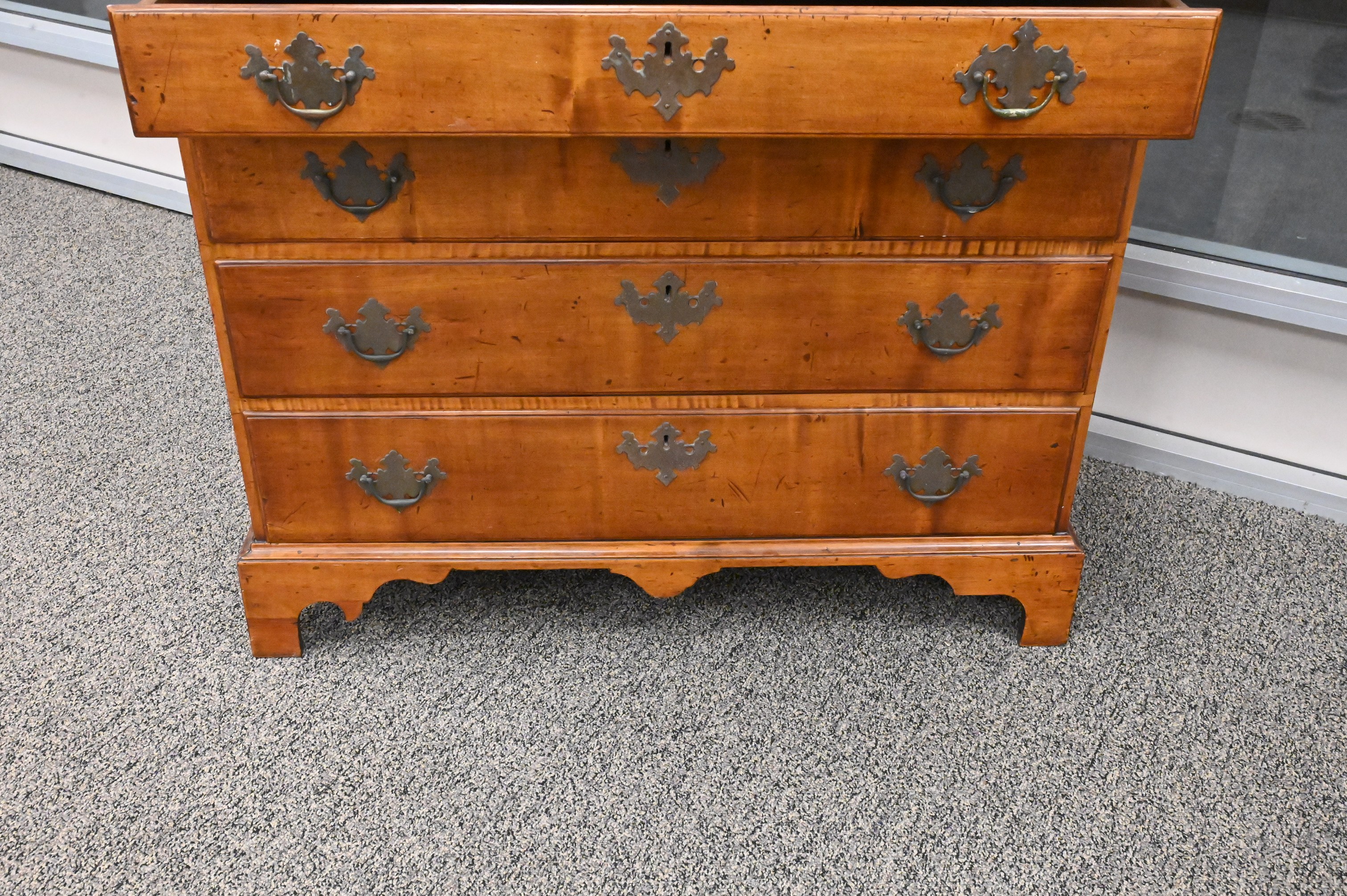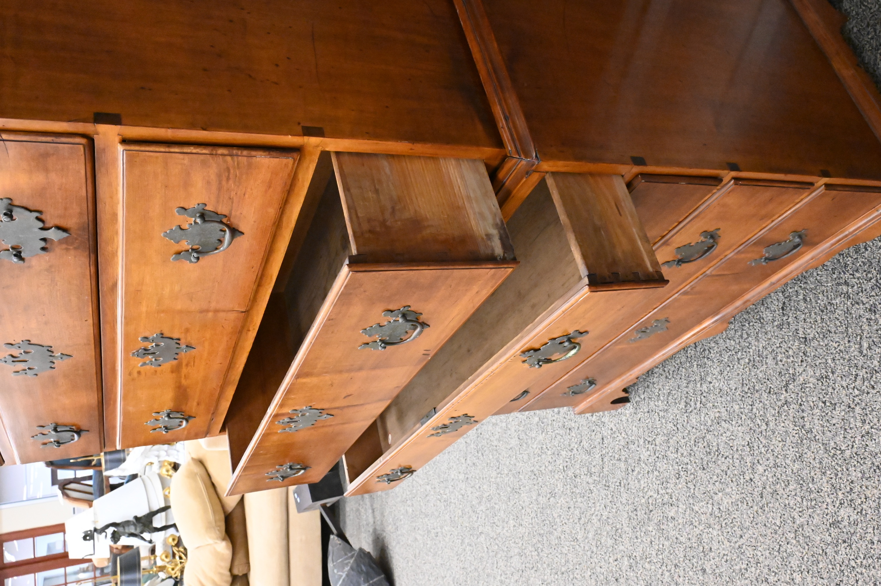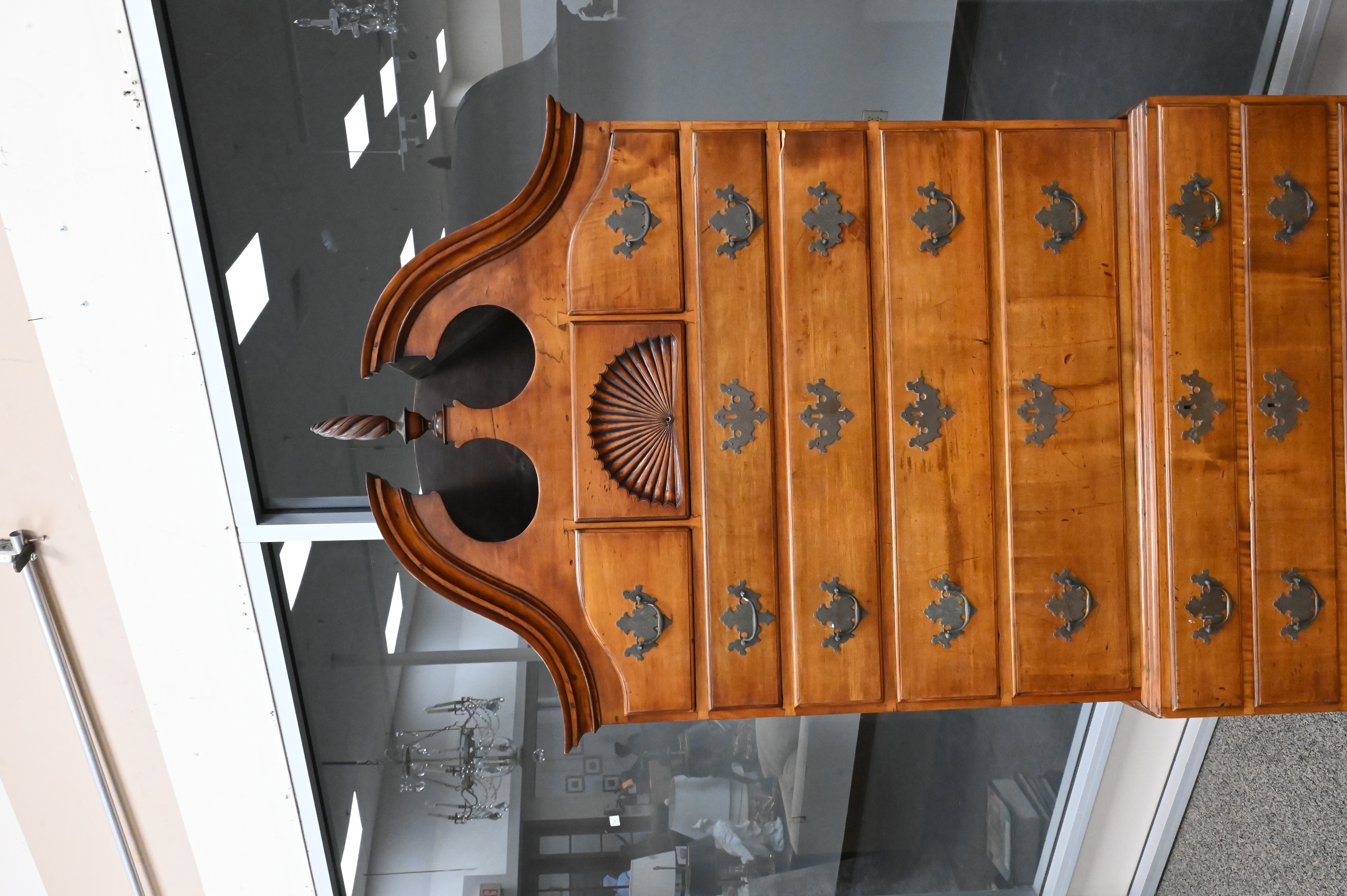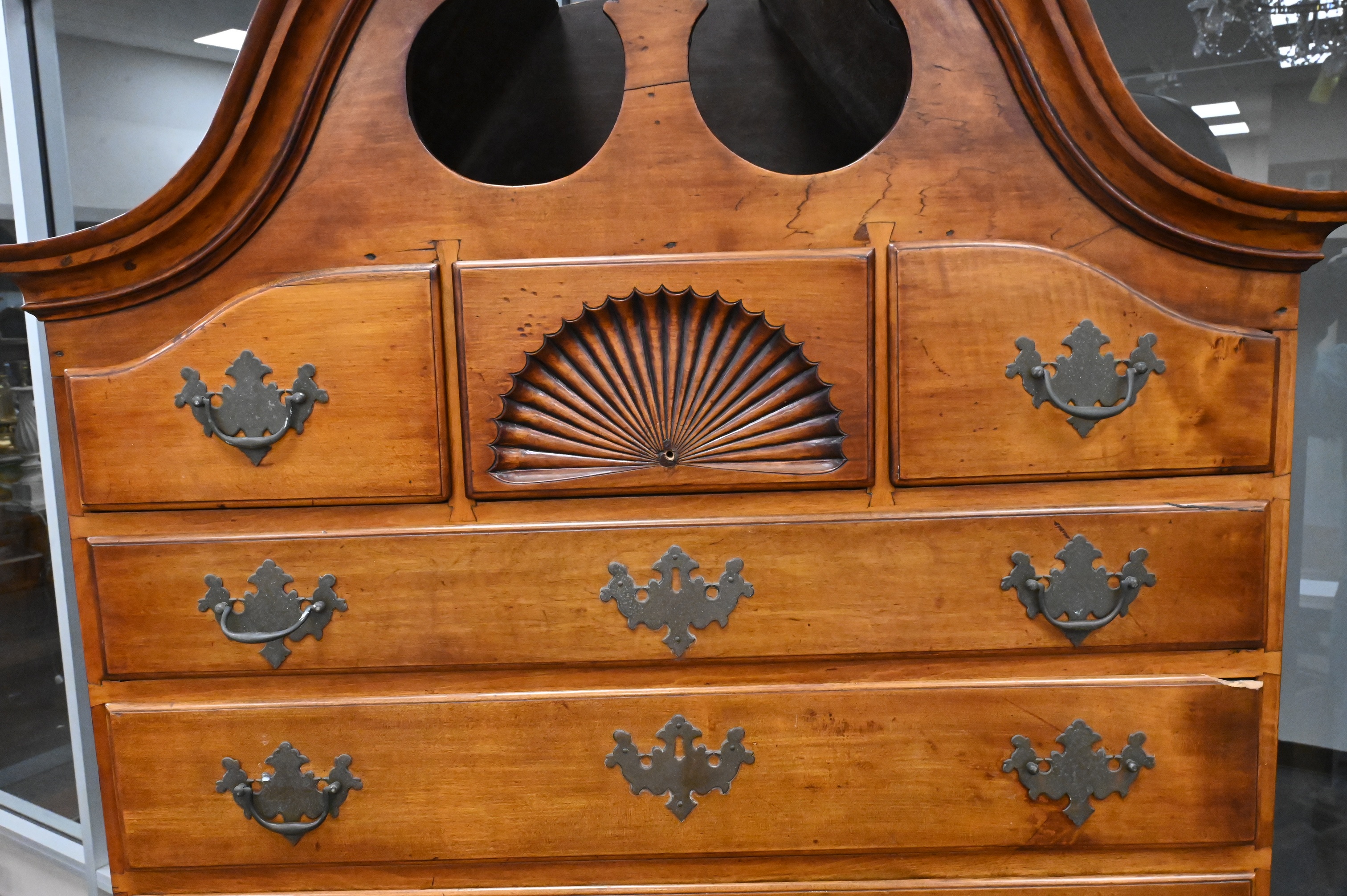 in two parts upper sections having closed bonnet top over three short drawers over four graduated drawers on lower section with four graduated drawers set on cut out bracket feet having drop center, New England circa 1760