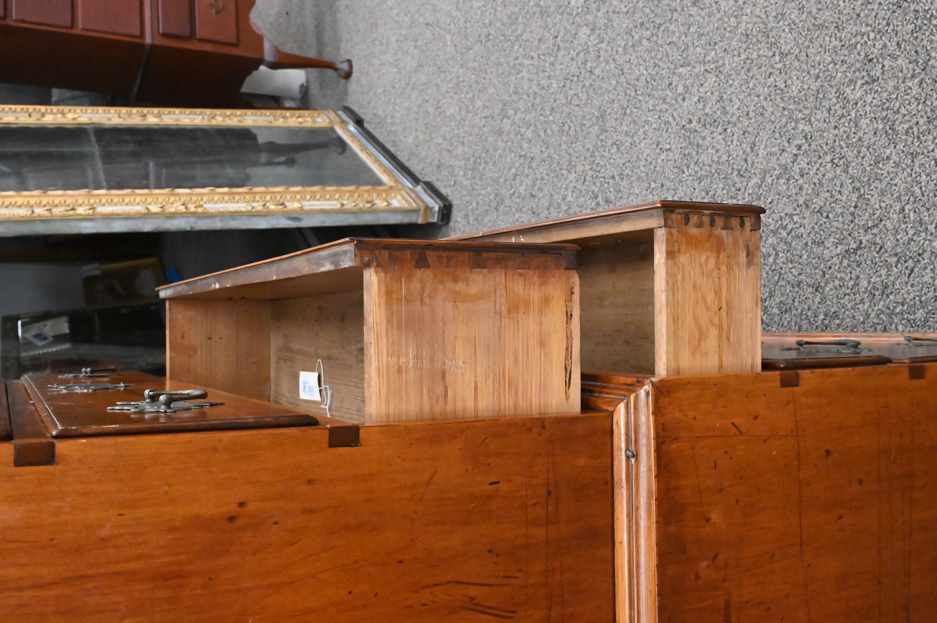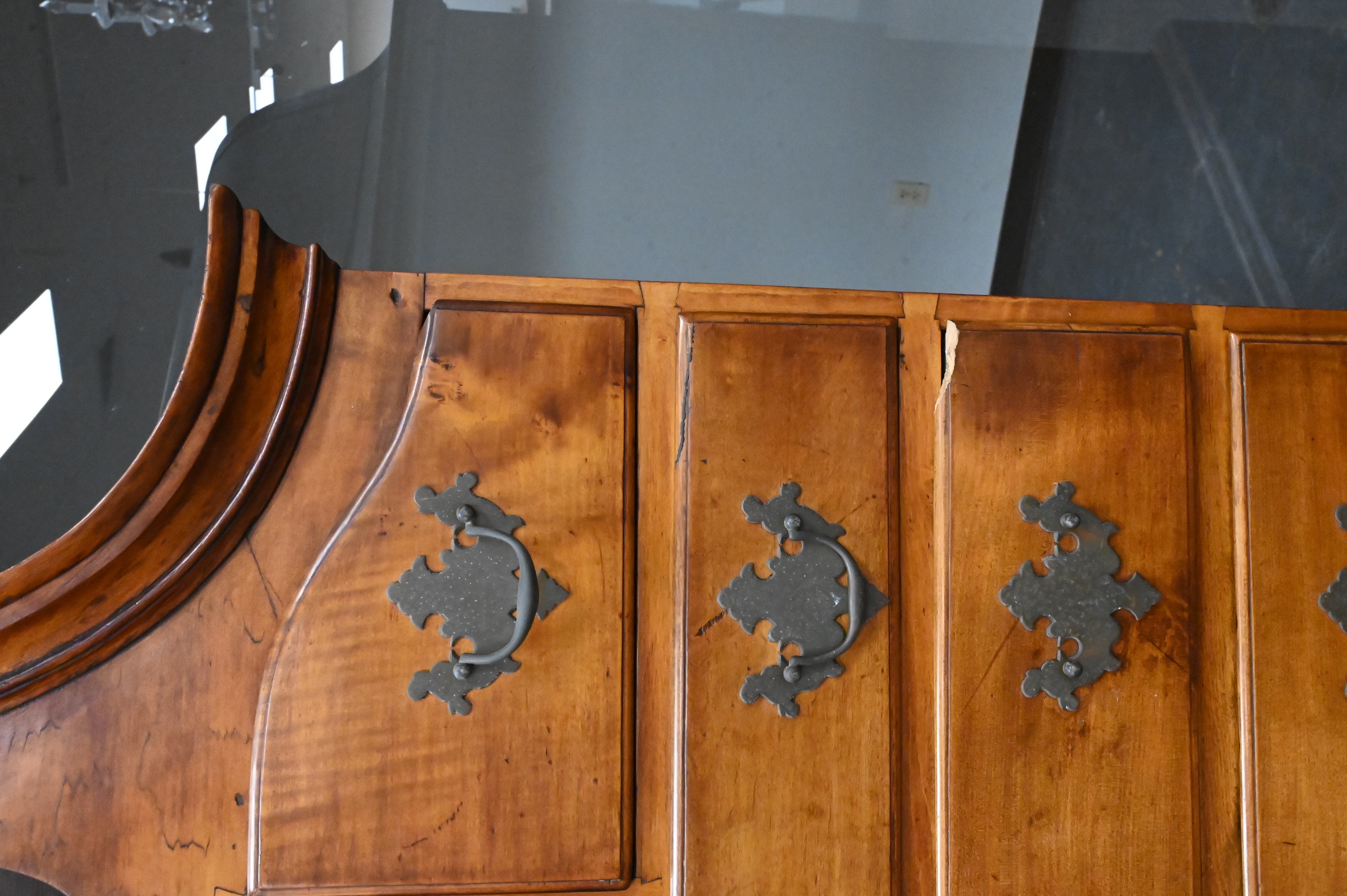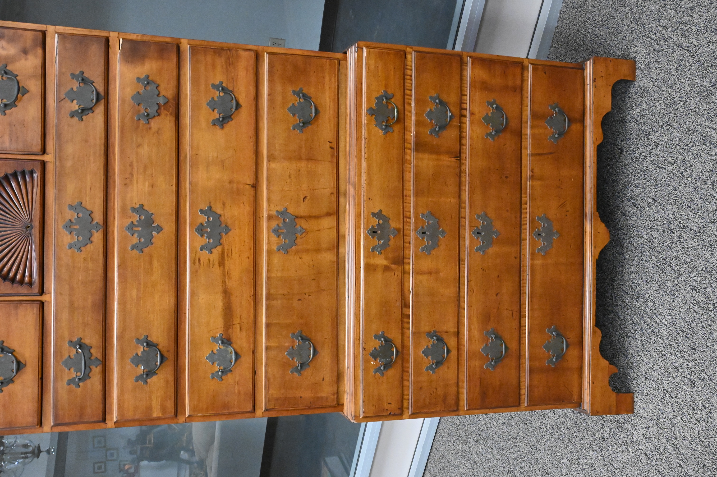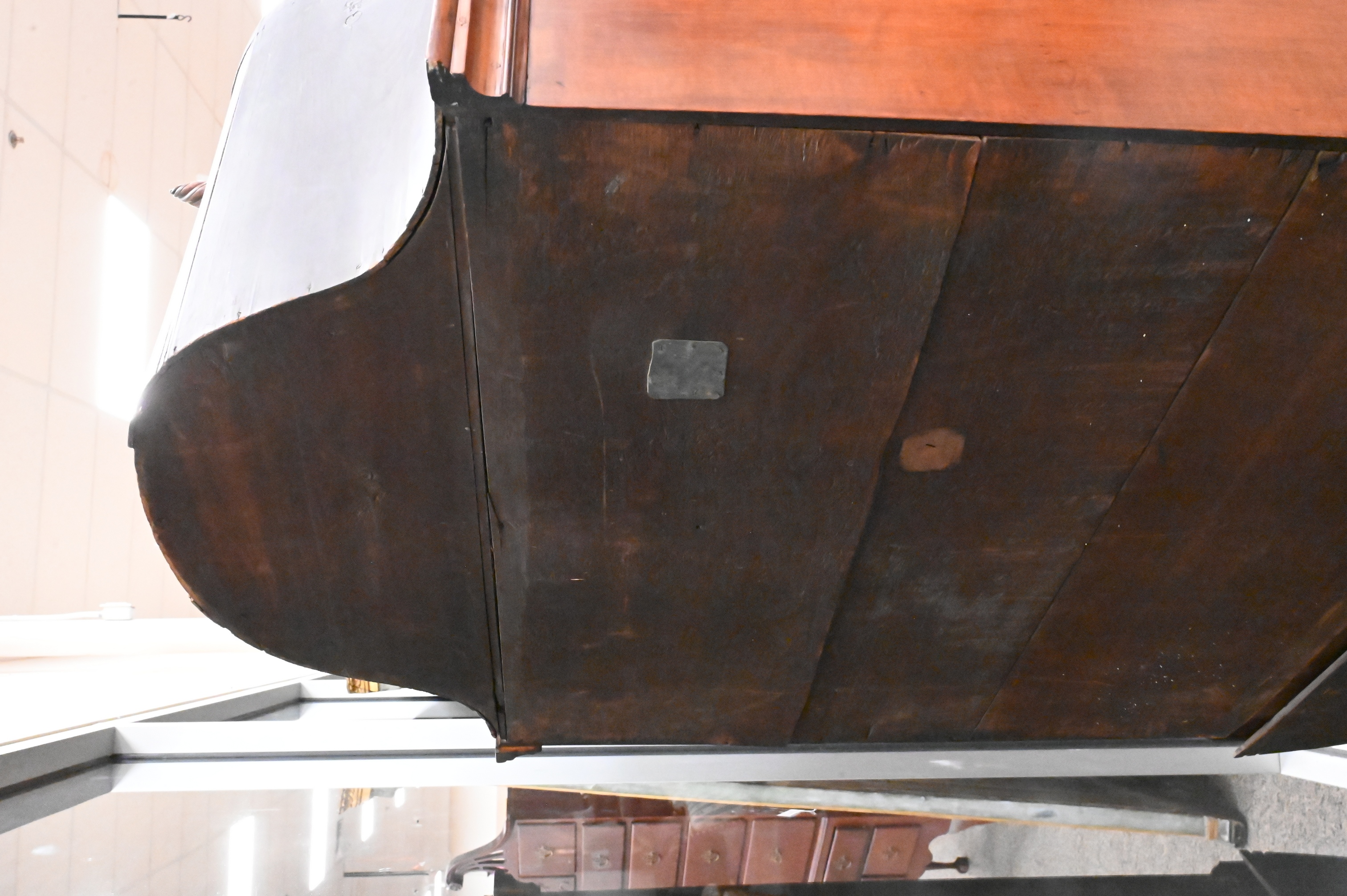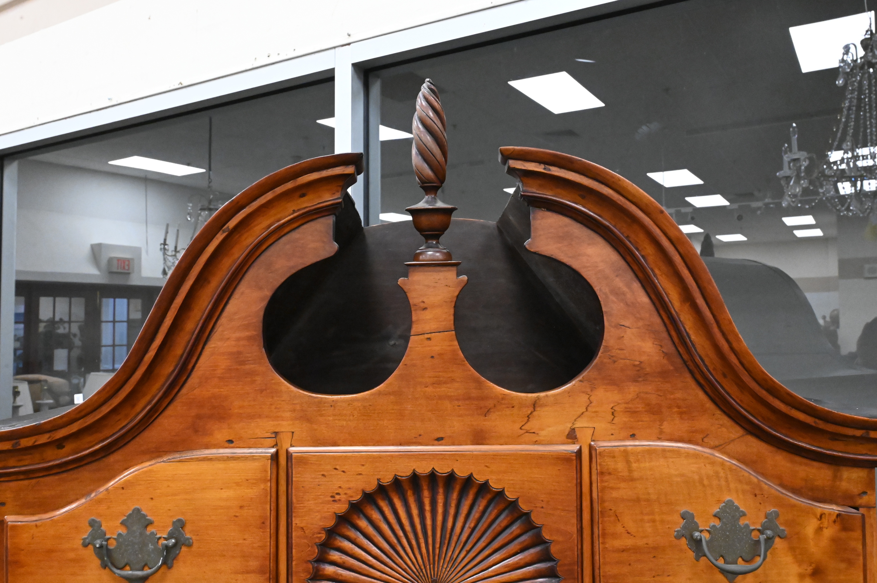 in two parts upper sections having closed bonnet top over three short drawers over four graduated drawers on lower section with four graduated drawers set on cut out bracket feet having drop center, New England circa 1760