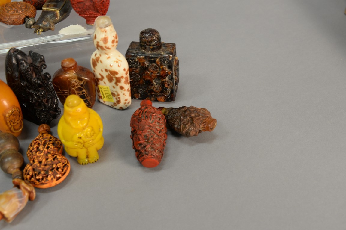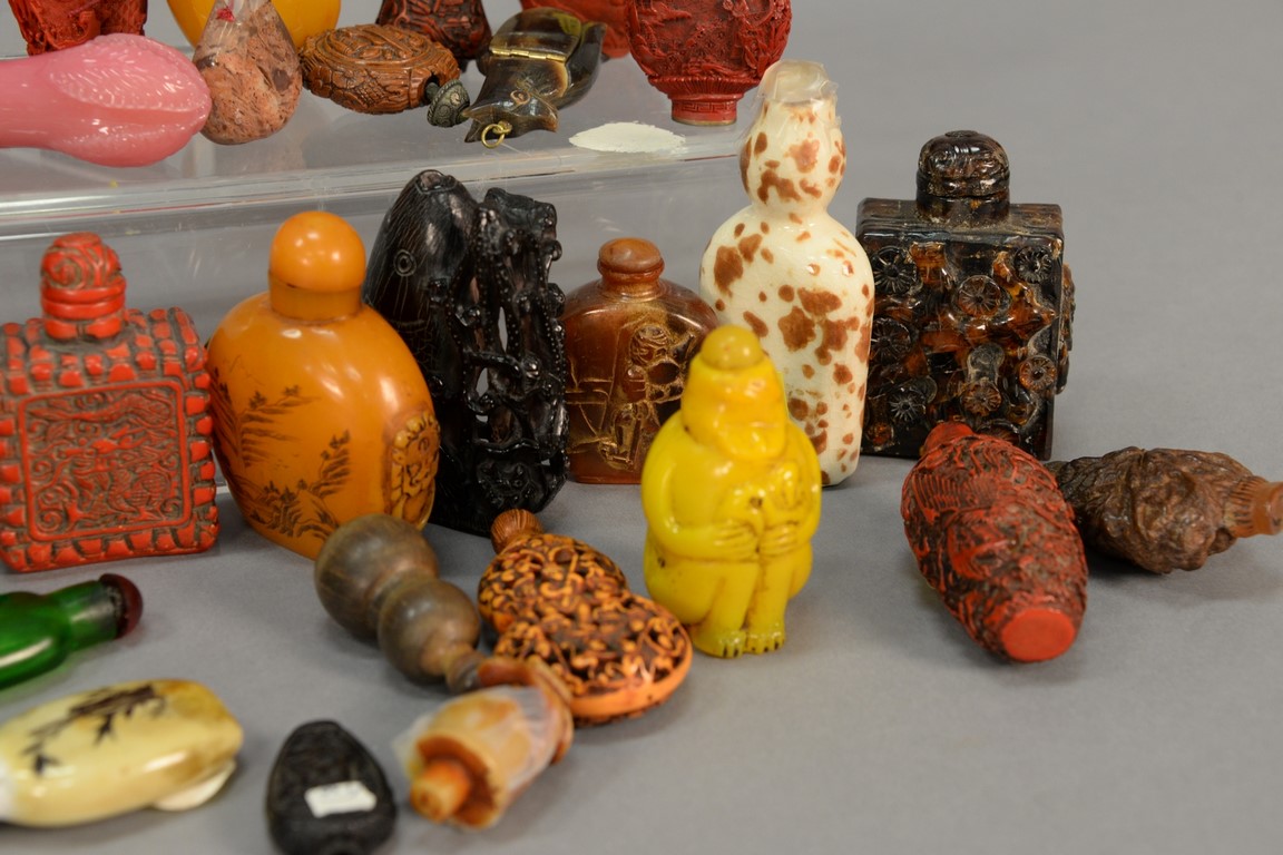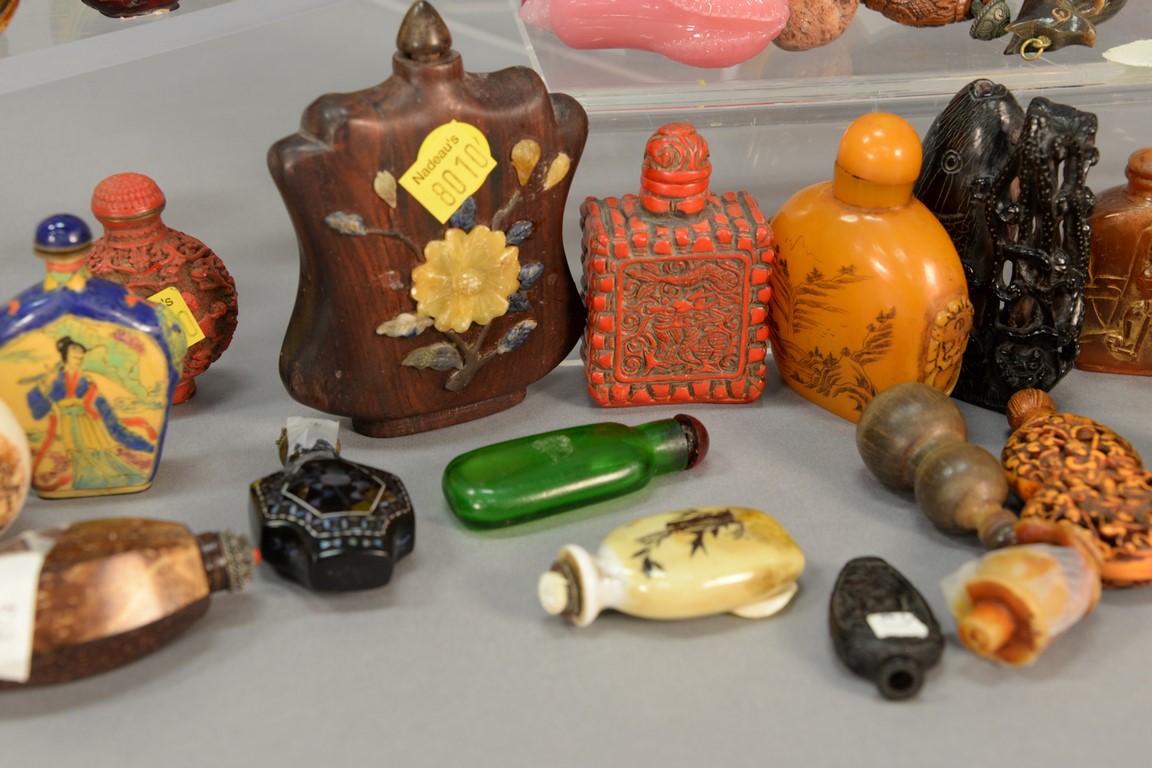 Collection of fifty Oriental snuff bottles to include hardwood, glass, ceramic, porcelain, cinnabar style enameled, etc., 20th century.