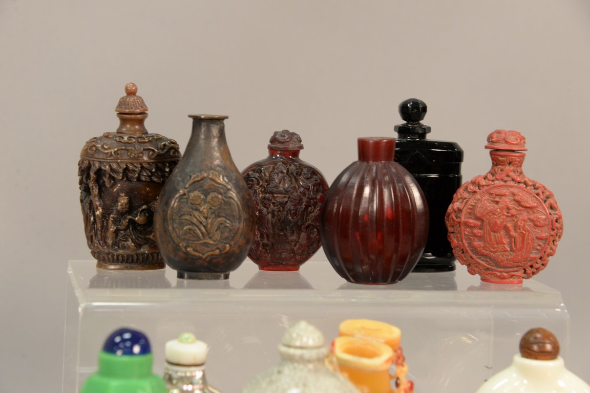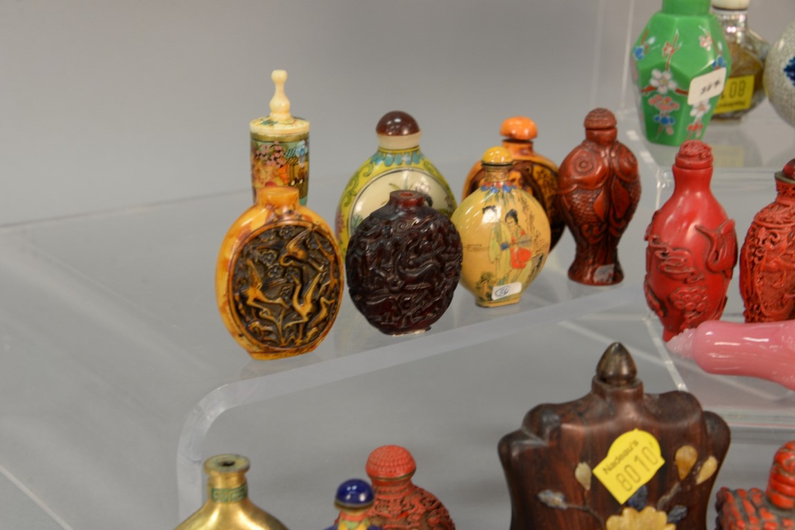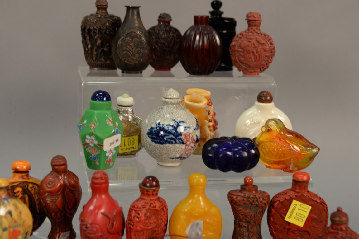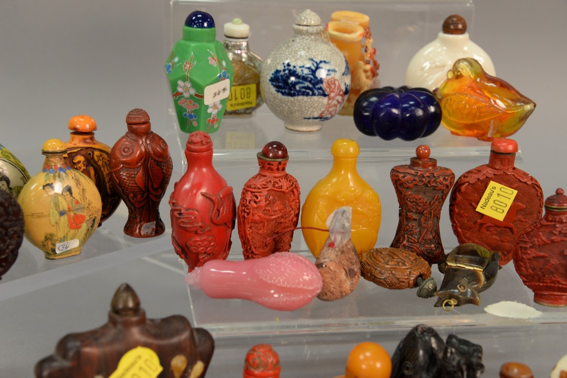 Lot 388: Collection of fifty Oriental snuff bottles to include hardwood, glass, ceramic, porcelain, cinnabar style enameled, etc., 20th century.
