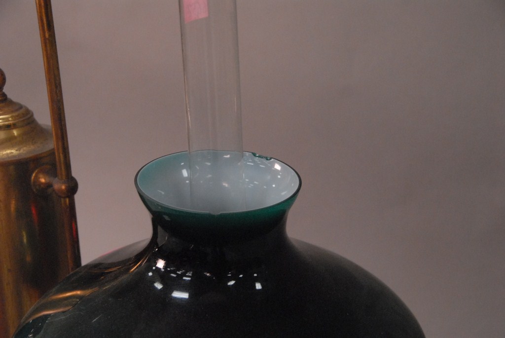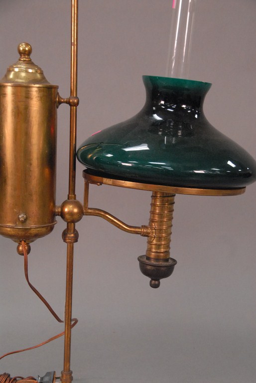 Lot 388: Double brass student lamp with green case glass shades electrified one shade with small chip. ht. 29in. wd. 28in.
