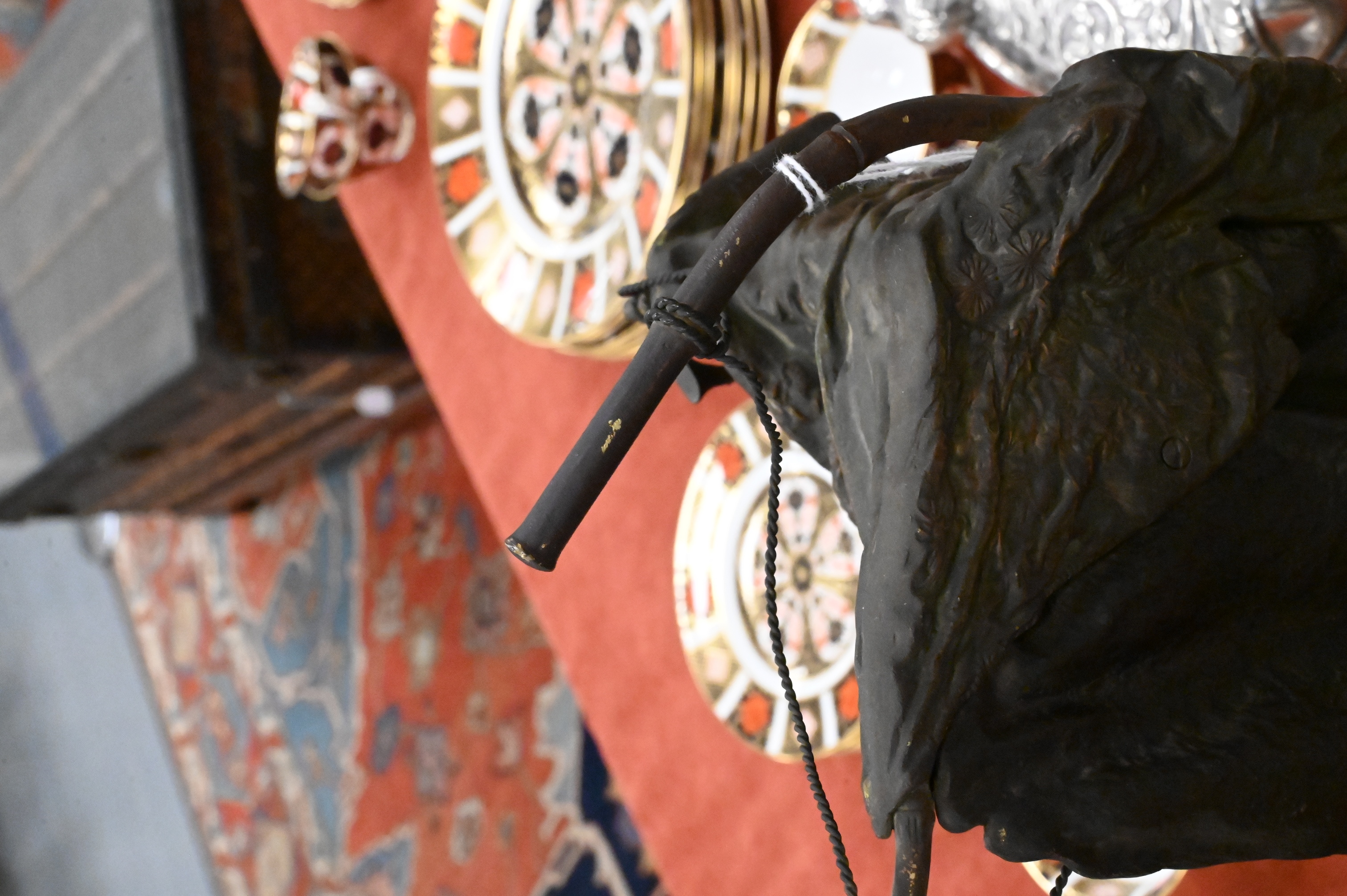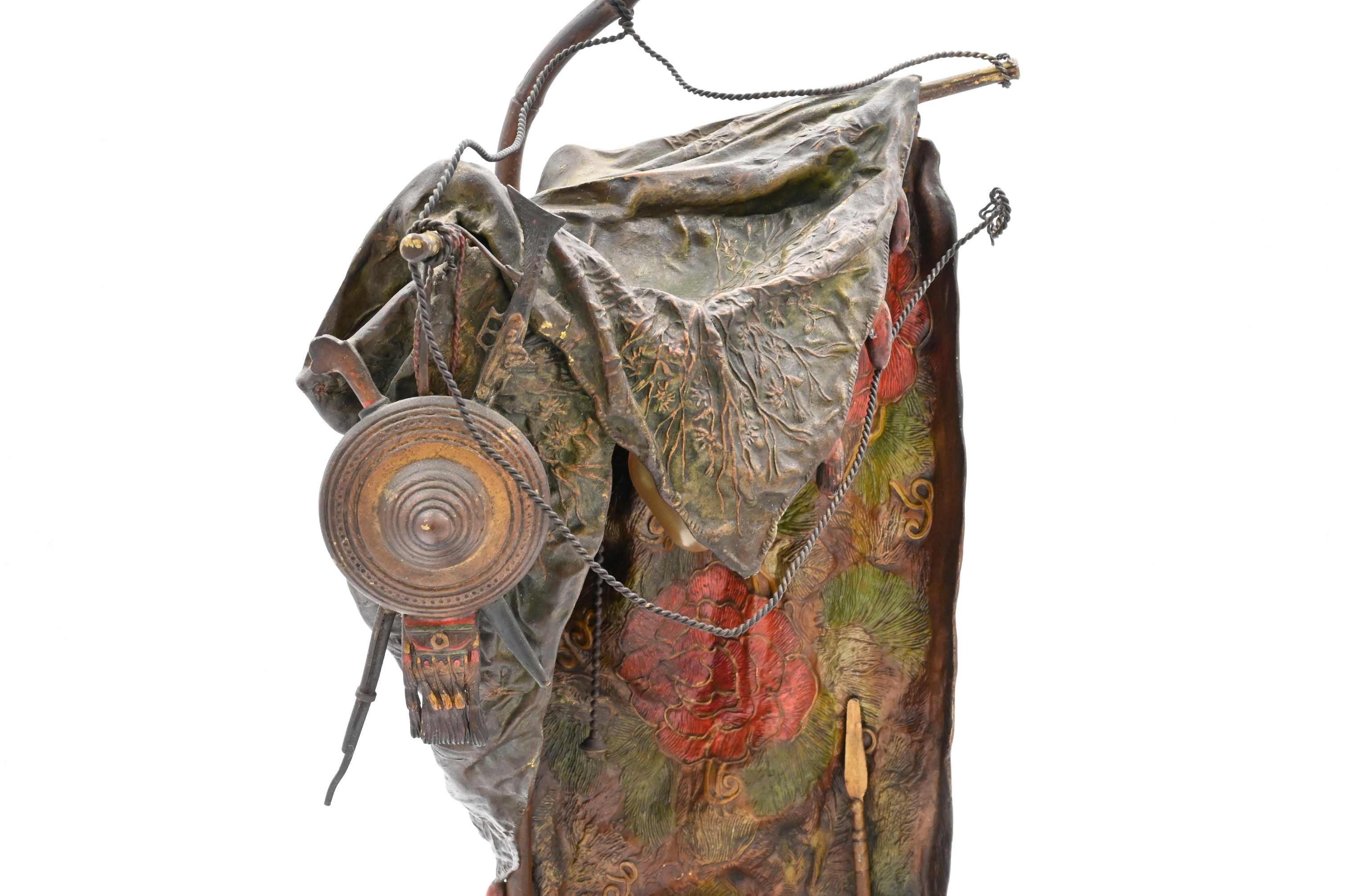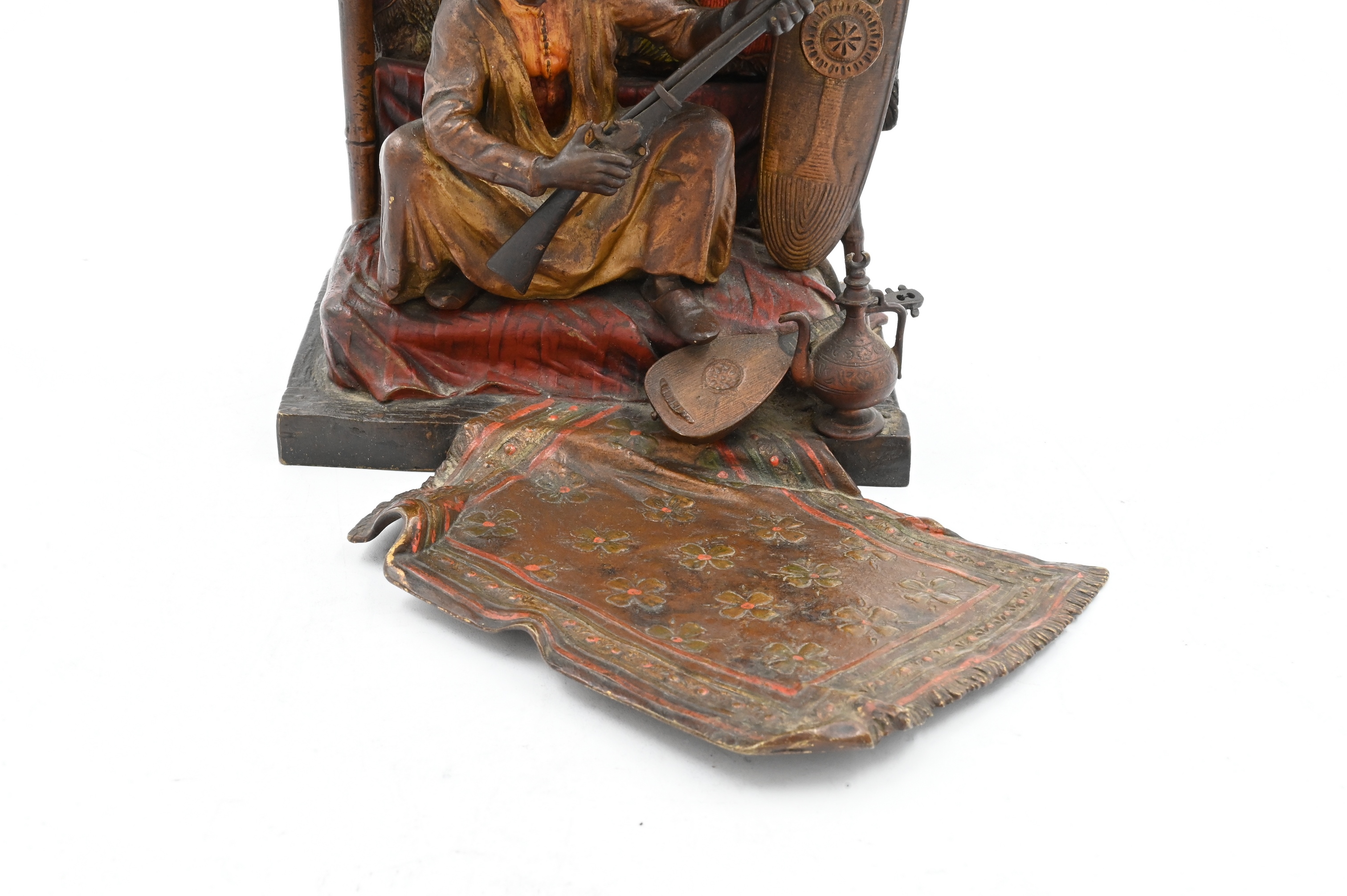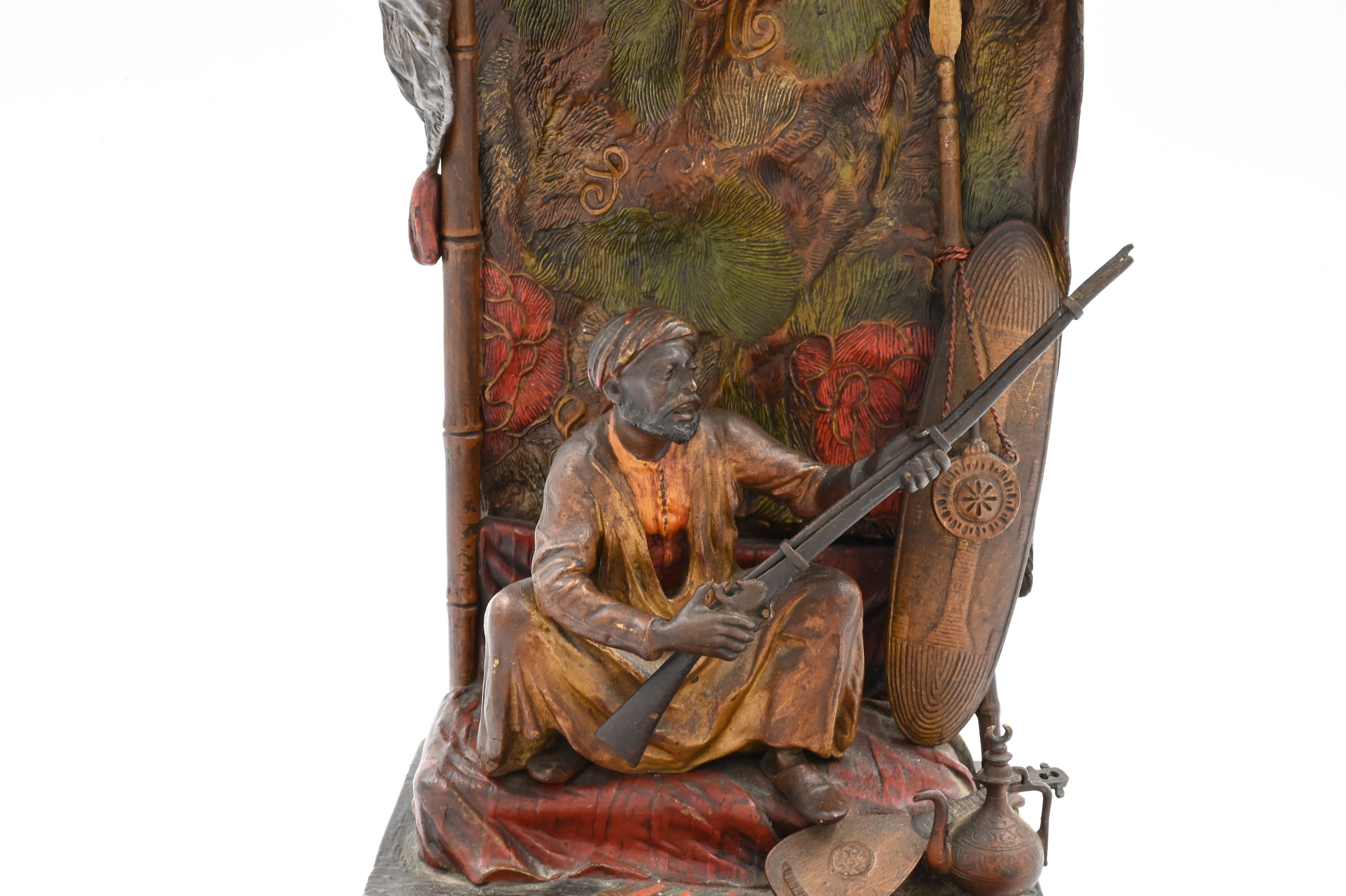 Austrian cold painted bronze lamp of Bedouin guard sitting with his rifle in front of draped floral decorated tent, surrounded with a Persian rug, coffee pot, sitar, weapons, and shield