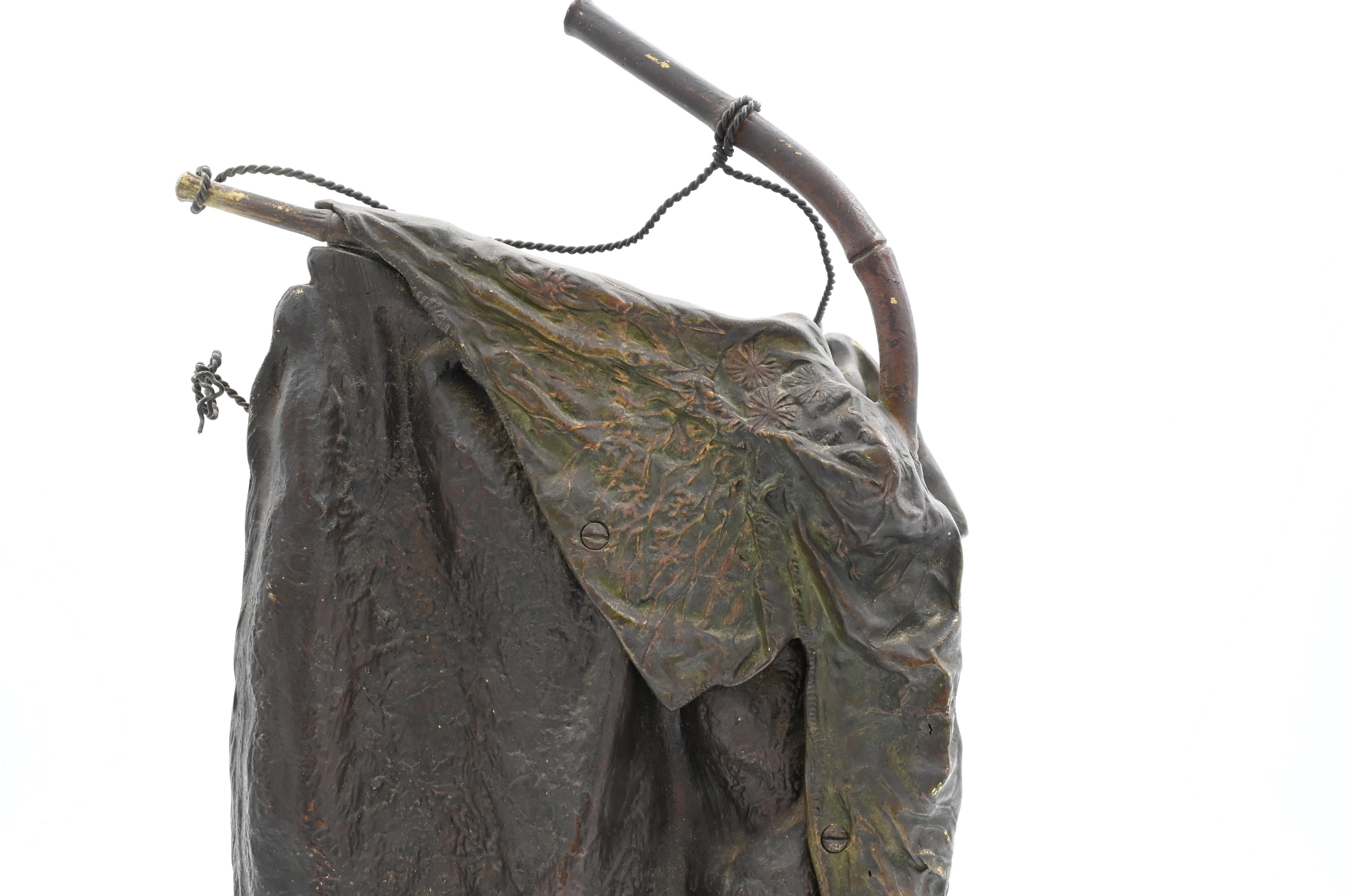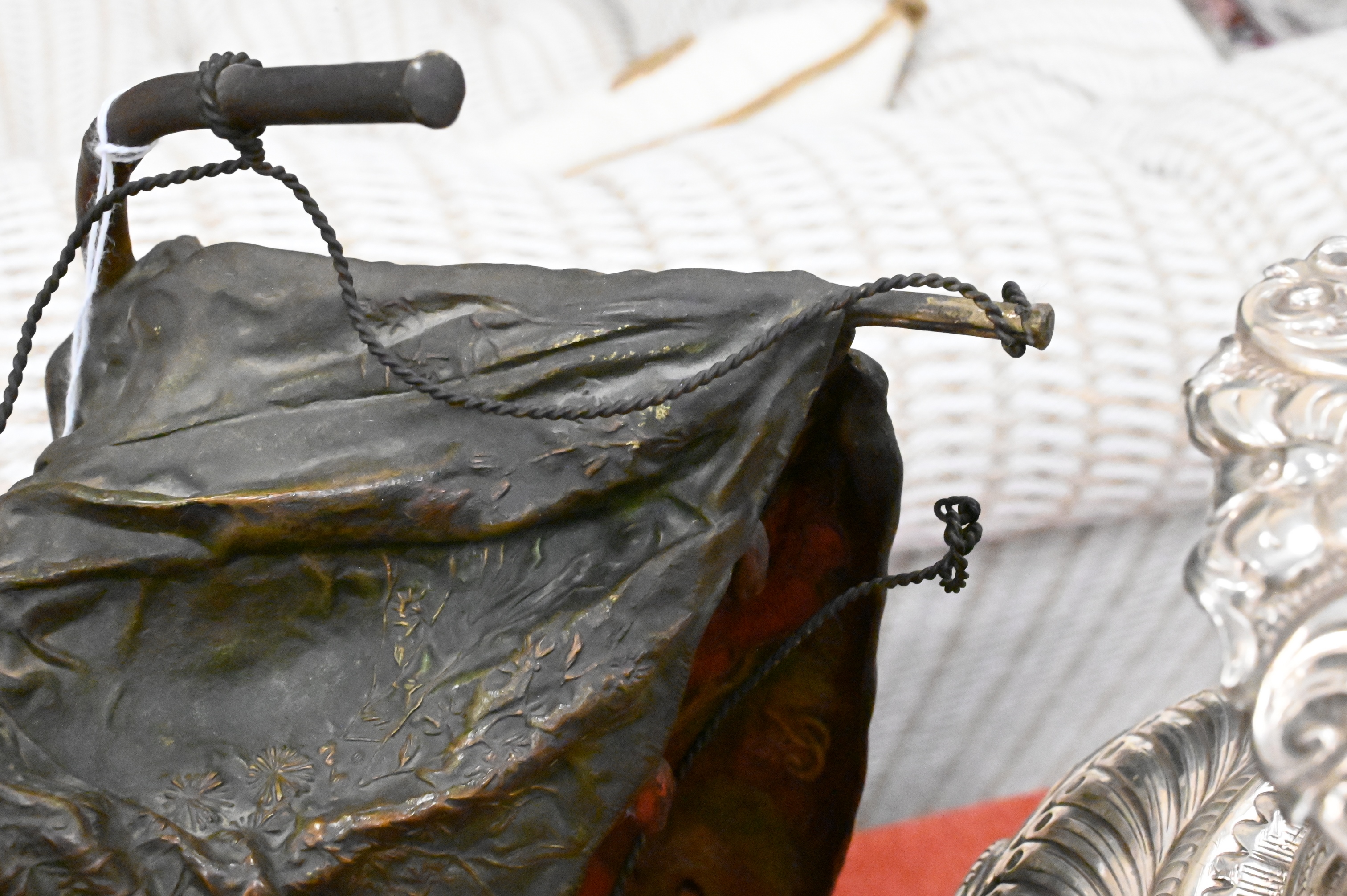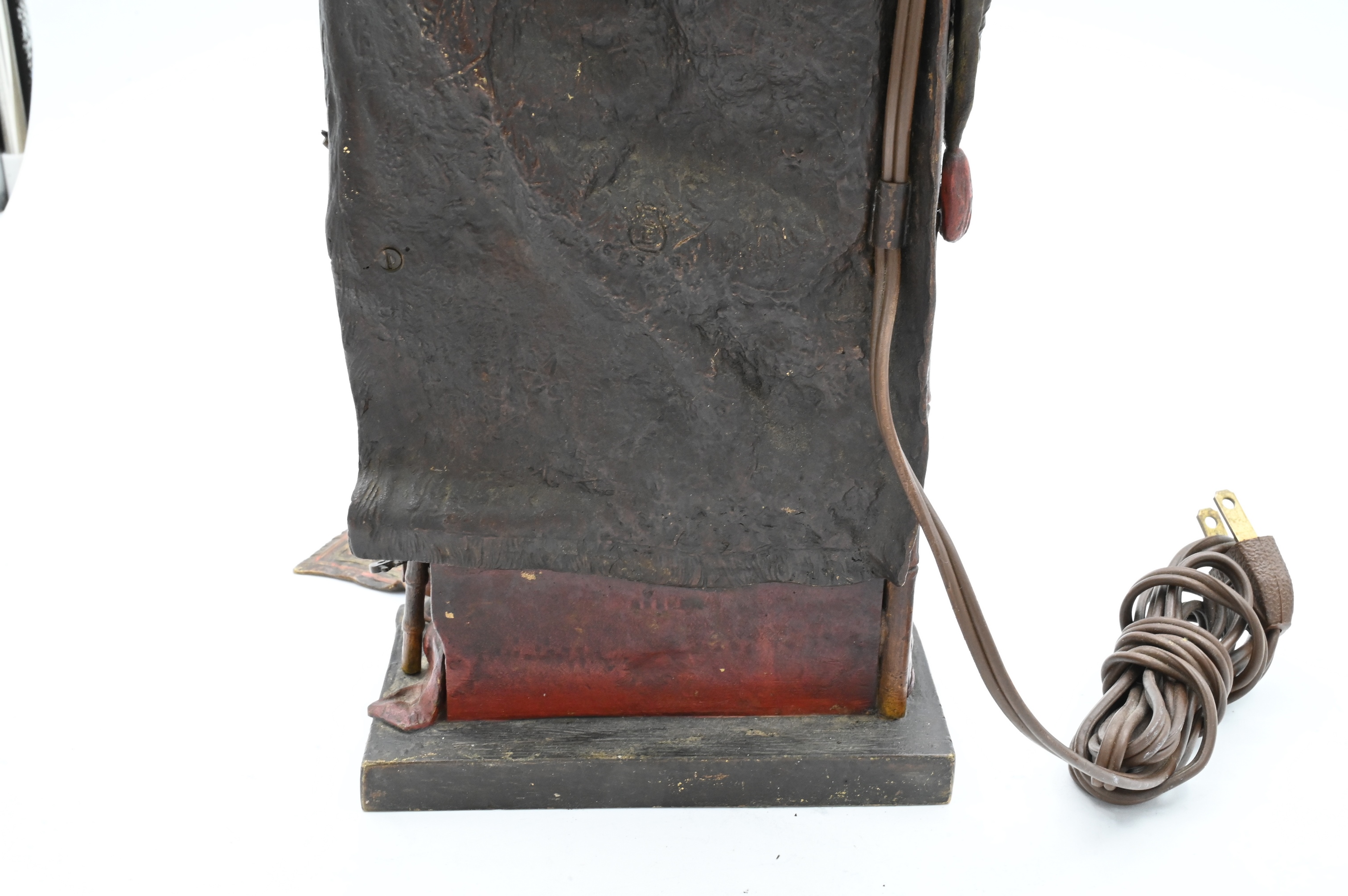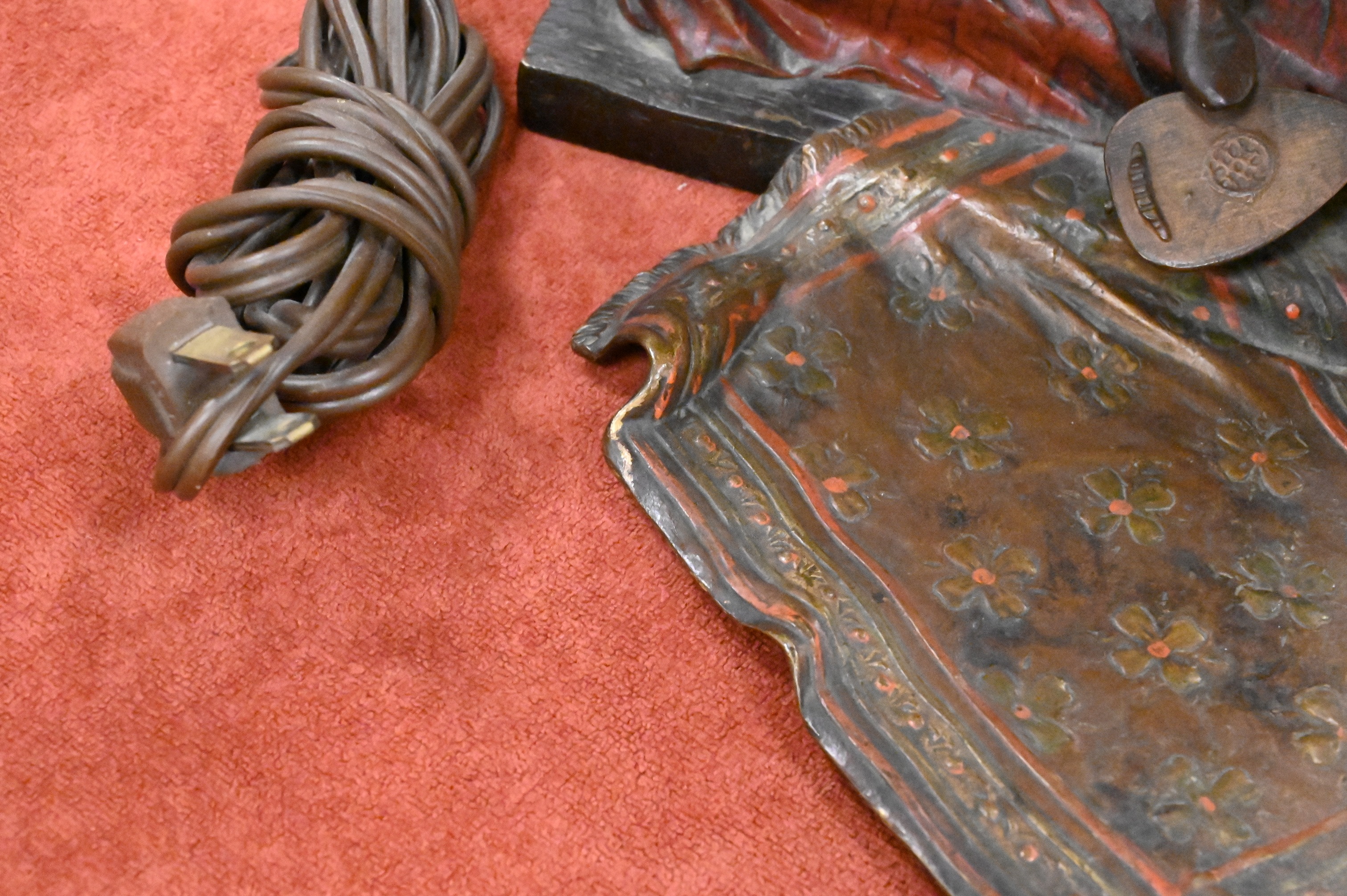 Austrian cold painted bronze lamp of Bedouin guard sitting with his rifle in front of draped floral decorated tent, surrounded with a Persian rug, coffee pot, sitar, weapons, and shield