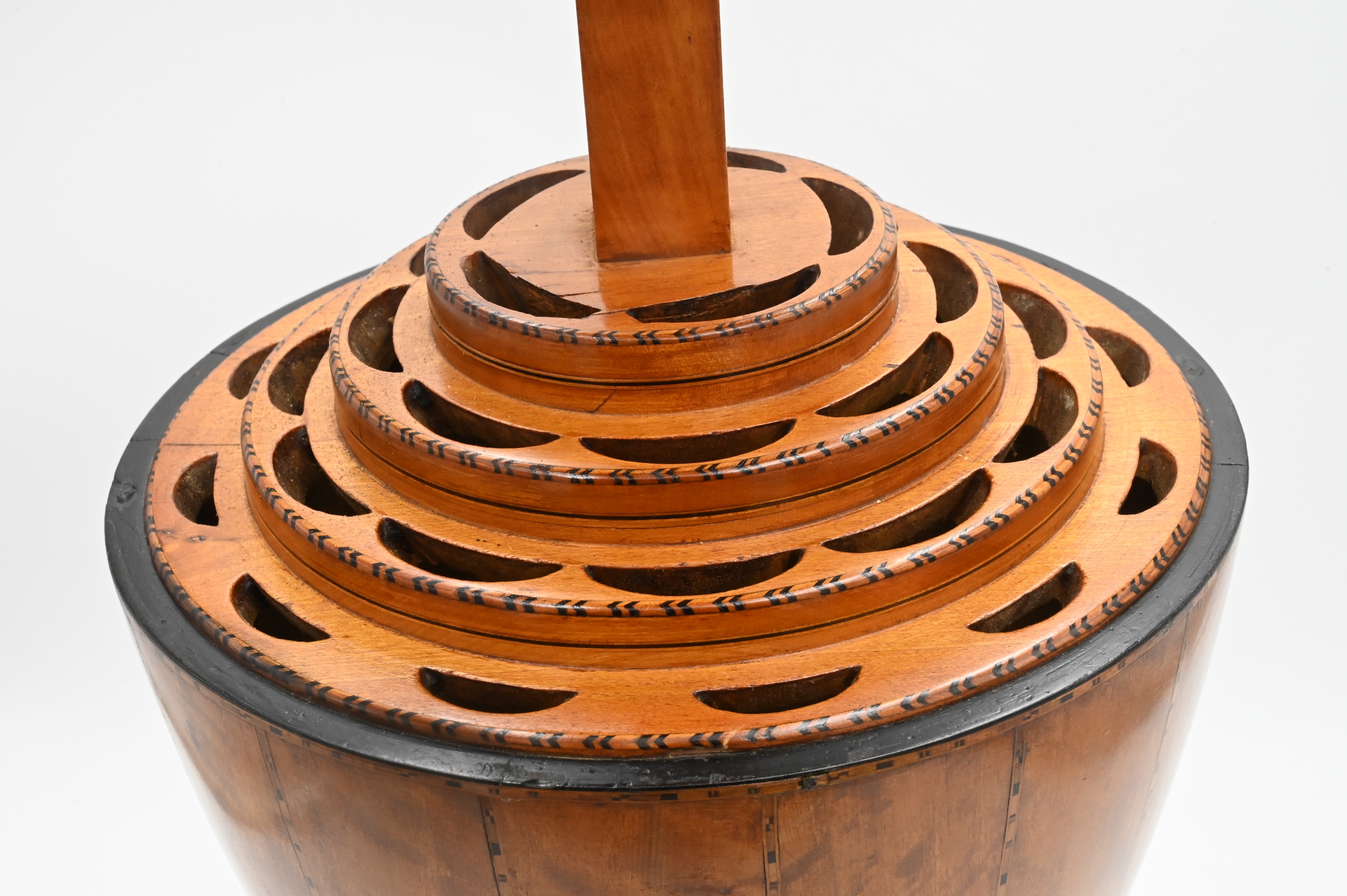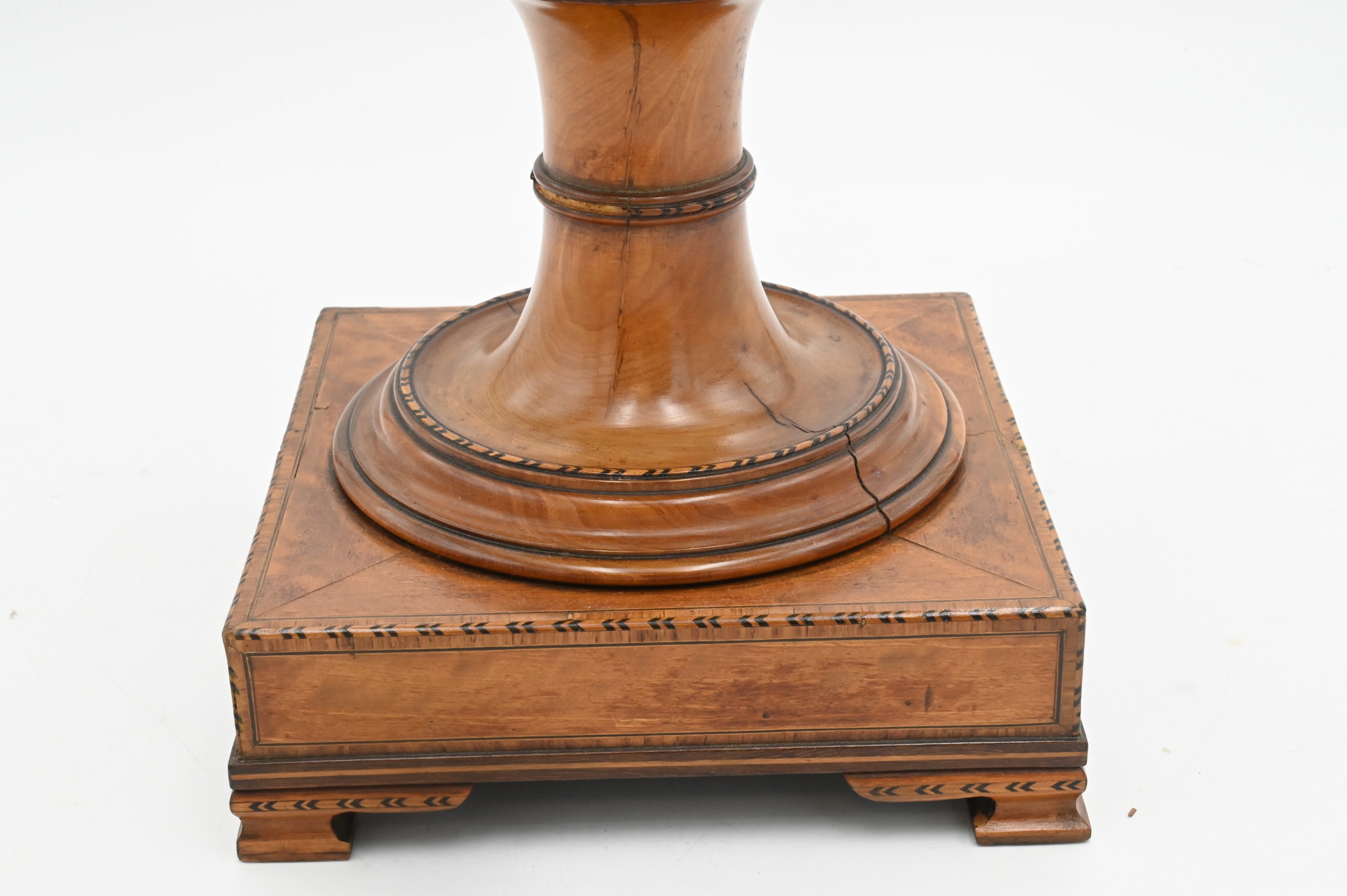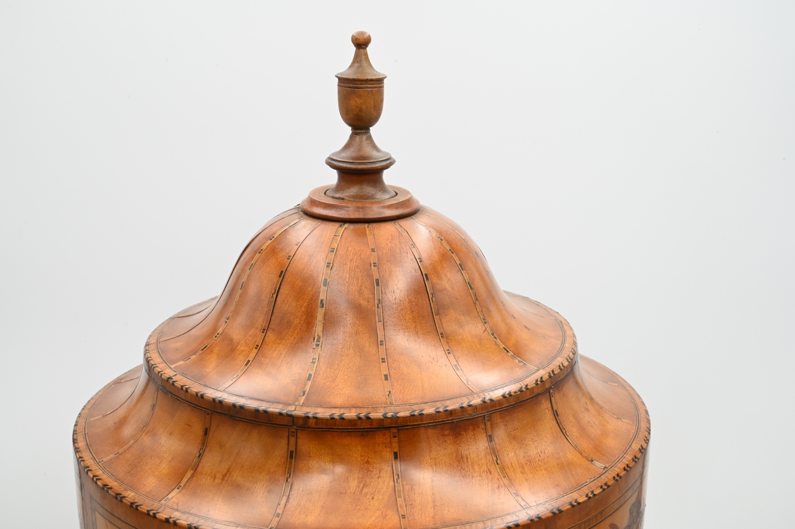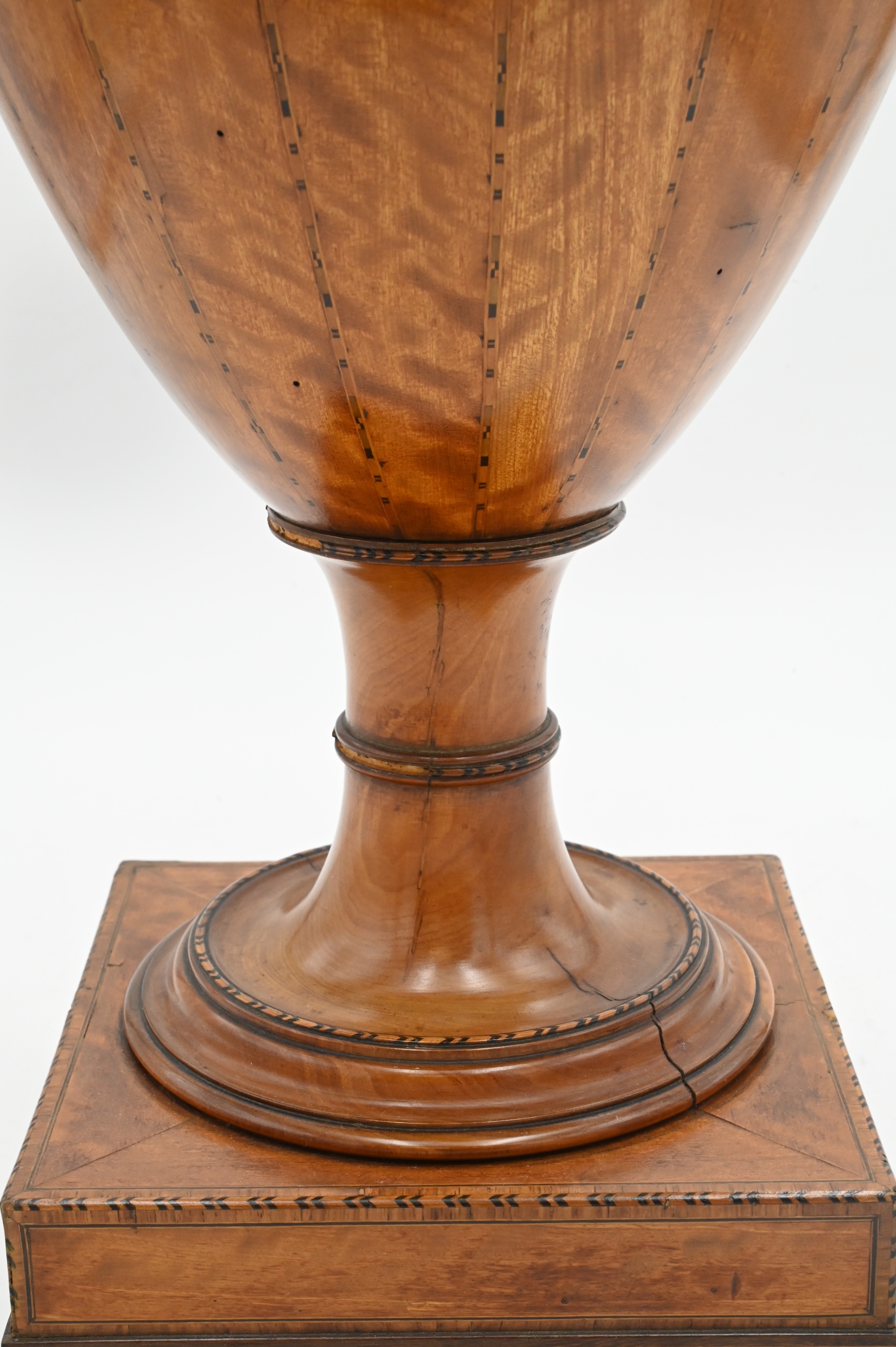 George III Satinwood Inlaid Knife Box, urn form on square base having lift top with fitted interior. Height 25 1/2 inches