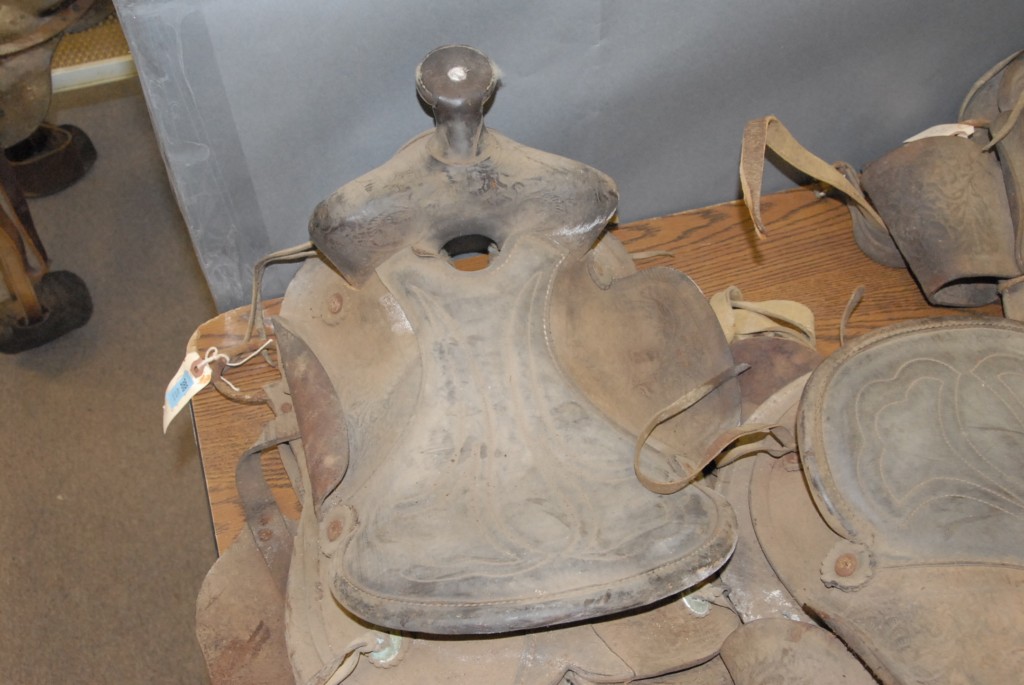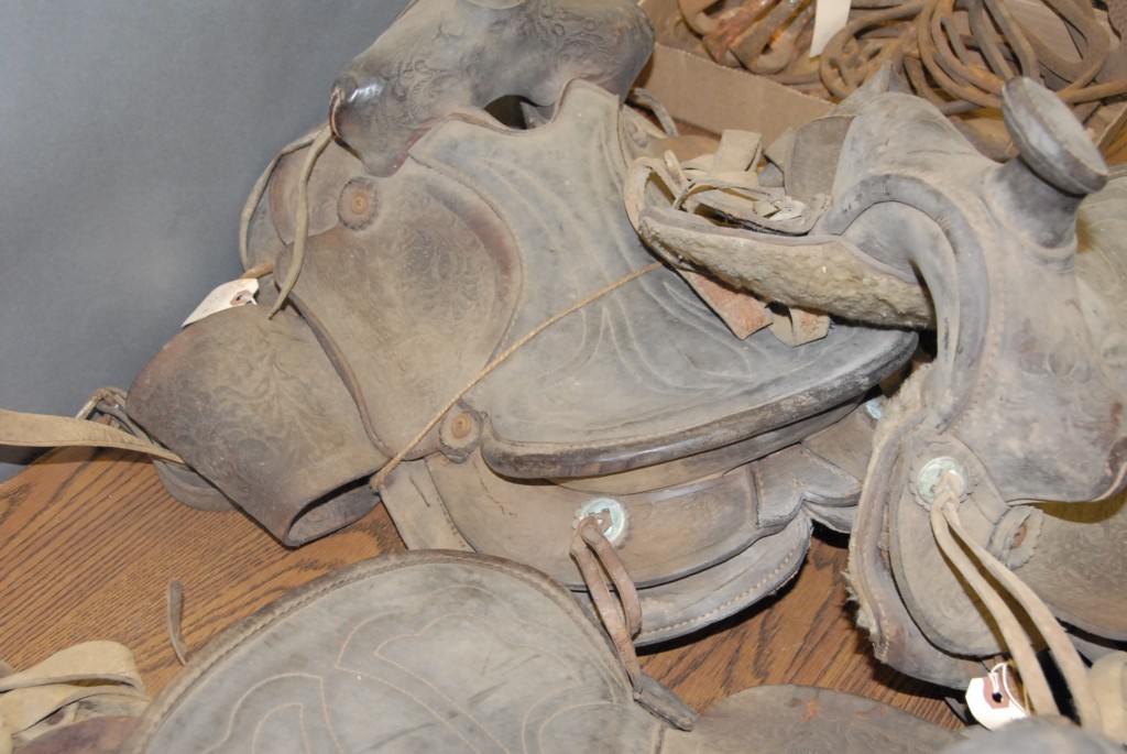 Group of four child’s Western saddles.