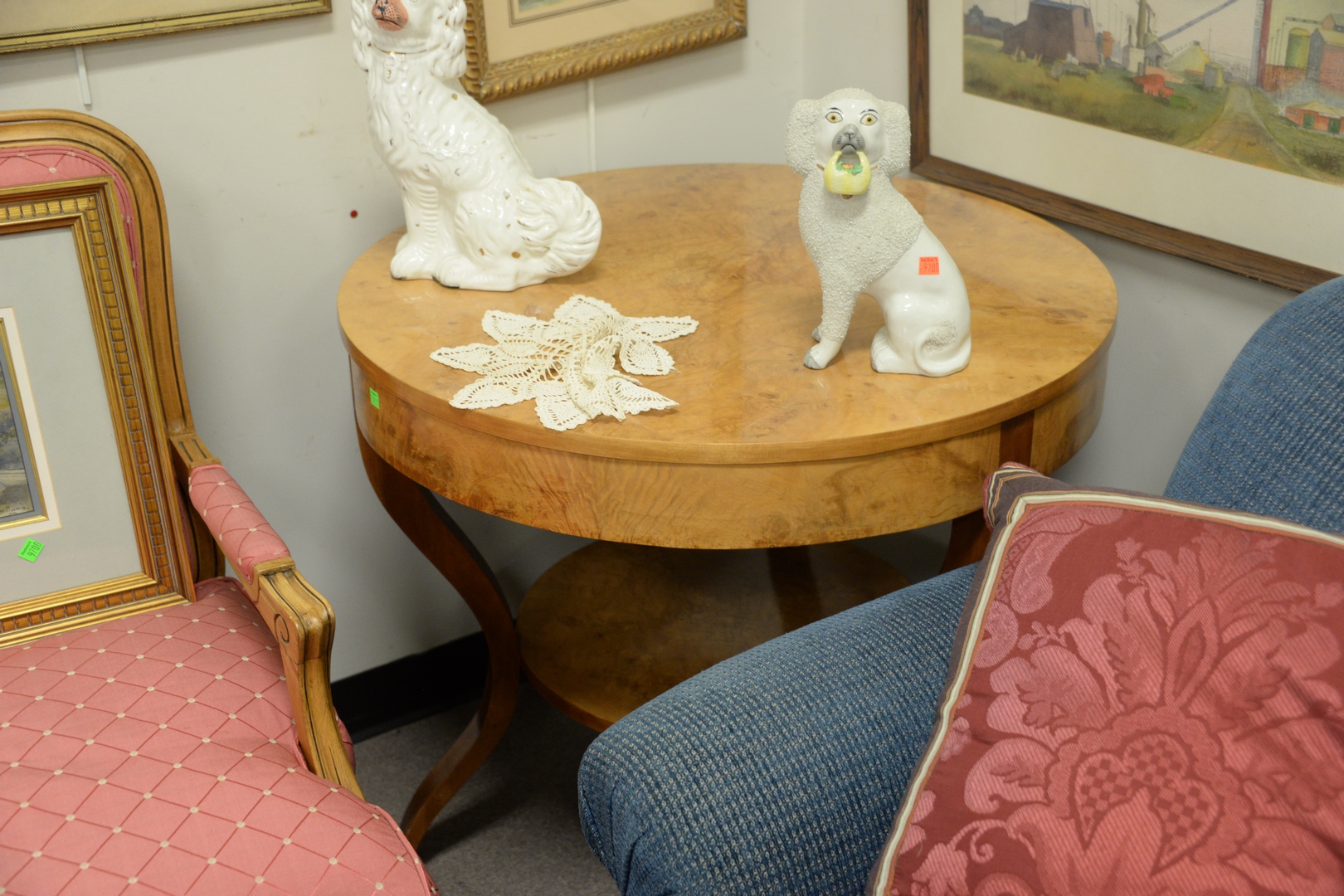 Pair of Contemporary Burlwood Side Tables, height 29 inches, diameter 32 inches.