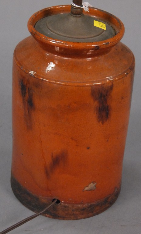 Redware crock made into table lamp drilled. crock ht. 10 1/2in.