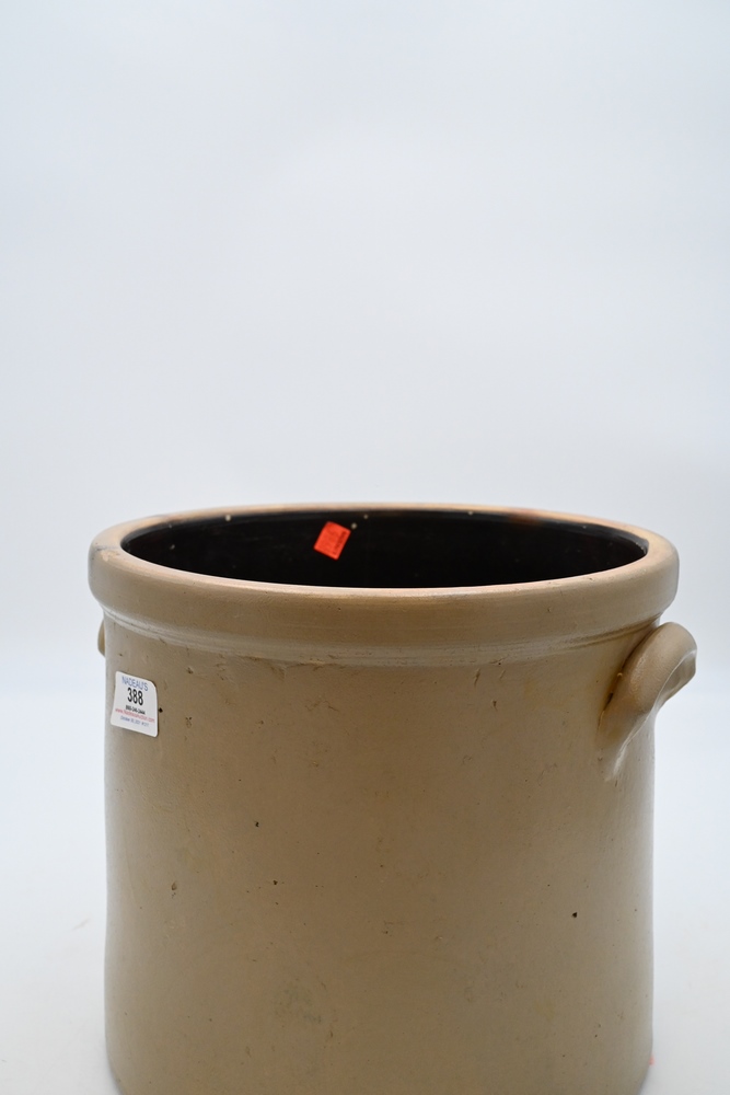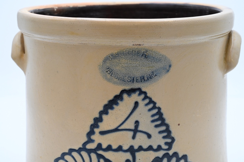 Lot 388: S. Burger Rochester New York Stoneware Crock four gallon having blue flower and two handles height 11 inches Provenance: Estate of Bruce Sasalla, East Hartford, Connecticut.