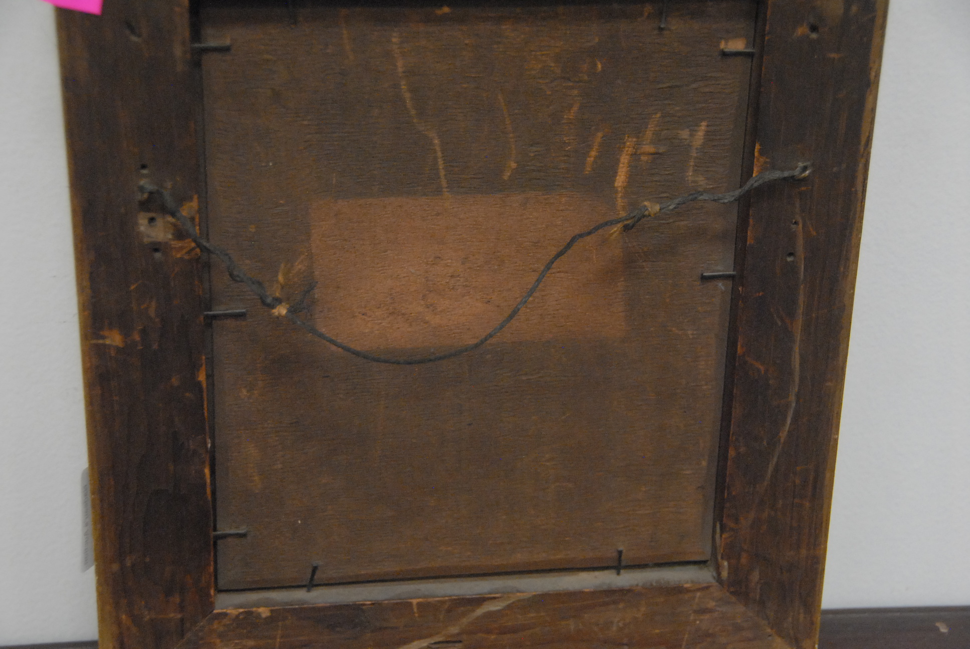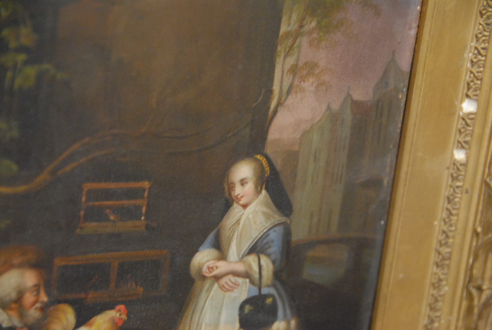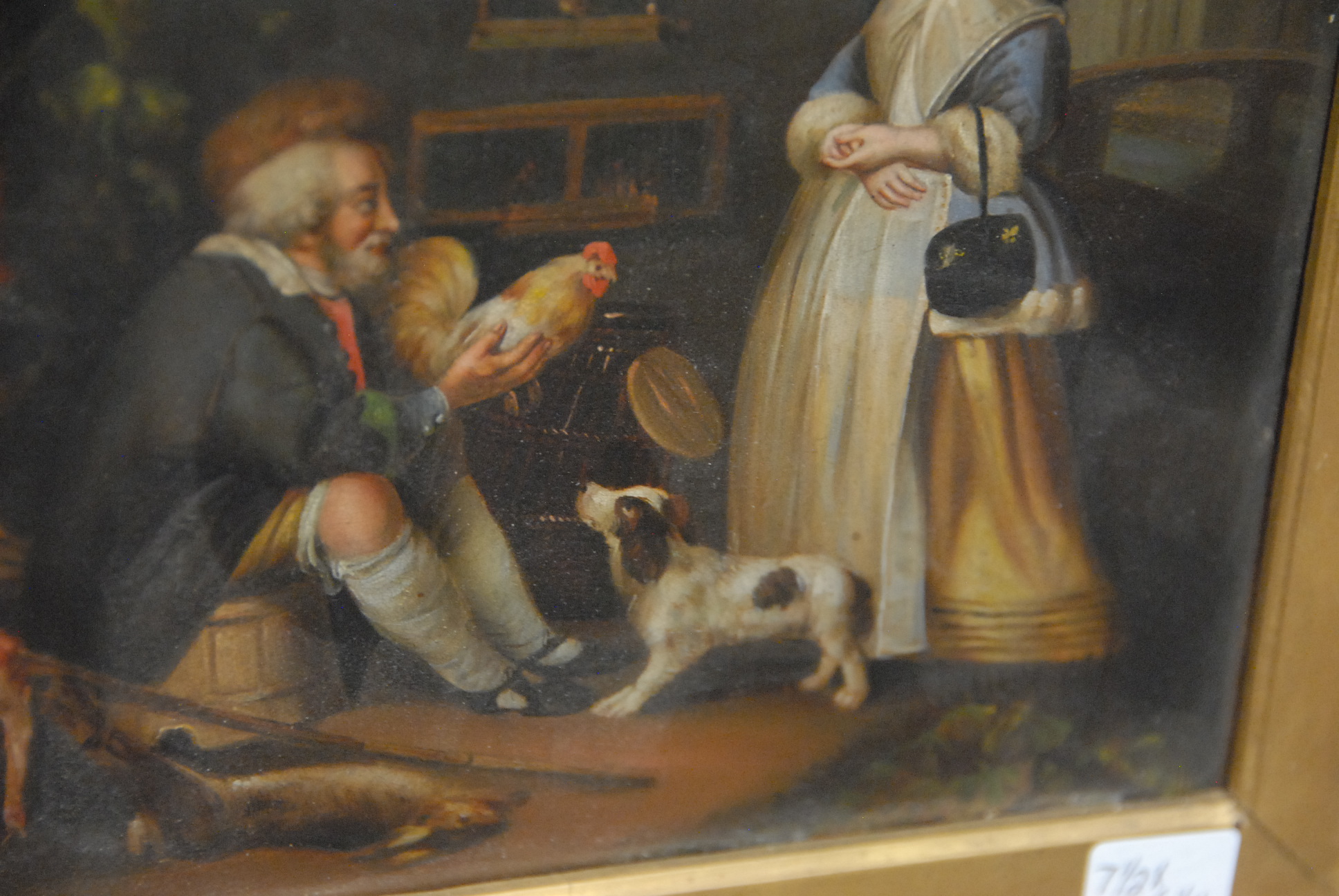 19th Century painting HUNTERS OFFERING OF A CHICKEN oil on tin 7 1/2 x 6 1/4