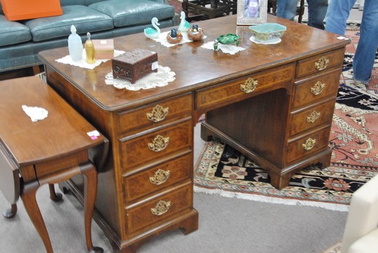 Baker kneehole desk with burlwood top and drawer fronts. ht. 30 in. top: 28 x 54