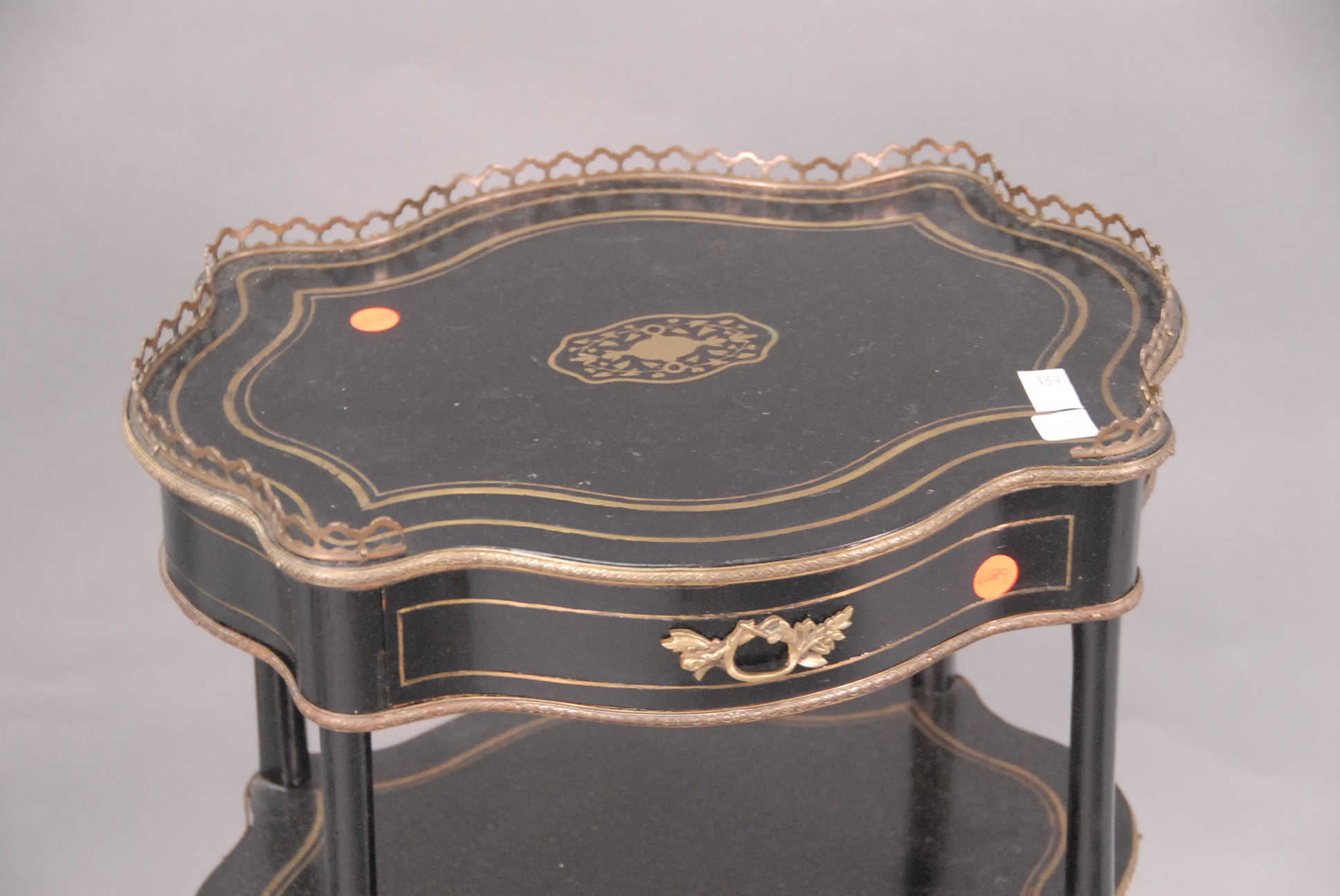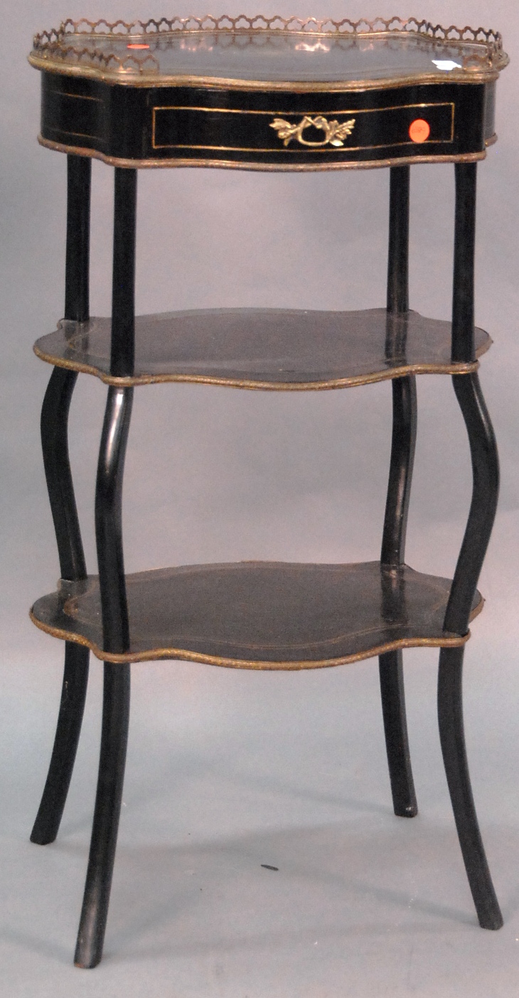 Brass inlaid black lacquered three tier French stand with one drawer.