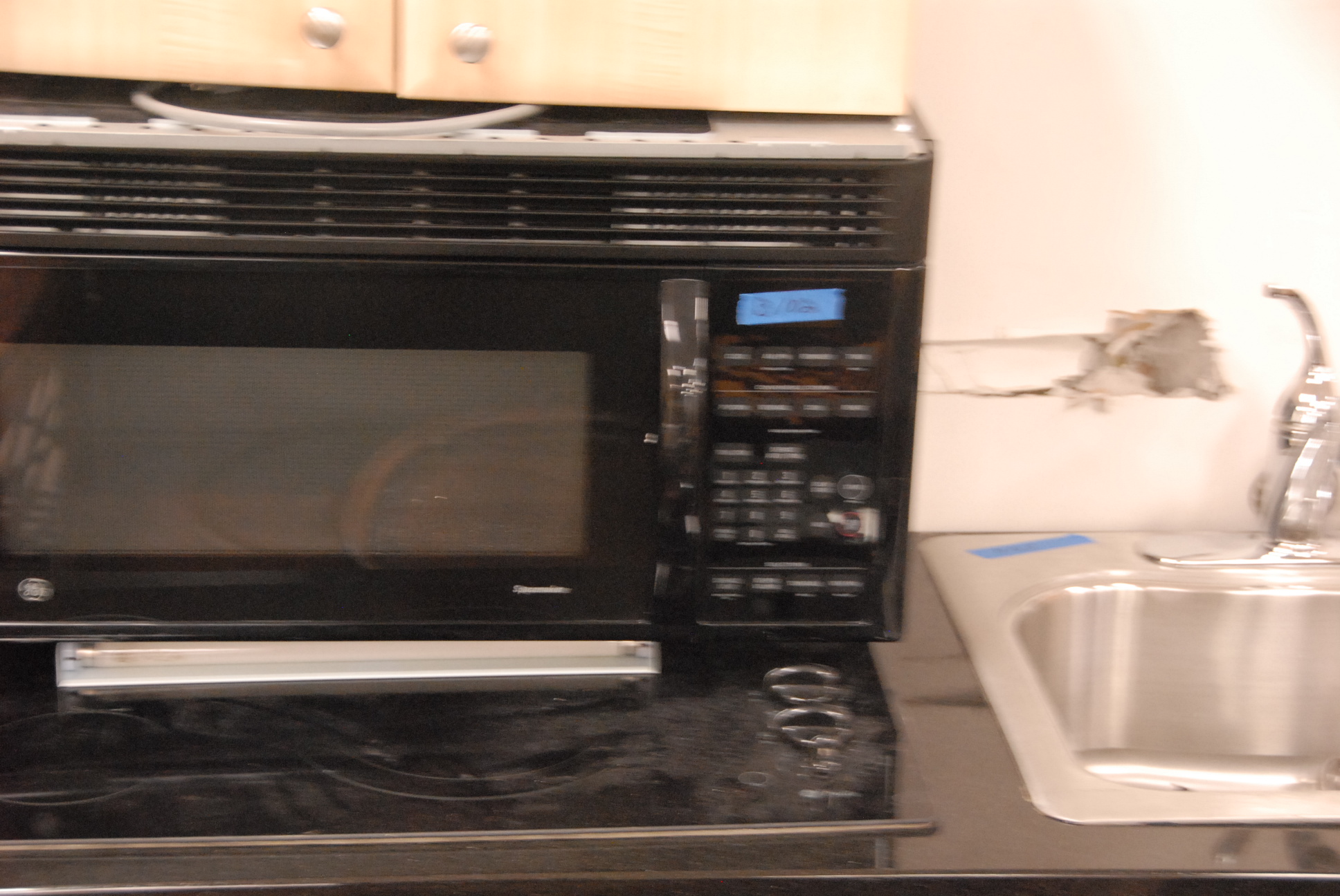 Custom kitchen set having granite tops, seven kitchen cabinets with hardware, stainless sink with faucet, GE profile stove top, GE wall mount microwave and side panels for refrigerator.