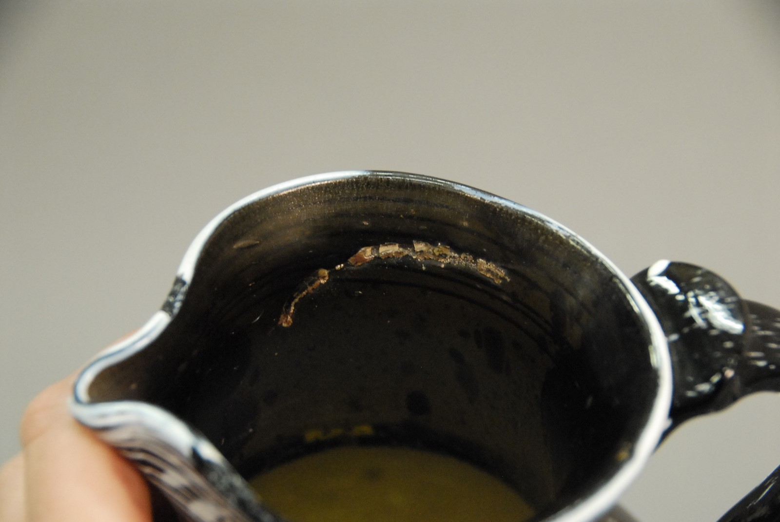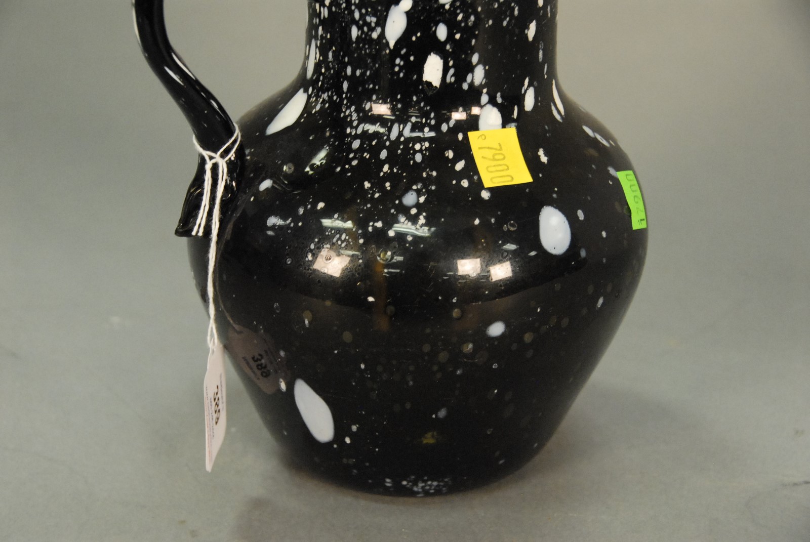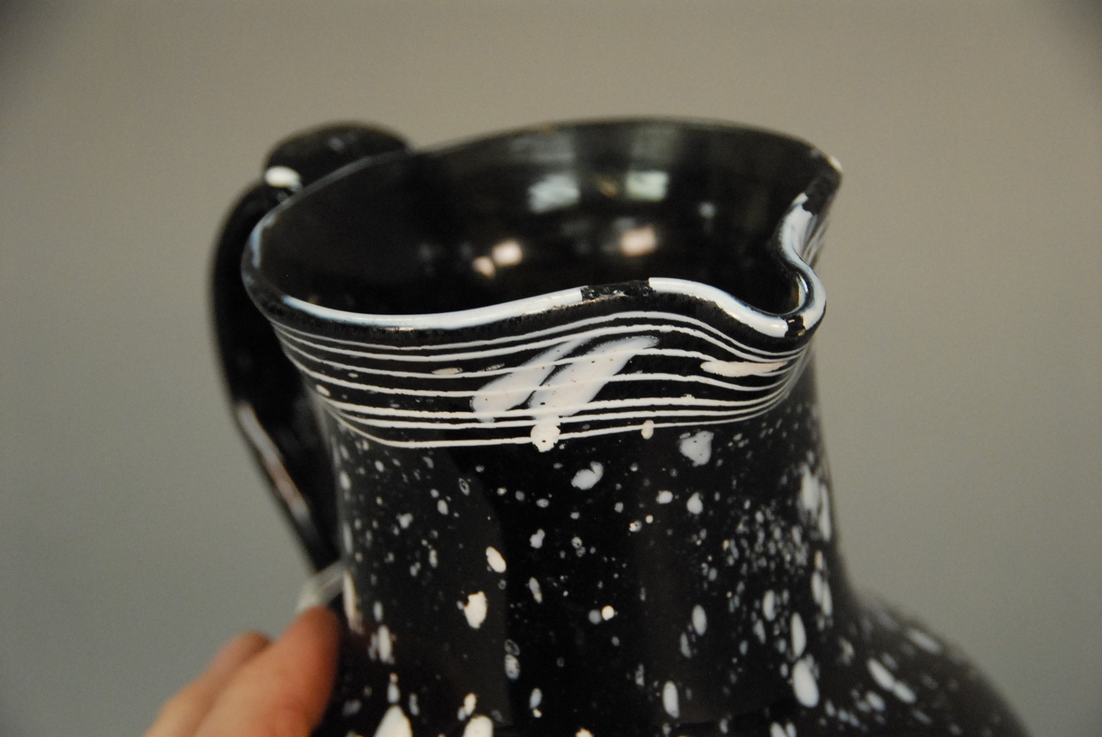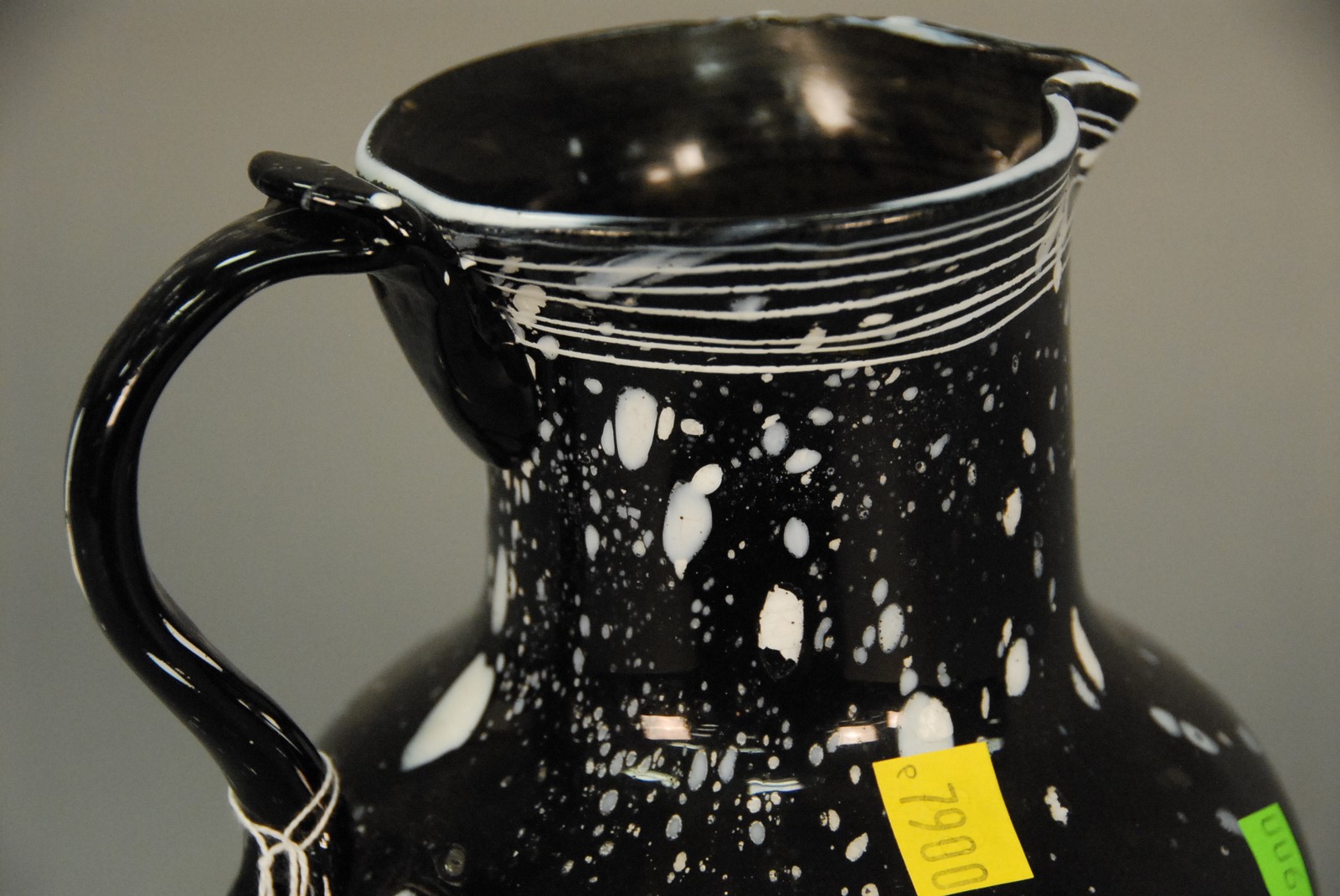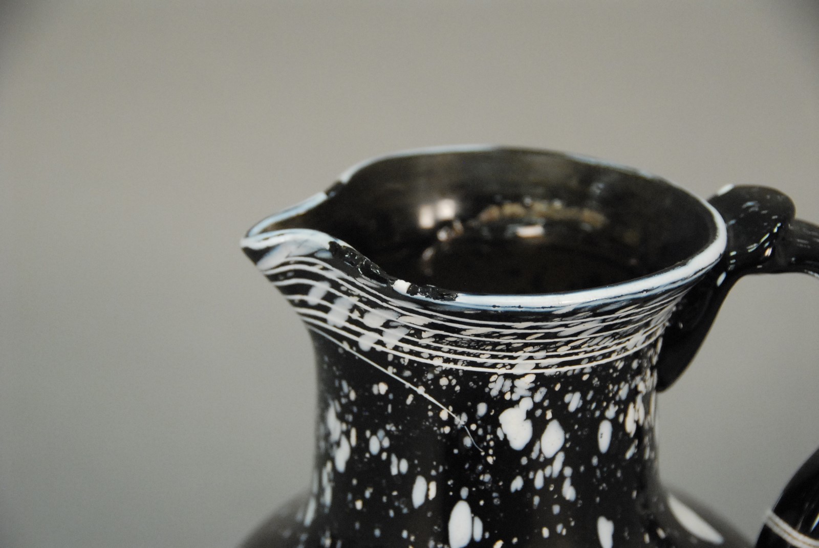 Early dark green blown pitcher, 18th or early 19th century with white twist, spots having applied handle. ht. 8 1/2 in. Provenance: Property from a Private Collection Sold for the Benefit of the Virginia Historical Society.