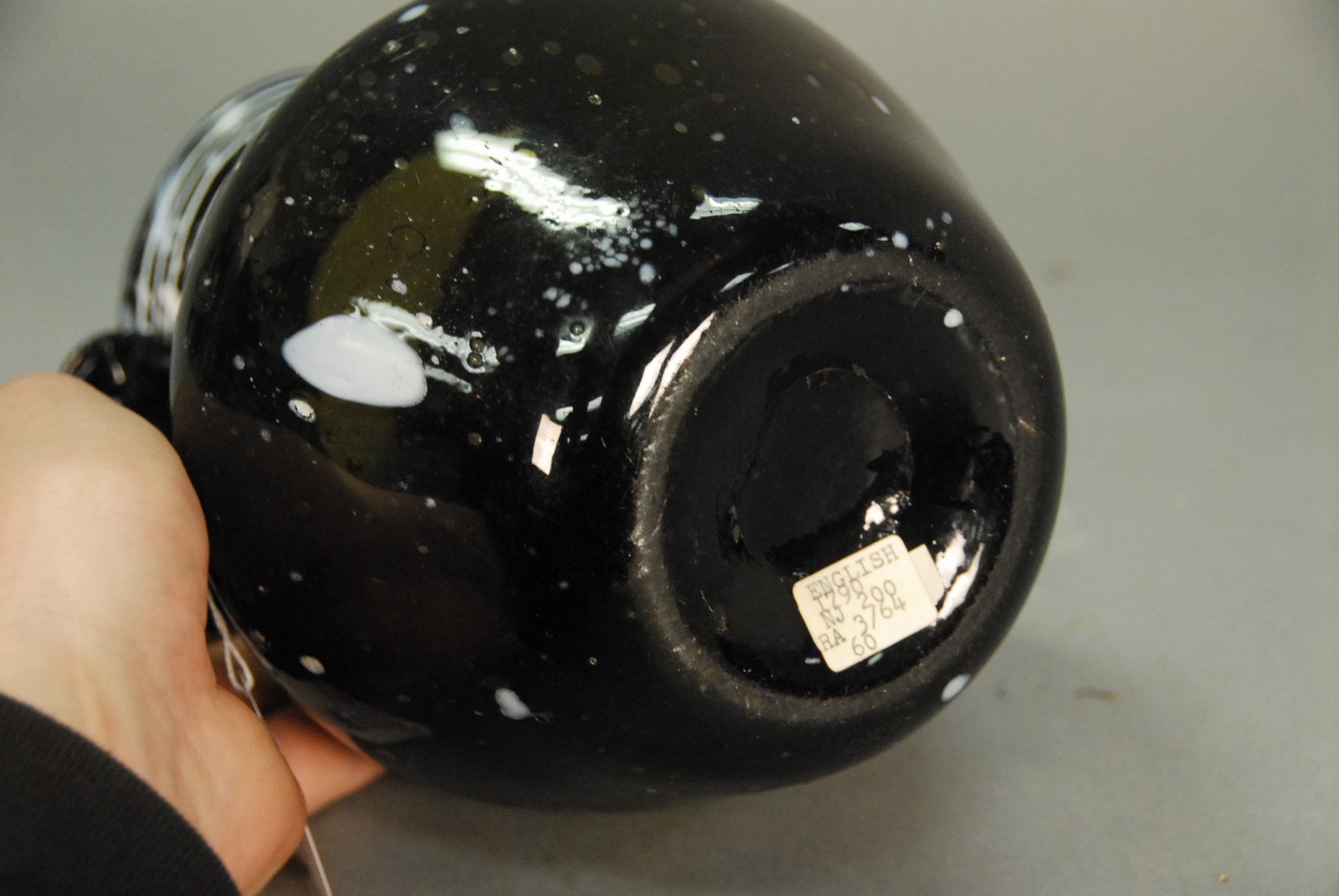 Lot 389: Early dark green blown pitcher, 18th or early 19th century with white twist, spots having applied handle. ht. 8 1/2 in. Provenance: Property from a Private Collection Sold for the Benefit of the Virginia Historical Society.