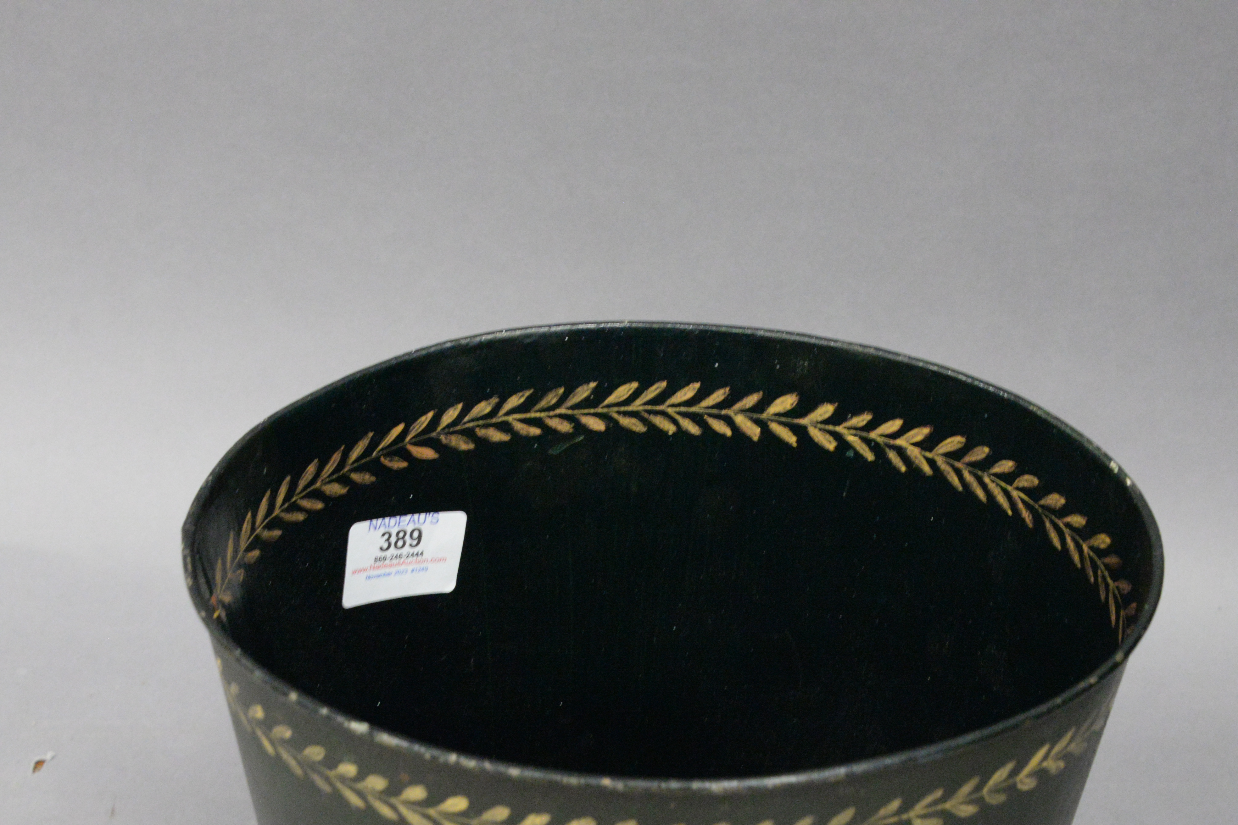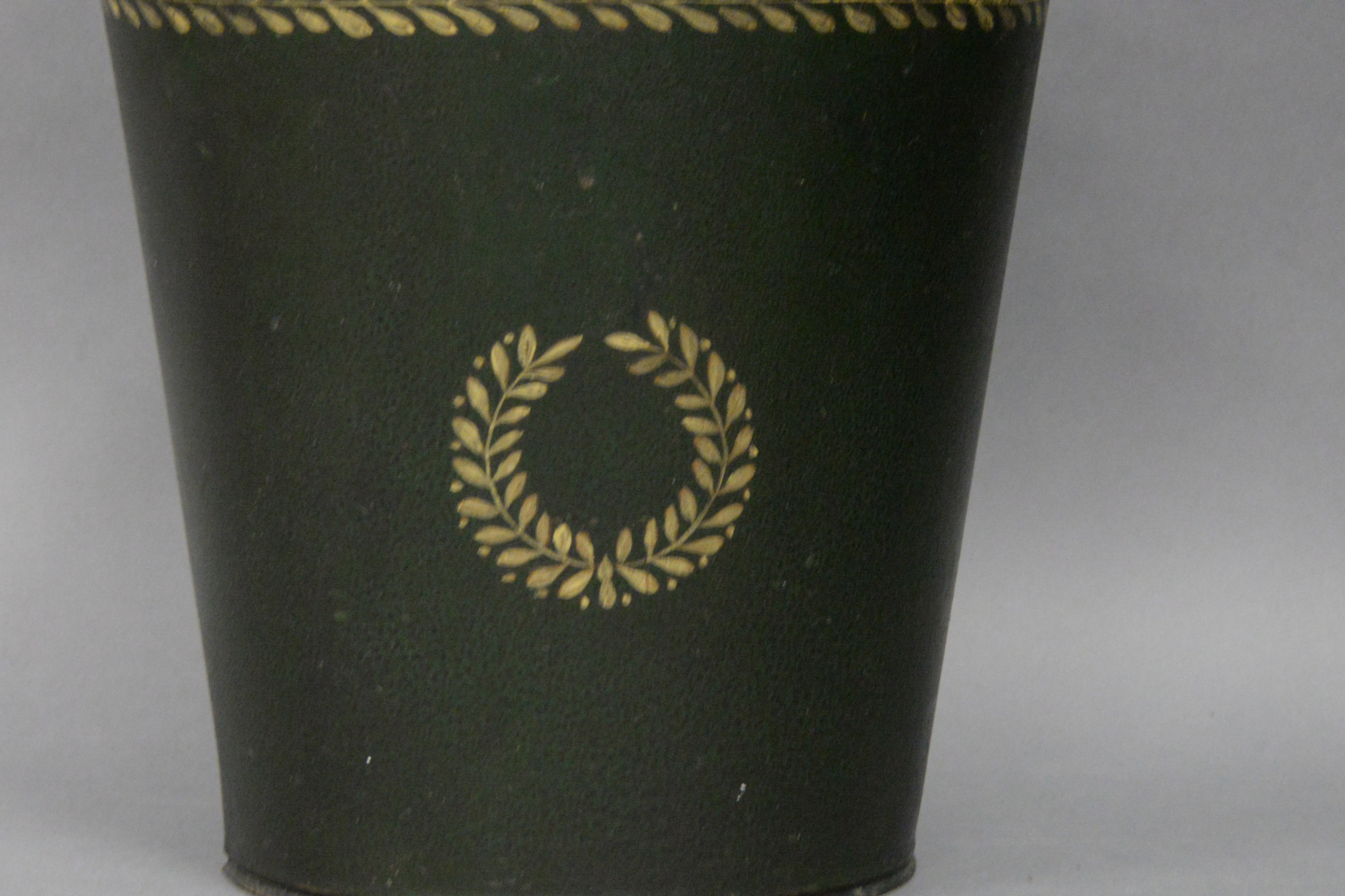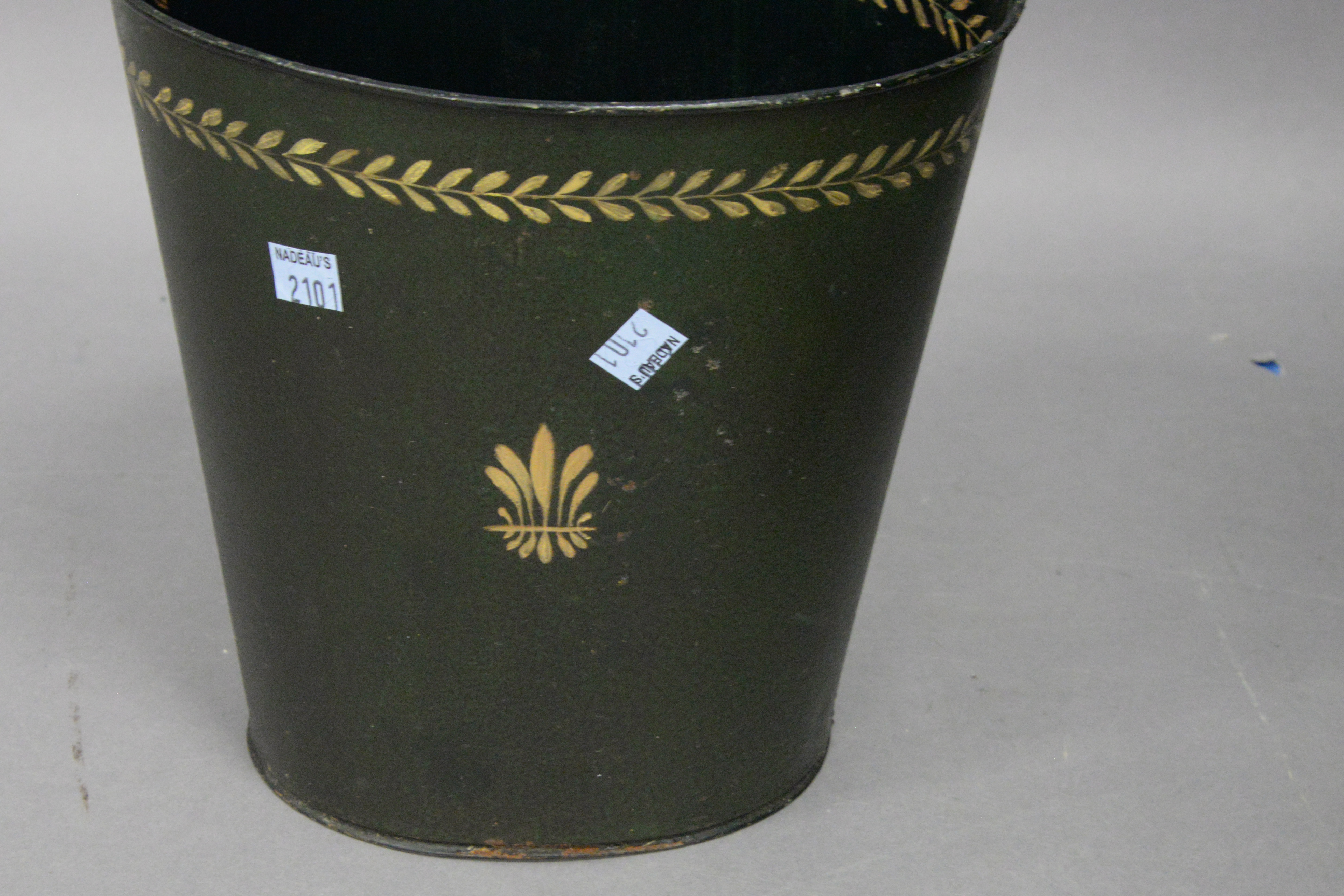 Lot 389: Green Tole and Gilt Laurel Decorated Waste Bin
