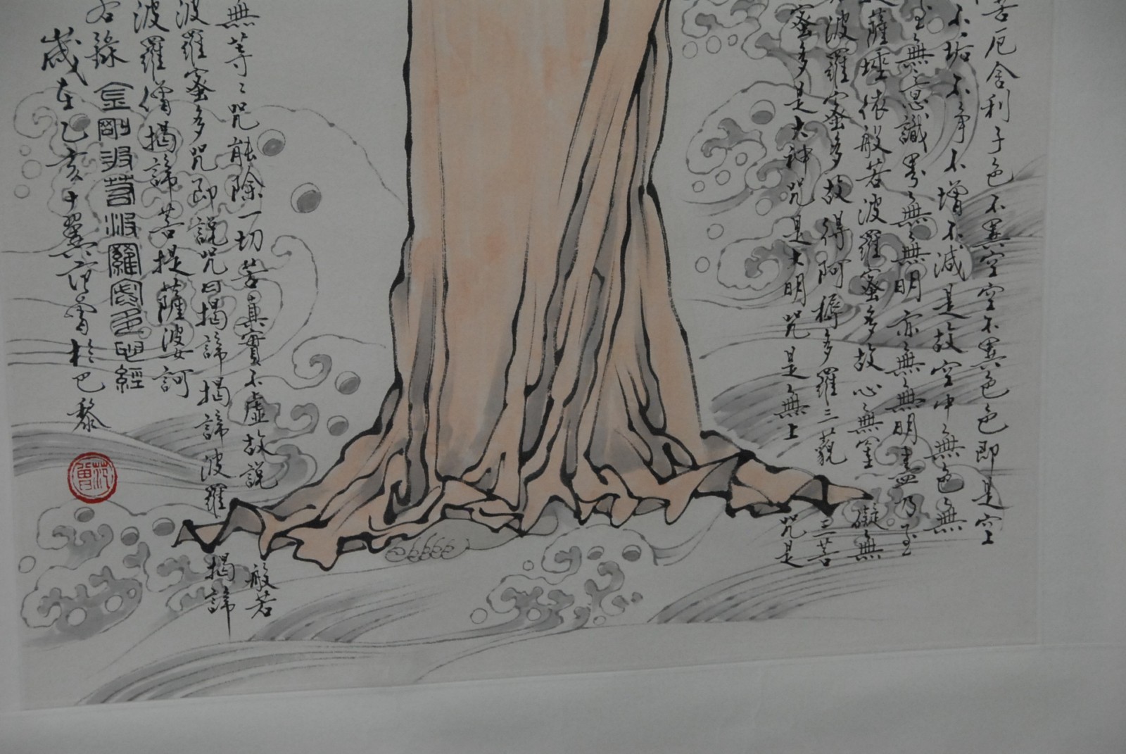 Large painting of Guan Yin Buddha, on silk, by signed Fang Zeng.