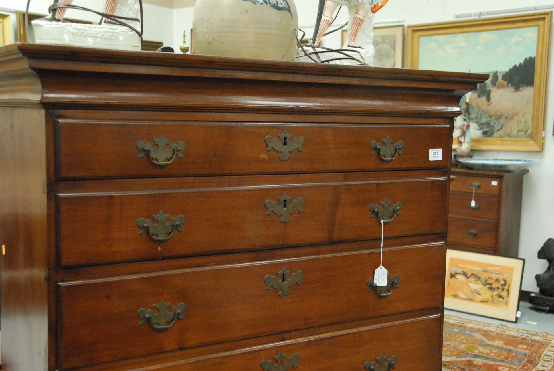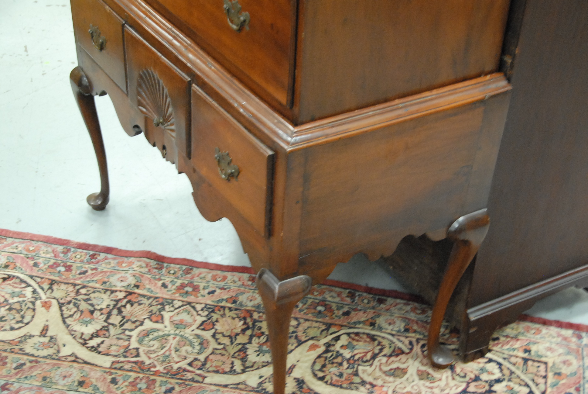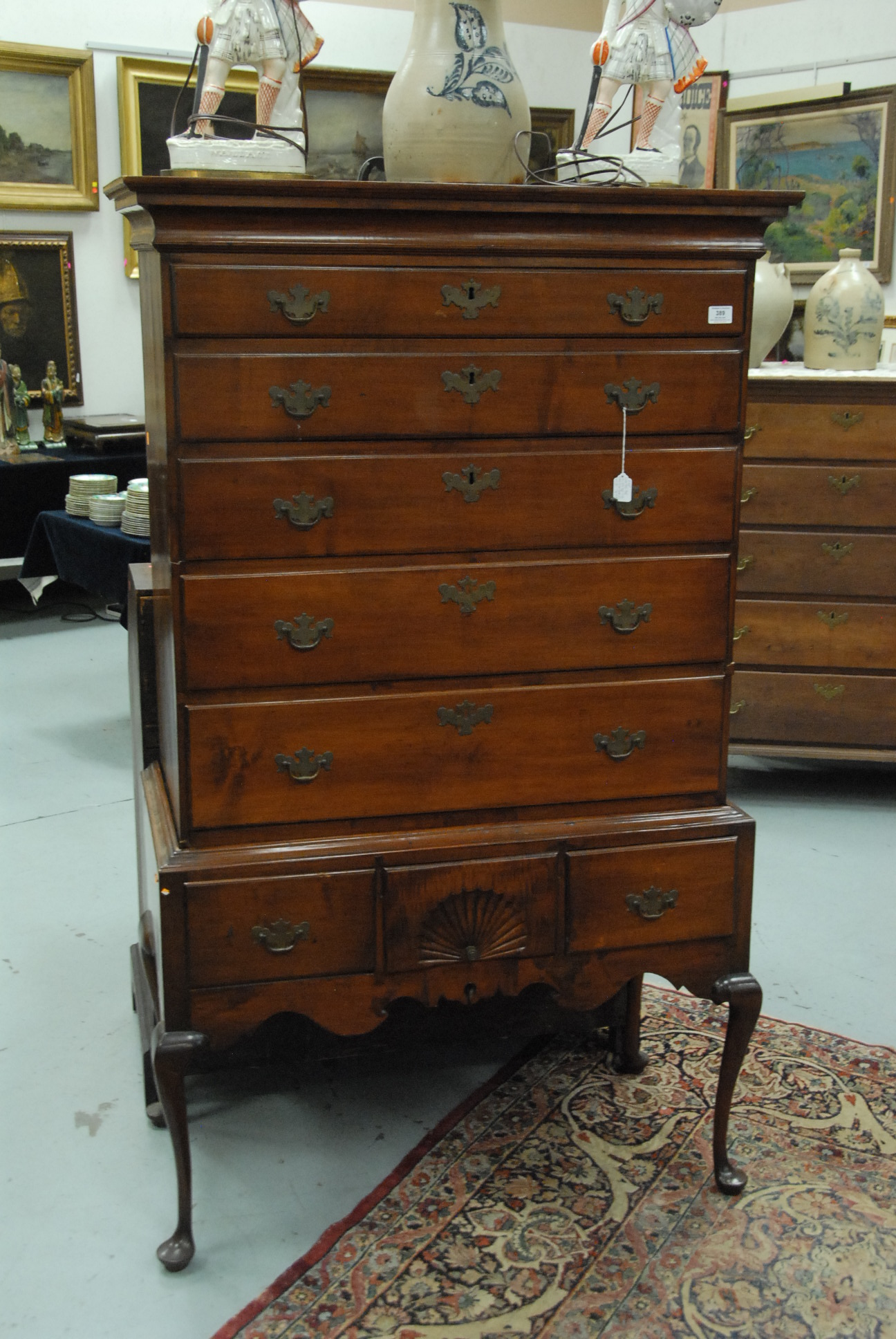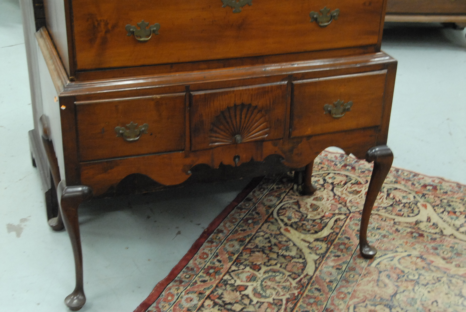 Lot 389: Queen Anne cherry high chest in two parts, upper section with large cornice molding over five graduated drawers on lower case with three short drawers having scalloped skirt all set on cabriole legs ending in pad feet with original brasses, 18th cent