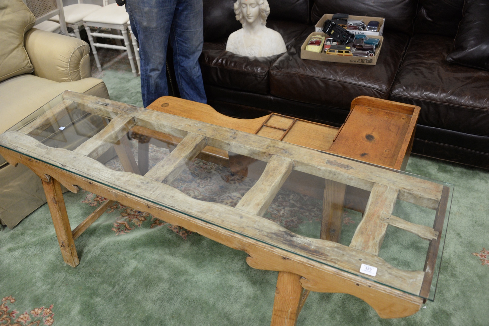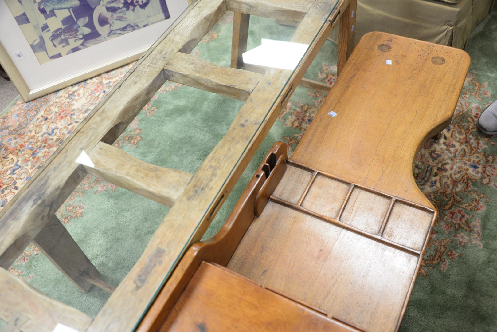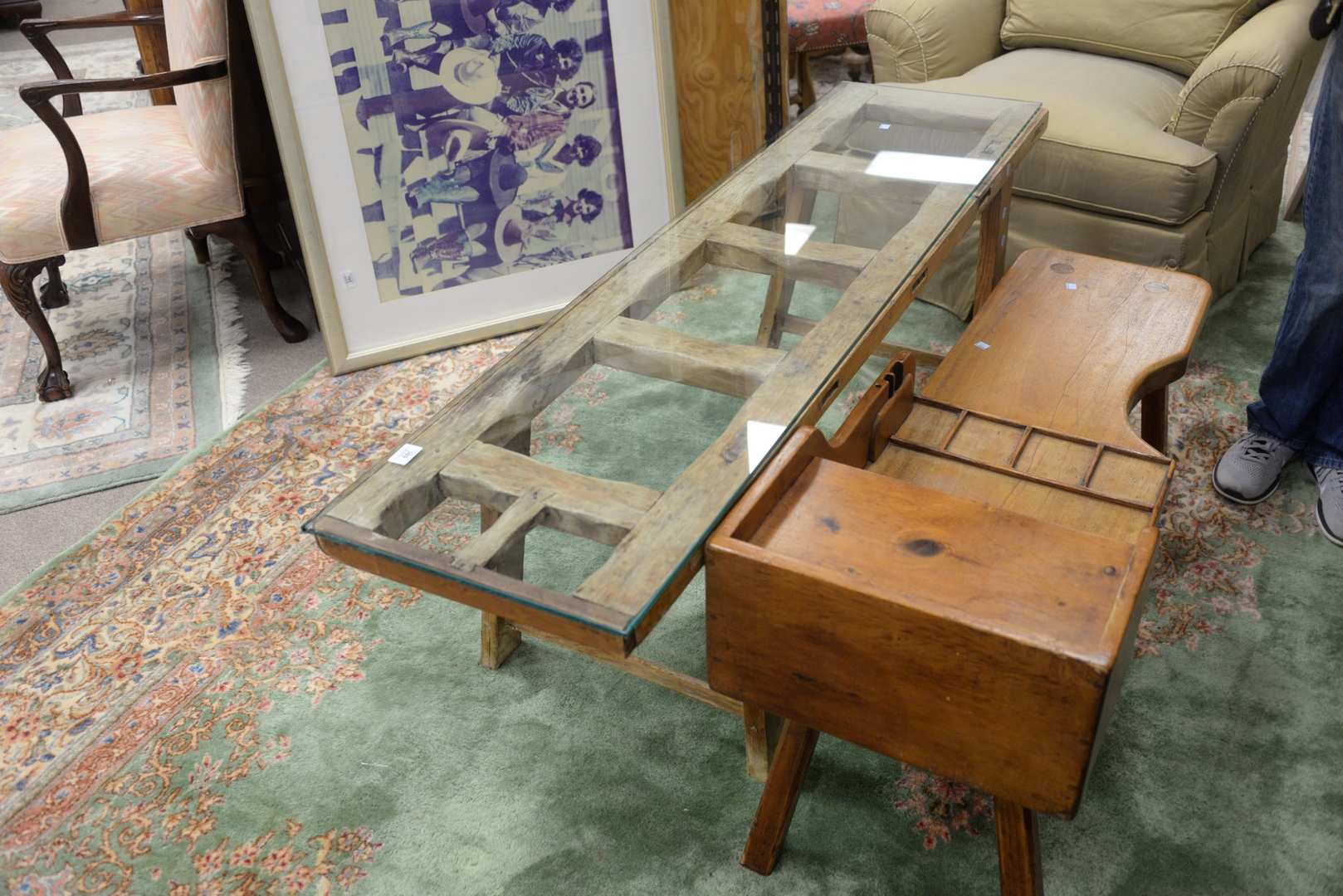 Lot 389: Three Piece Lot to include two coffee tables, one made from a cobbler’s bench, length 49 inches; the other having glass top, length 65 inches, along with large collage of 1970s and 1980s New Yorker Cover reproductions, framed together.
