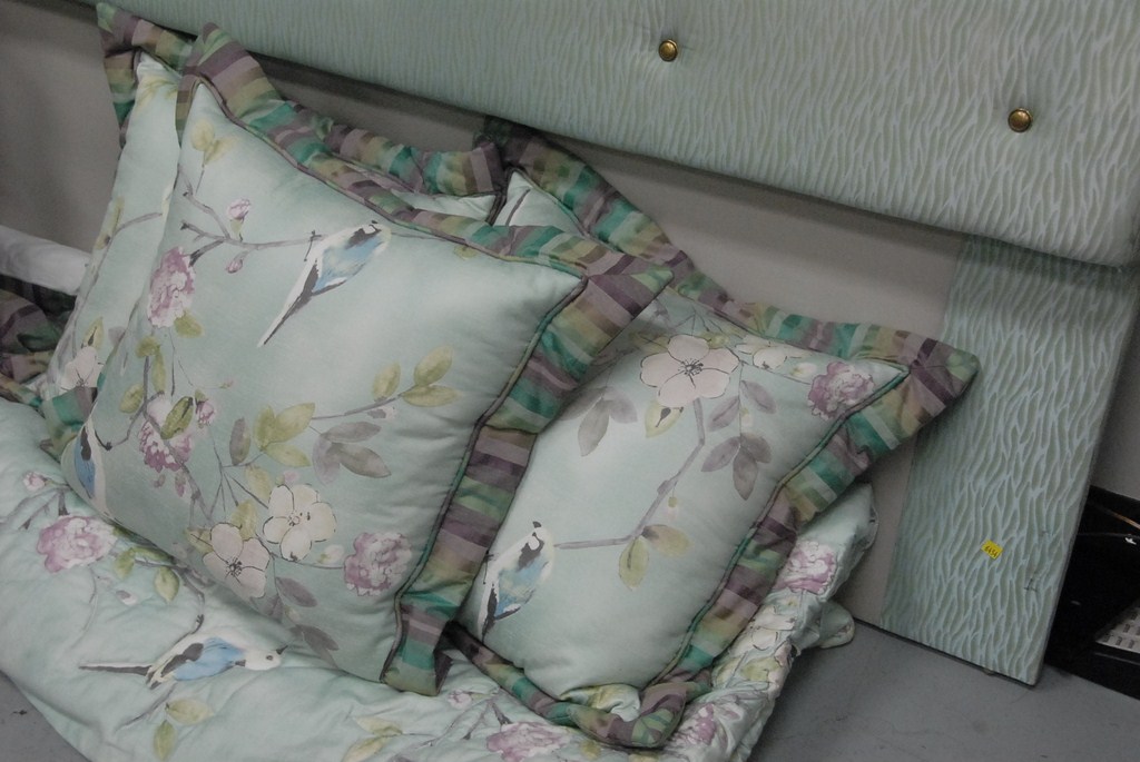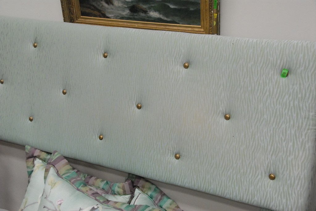 Upholstered custom king sized headboard along with decorative comforter and pillows.