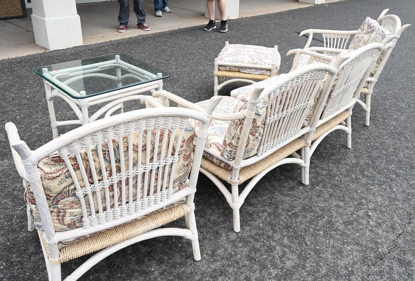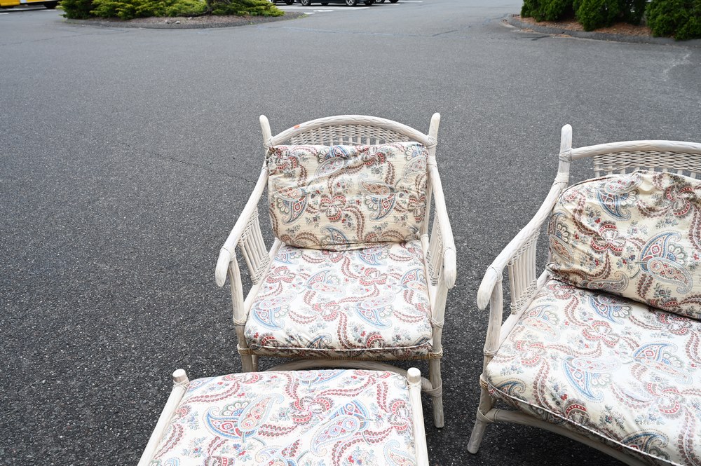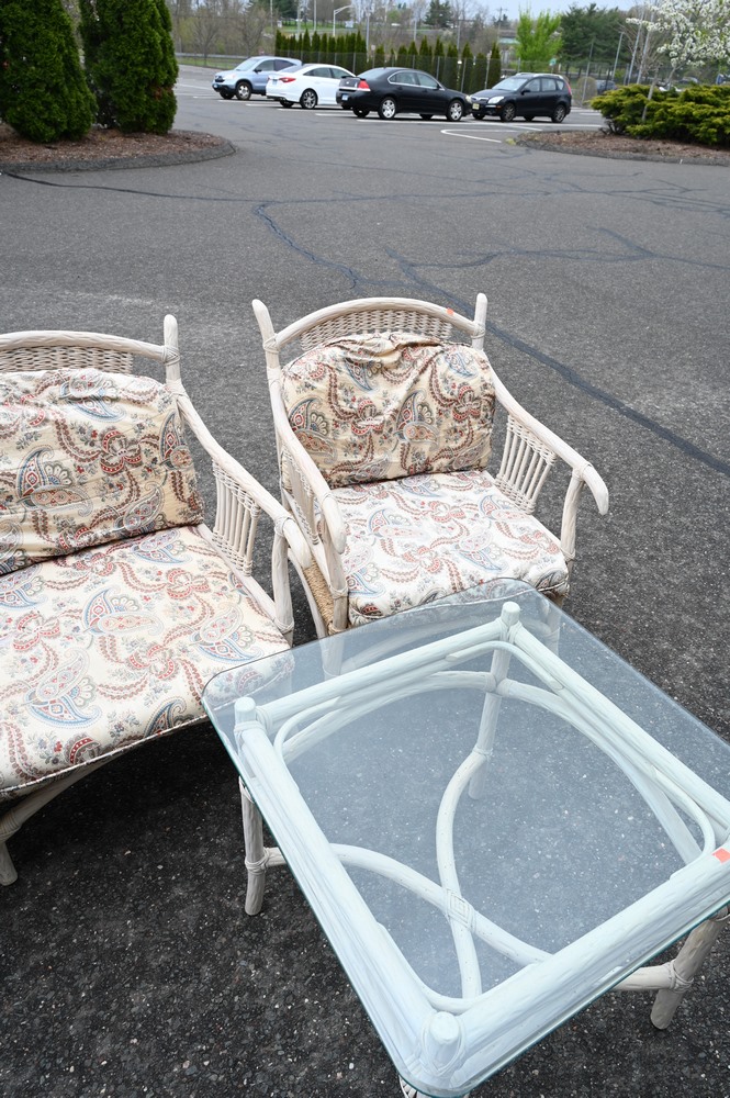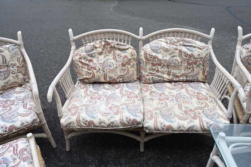 Lot 38A: Five Piece Outdoor Lot, to include a loveseat, pair of armchairs, ans ottoman, all having cushions and rush seats; along with a glass top side table, loveseat length 53 inches.