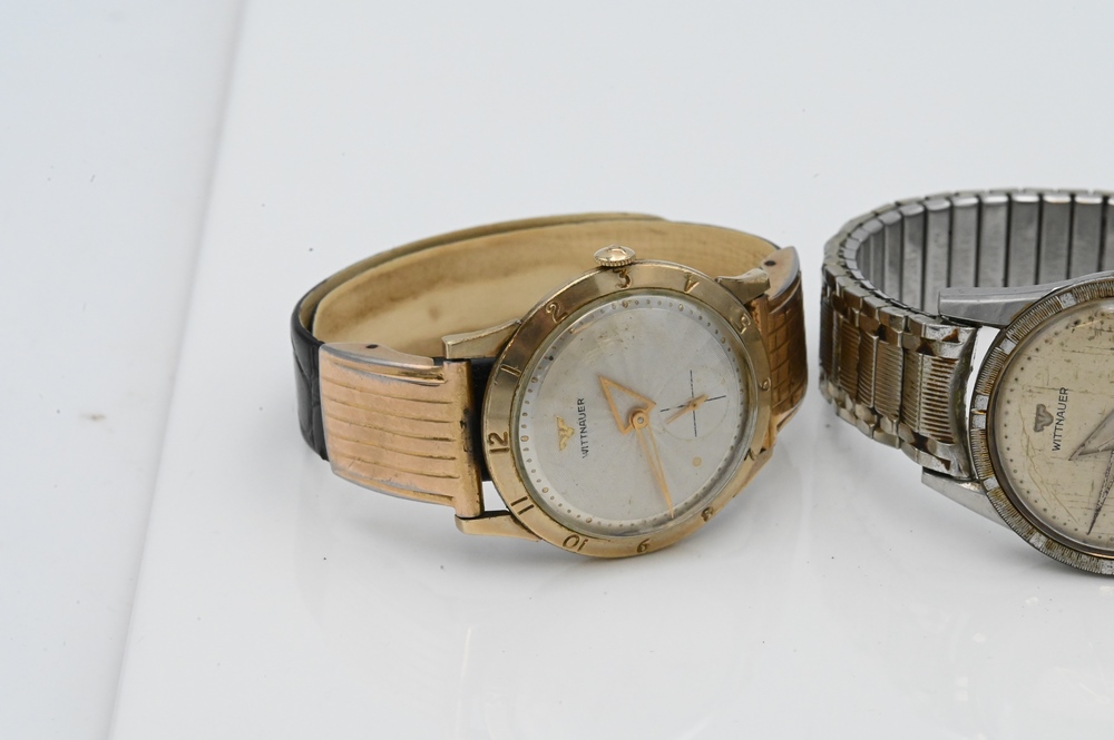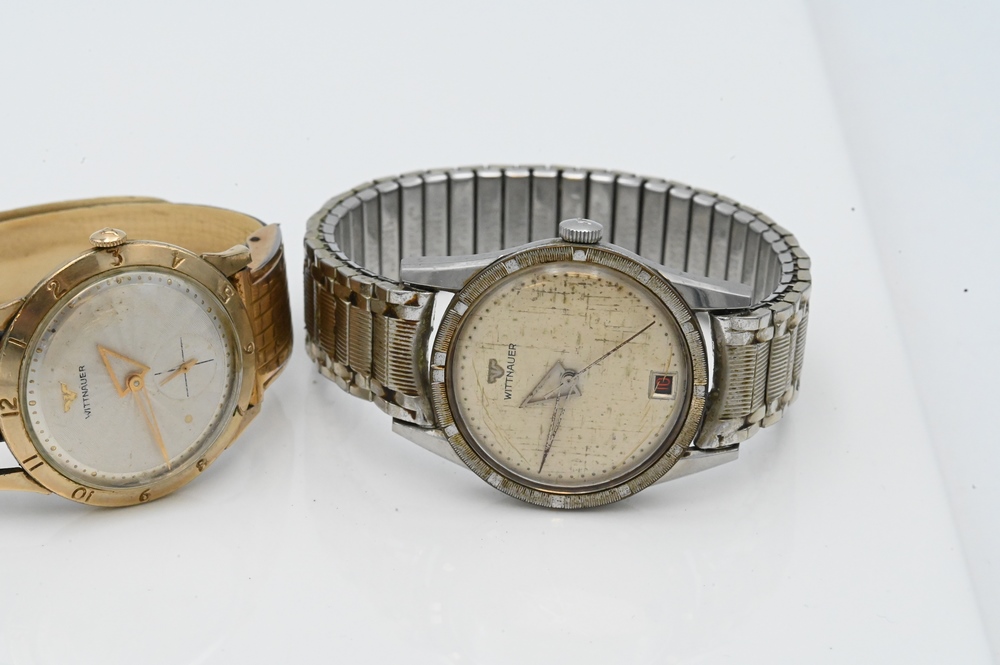 Two Vintage Mens Wristwatches, to include Wittnauer stainless with calendar along with a Navier with second hand. Provenance: Fifty Year Personal Collection of Clocks and American Antiques from Thomas Bailey, Manchester, Connecticut.