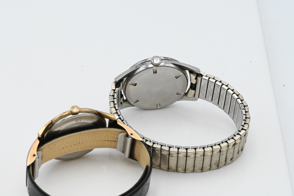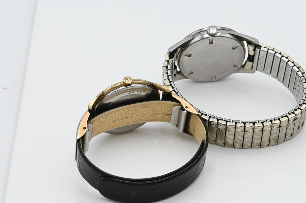 Lot 38C: Two Vintage Mens Wristwatches, to include Wittnauer stainless with calendar along with a Navier with second hand. Provenance: Fifty Year Personal Collection of Clocks and American Antiques from Thomas Bailey, Manchester, Connecticut.