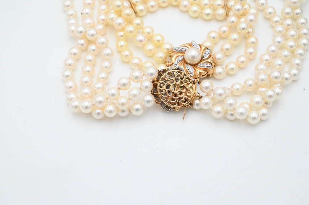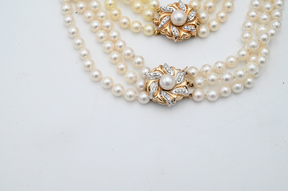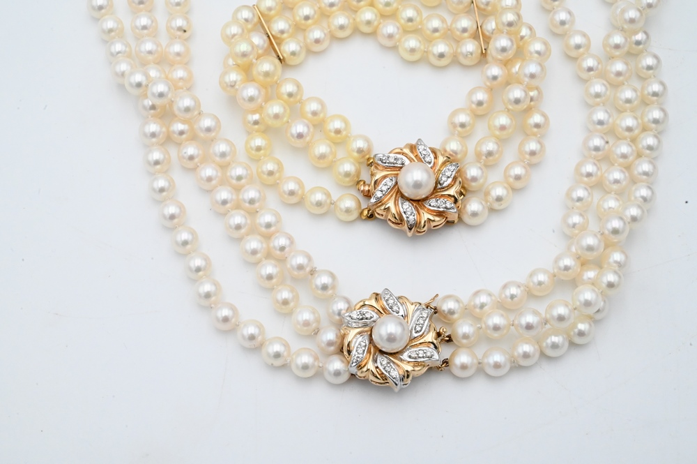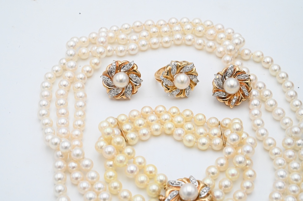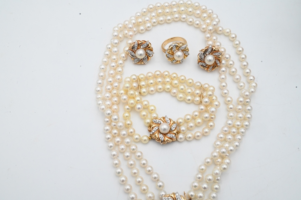 Pearl Four Piece Set, to include a pair of 14 karat gold earrings set with center pearl and floral diamond surround, with matching ring and matching clasp on three strand pearl necklace, ring size 7, ring and earrings 22.2 grams, necklace length 16 1/2 inches, necklace 6.46 millimeter pearls.