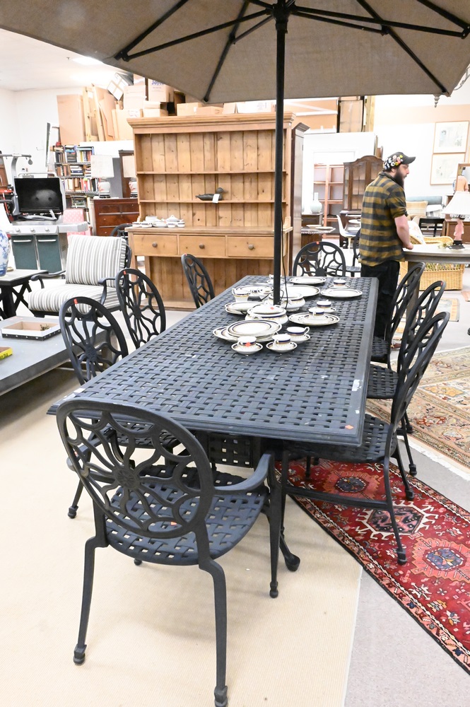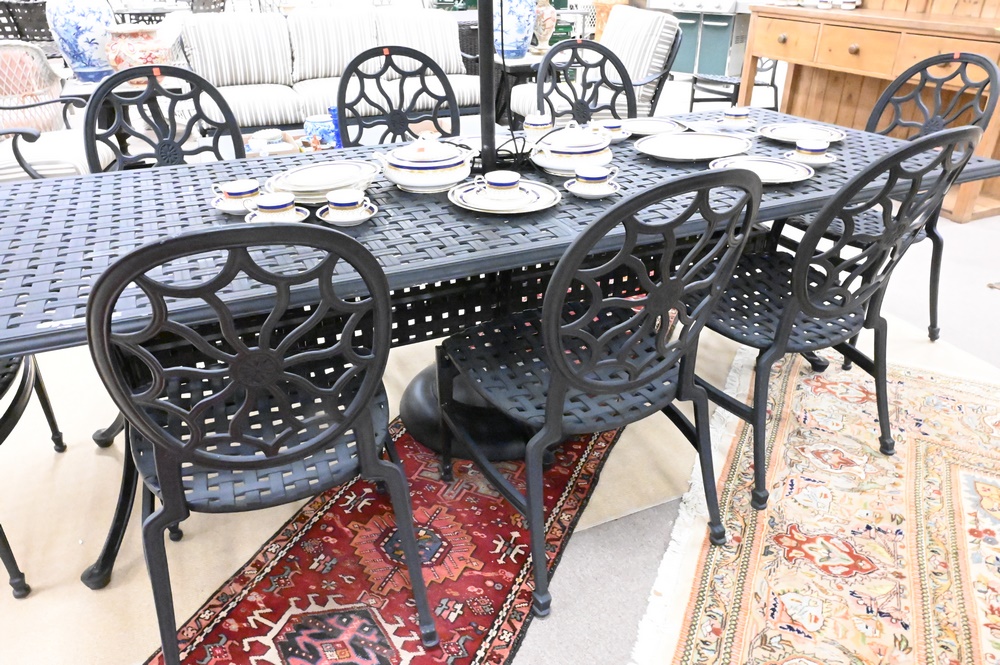 Lot 39: 12 Piece Summer Home Classics Outdoor Aluminum Dining Set, to include 10 “Sheridan” chairs, along with a “double lattice” dining table, retail over $12,000, table top 42″ x 110″.