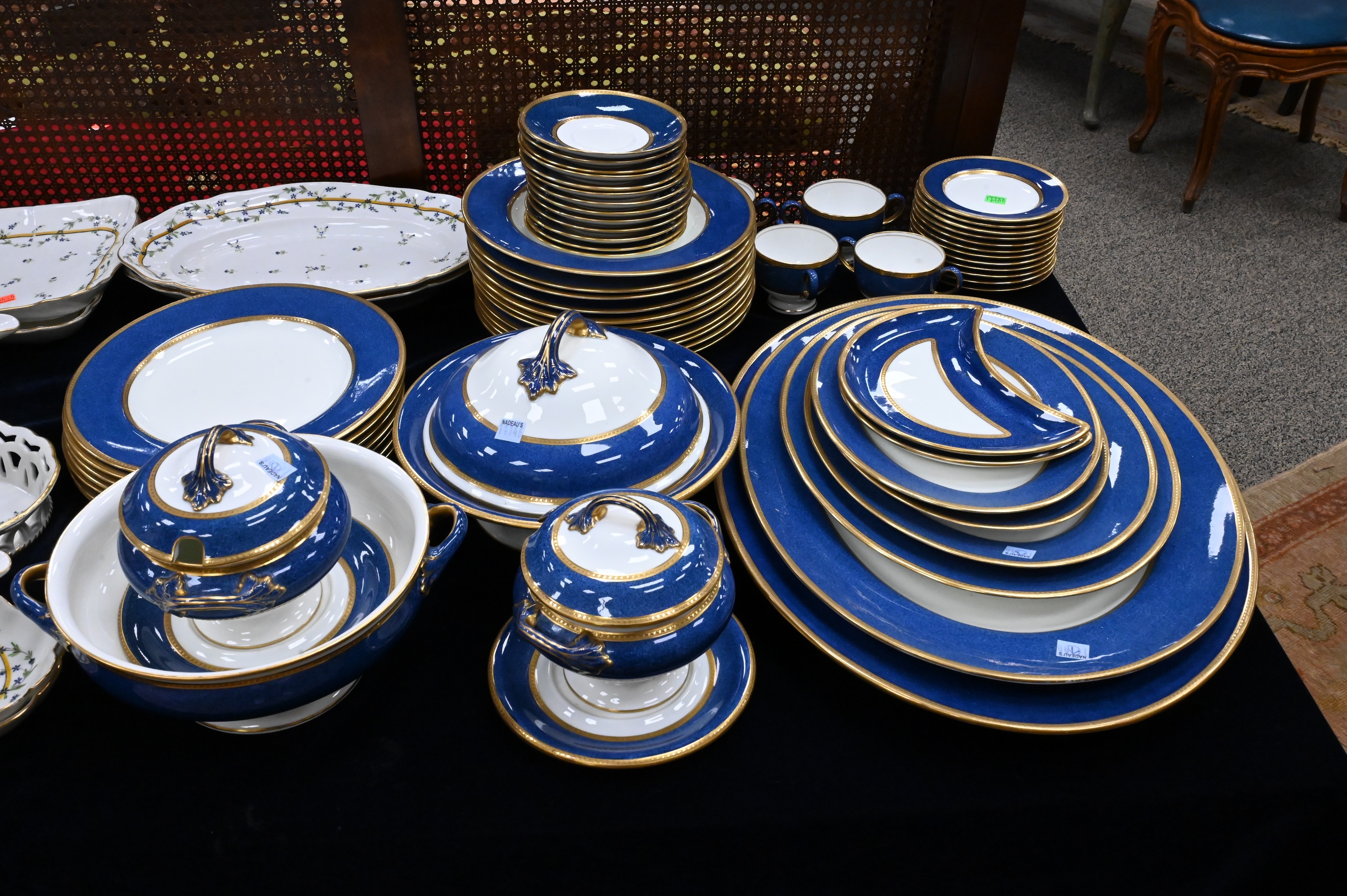 Porcelain dinner service each piece decorated with a rich cobalt-blue ground and classical gilt borders, to include 15 dinner plates (diameter 10 1/2 inches) 14 luncheon, plates,15 salad/dessert plates,12 bread and butter plates, 12 cups with handles, 21 saucers, 11 soup plates, 10 crescent (half-moon) bone plates, three covered tureens, two small covered tureens, two small underplates, six various oval platter, one large uncovered bowl with handles, all pieces marked T. Goode & Co. London – Wedgwood England