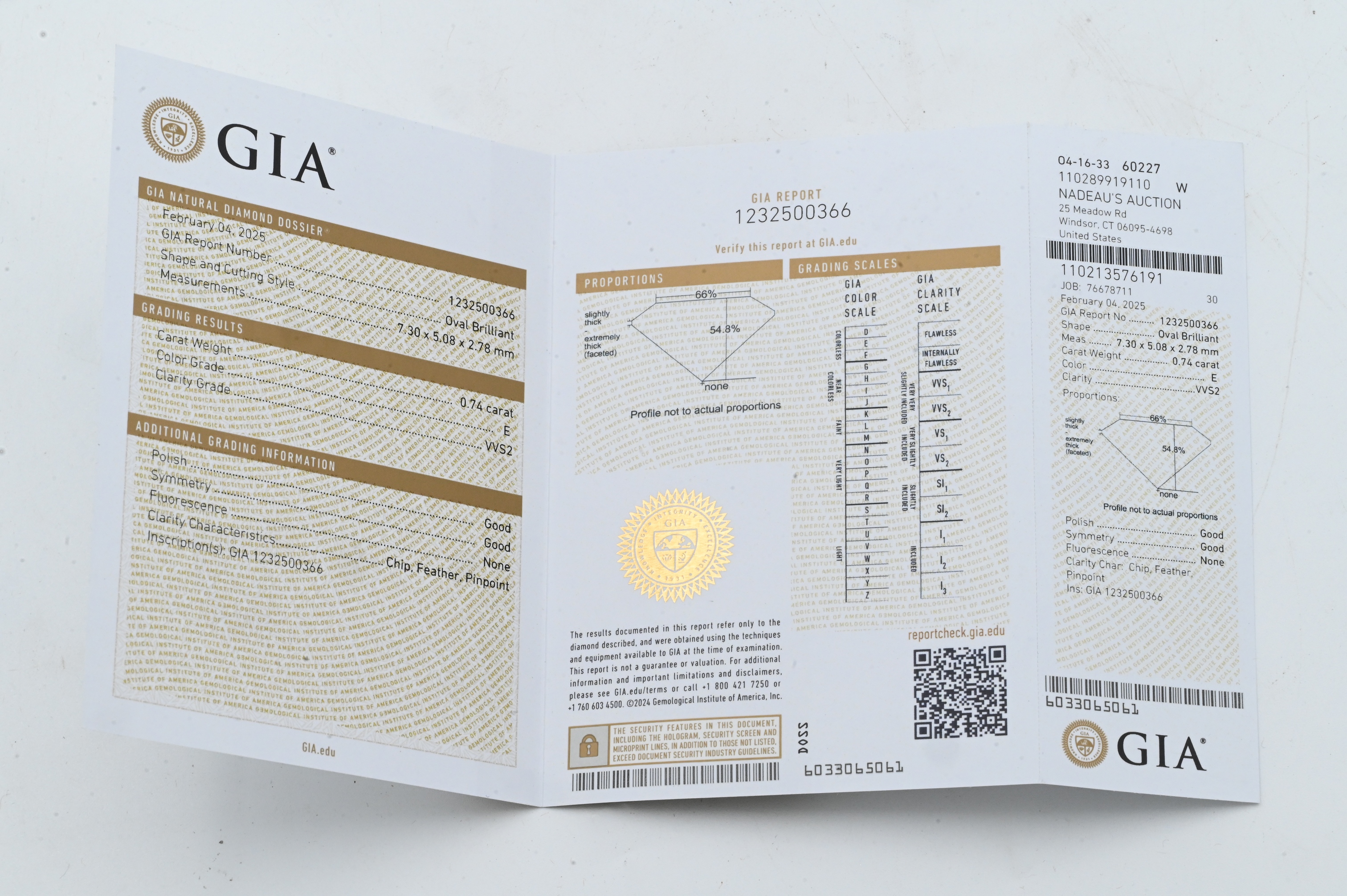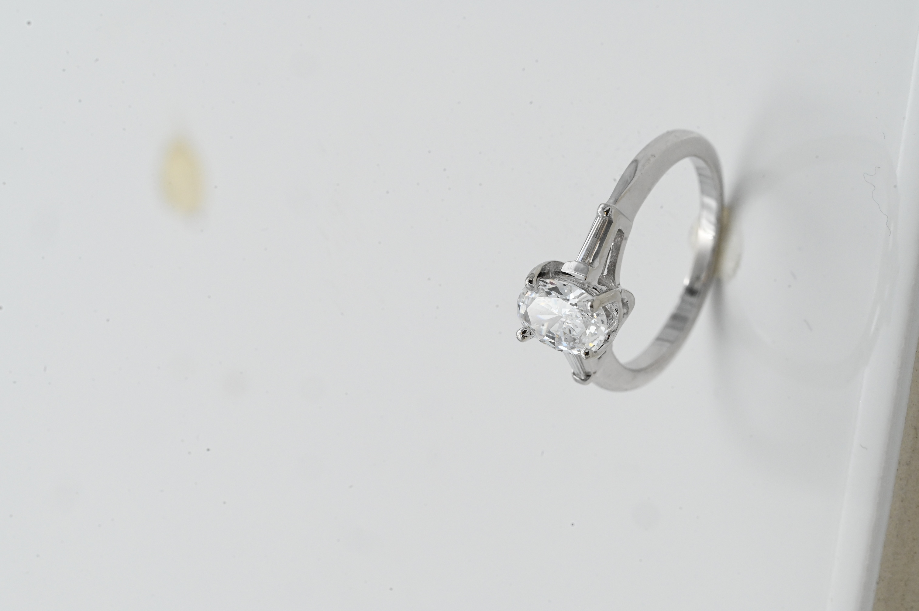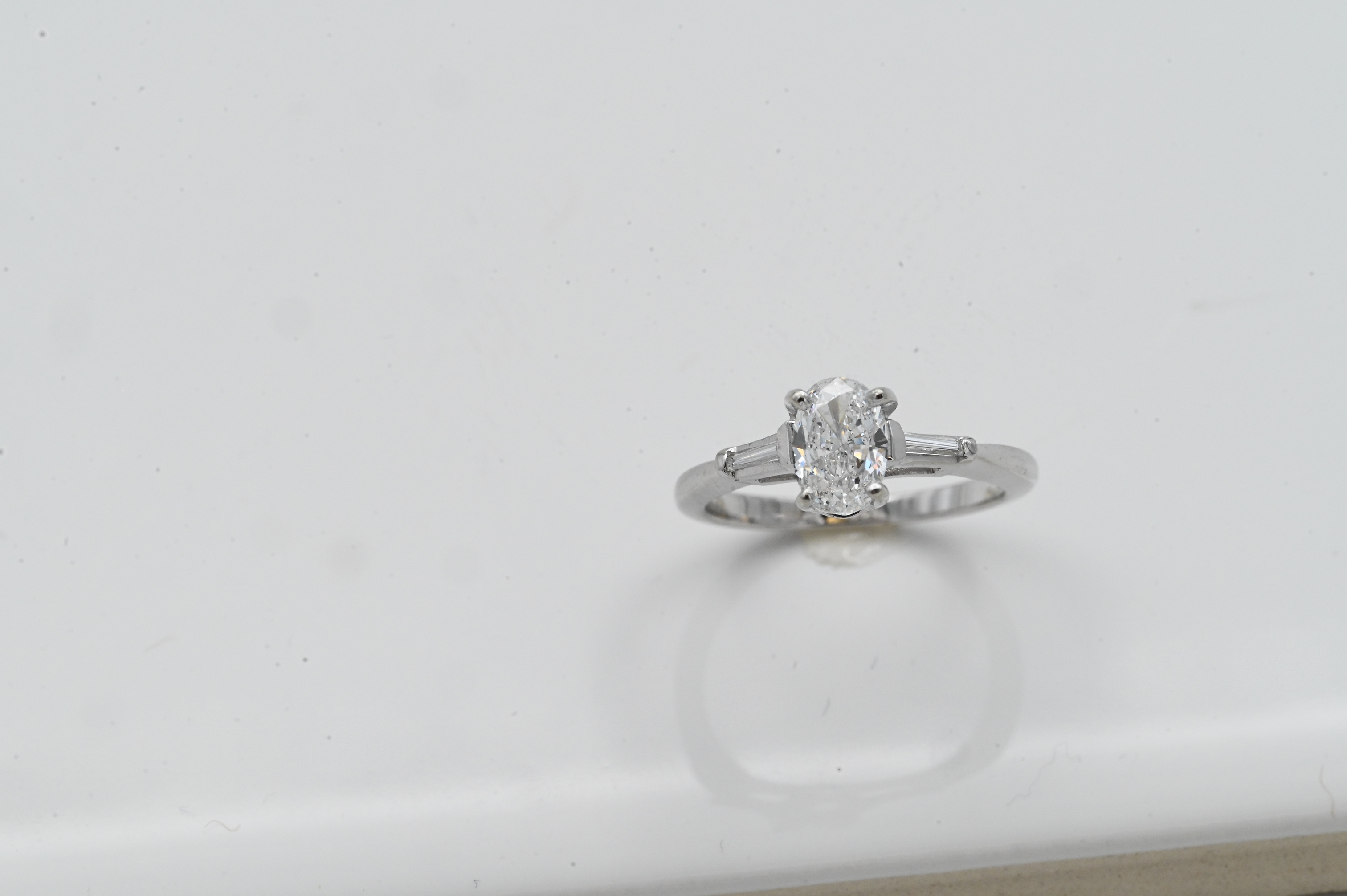having center oval diamond, .74 carats flanked by small tapered baguette E color VVS2 with G.I.A report #1232500366