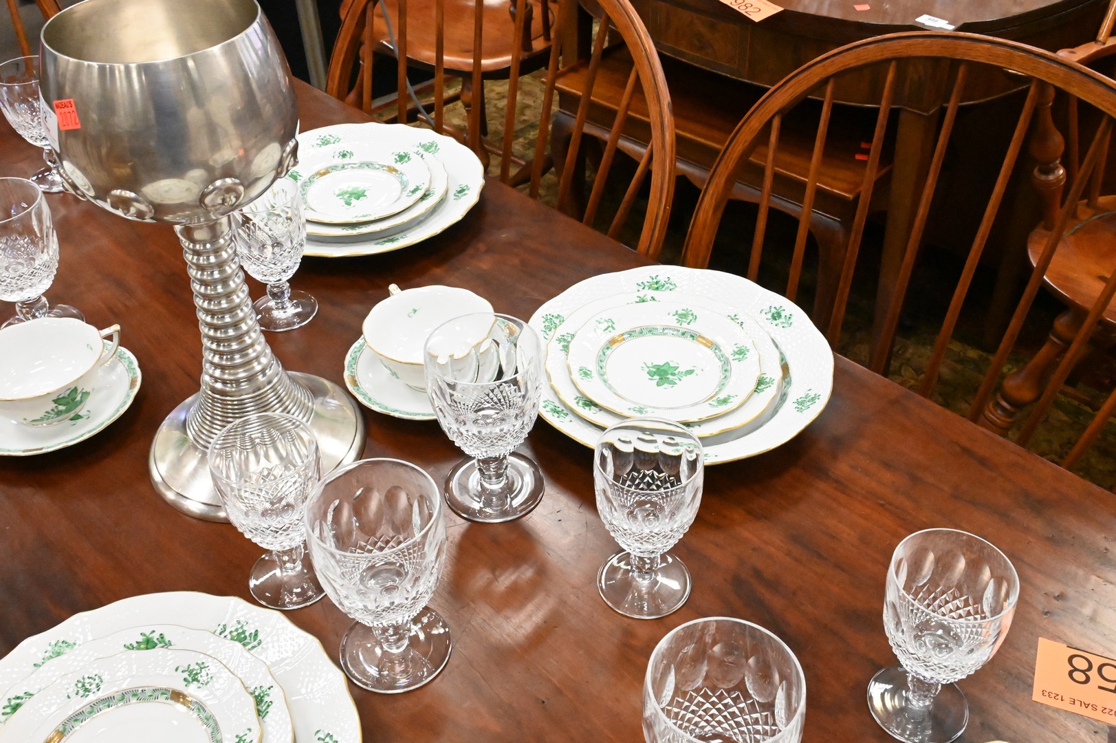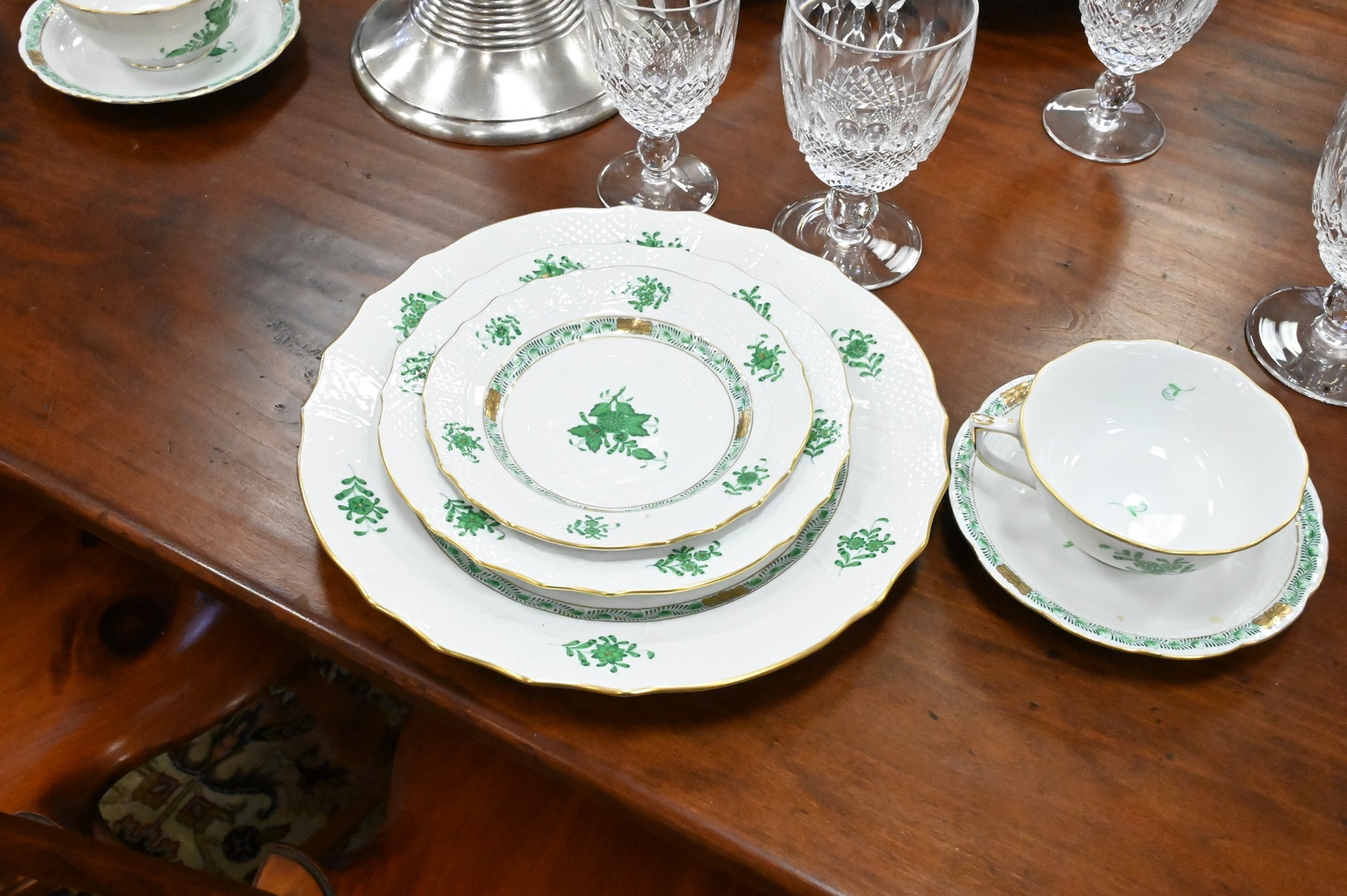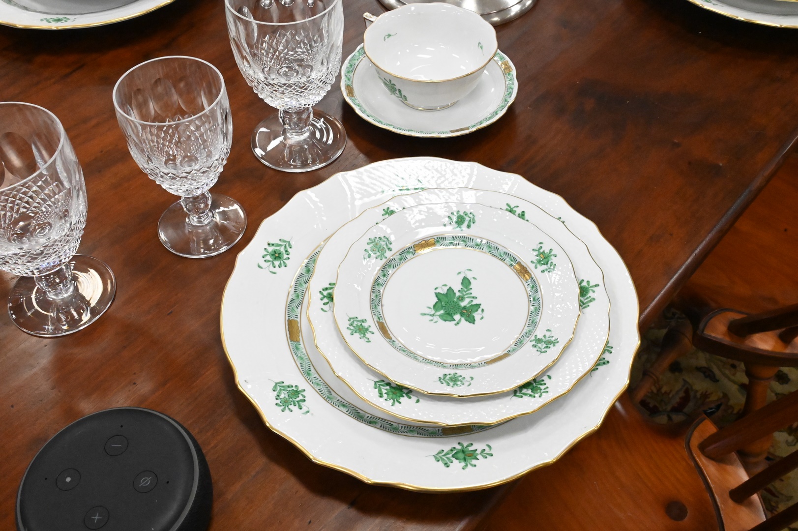 40 Piece Herend Porcelain Partial Dinnerware Set, Chinese Bouquet, green pattern, to include 6 dinner plates, 6 salad plates, 6 bread plates, 4 teacups, 7 tea saucers along with 11 other serving pieces, Provenance: Estate of Cyril H. Moore Jr, Kent, Connecticut.
