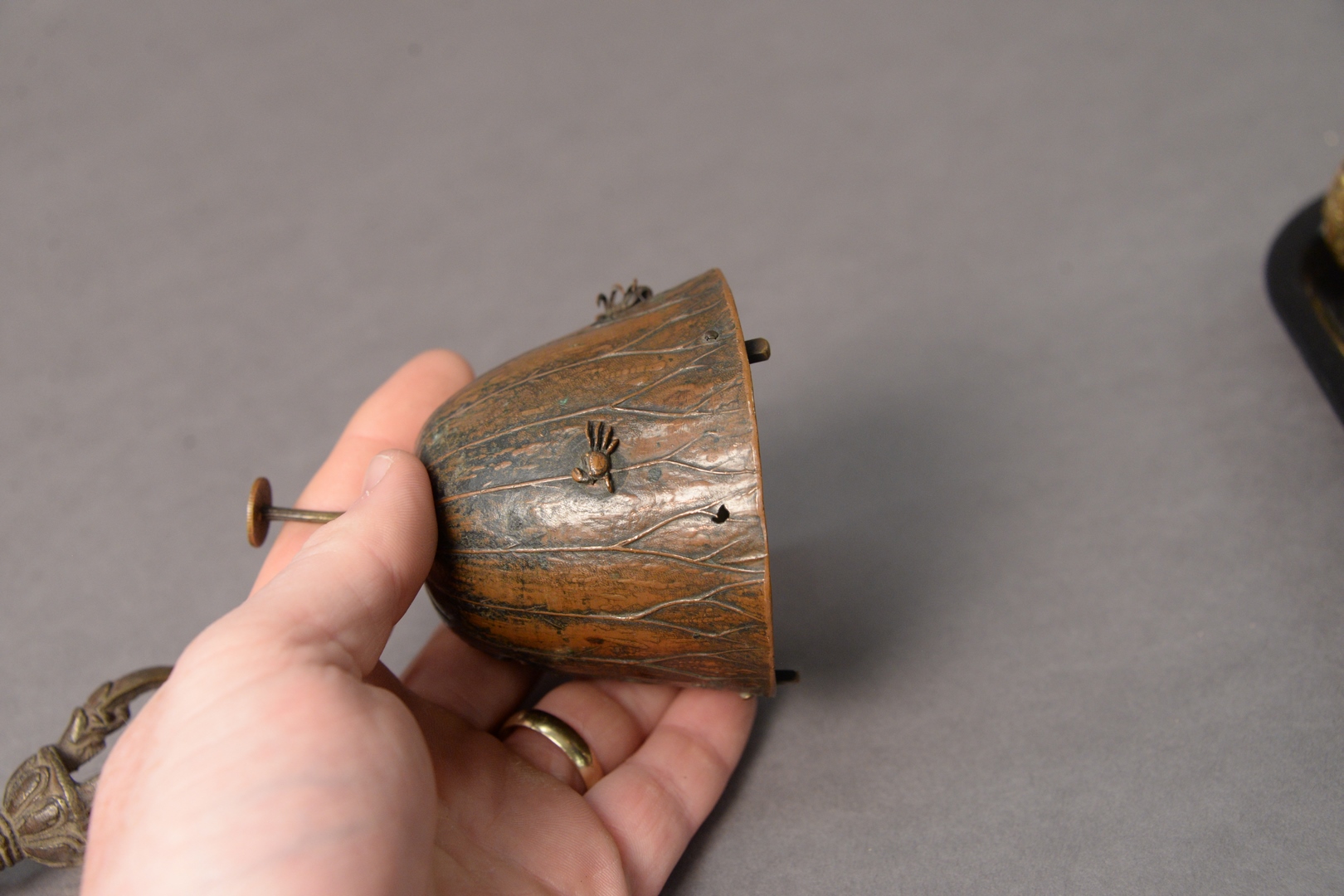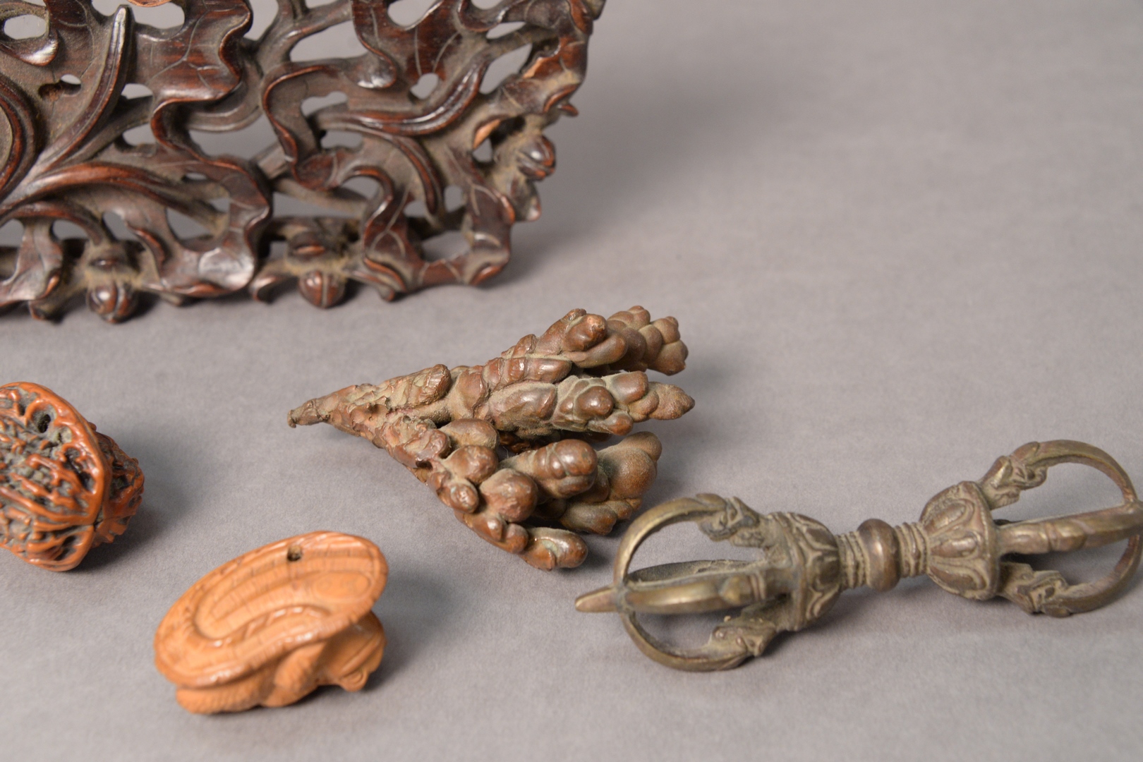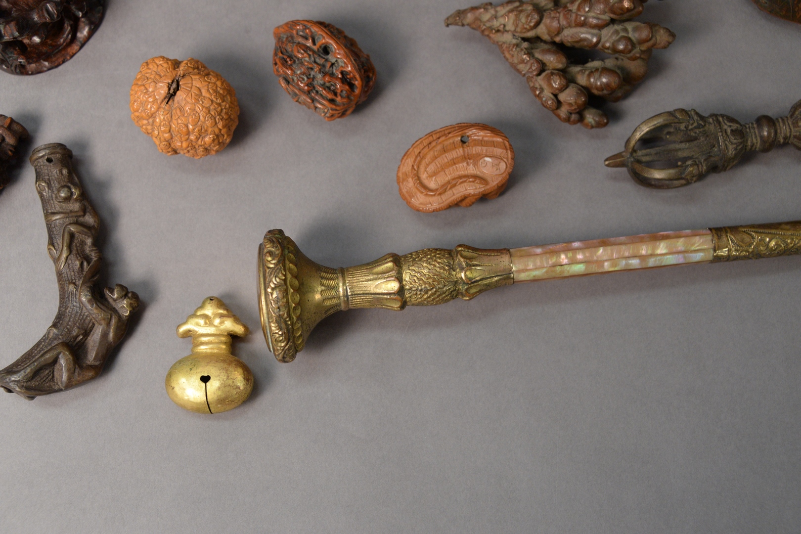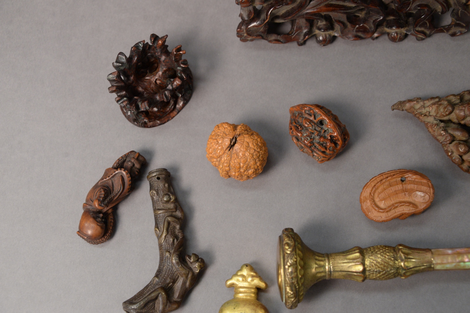 Assorted Group of Items, to include carved wood toad netsuke spider mounted bronze bell with crabs two carved Chinese stands carved octopus netsuke carved walnut shell 100 faces carved figural walnut shell cane and umbrella handles, etc.