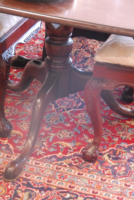 Custom mahogany two part dining table with two 18 leaves, slides and brass hooks.