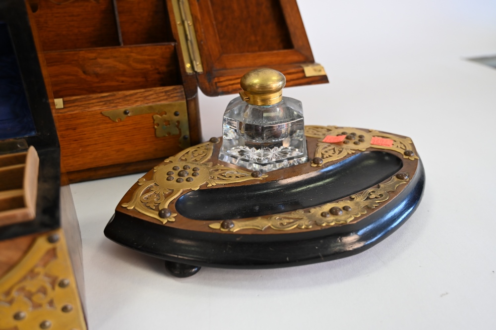 Four Piece Group, to include burl tea box having brass mounts, dome top brass bound letter box, inkwell having brass mounts along wi…