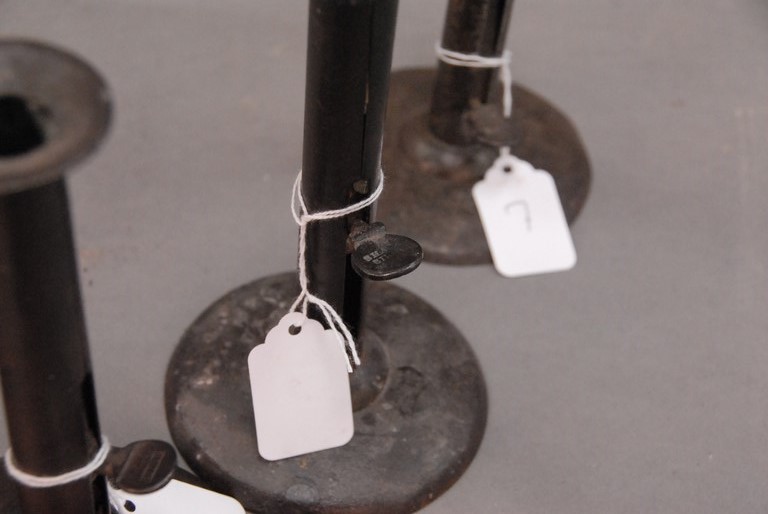 Four tole hog scraper pushup candlesticks, three are signed. ht. 6in. – ht. 7in.