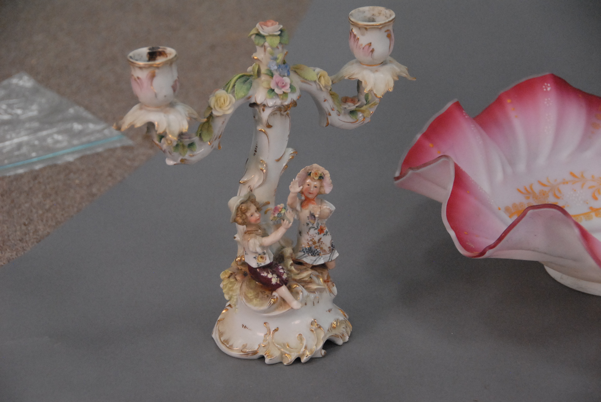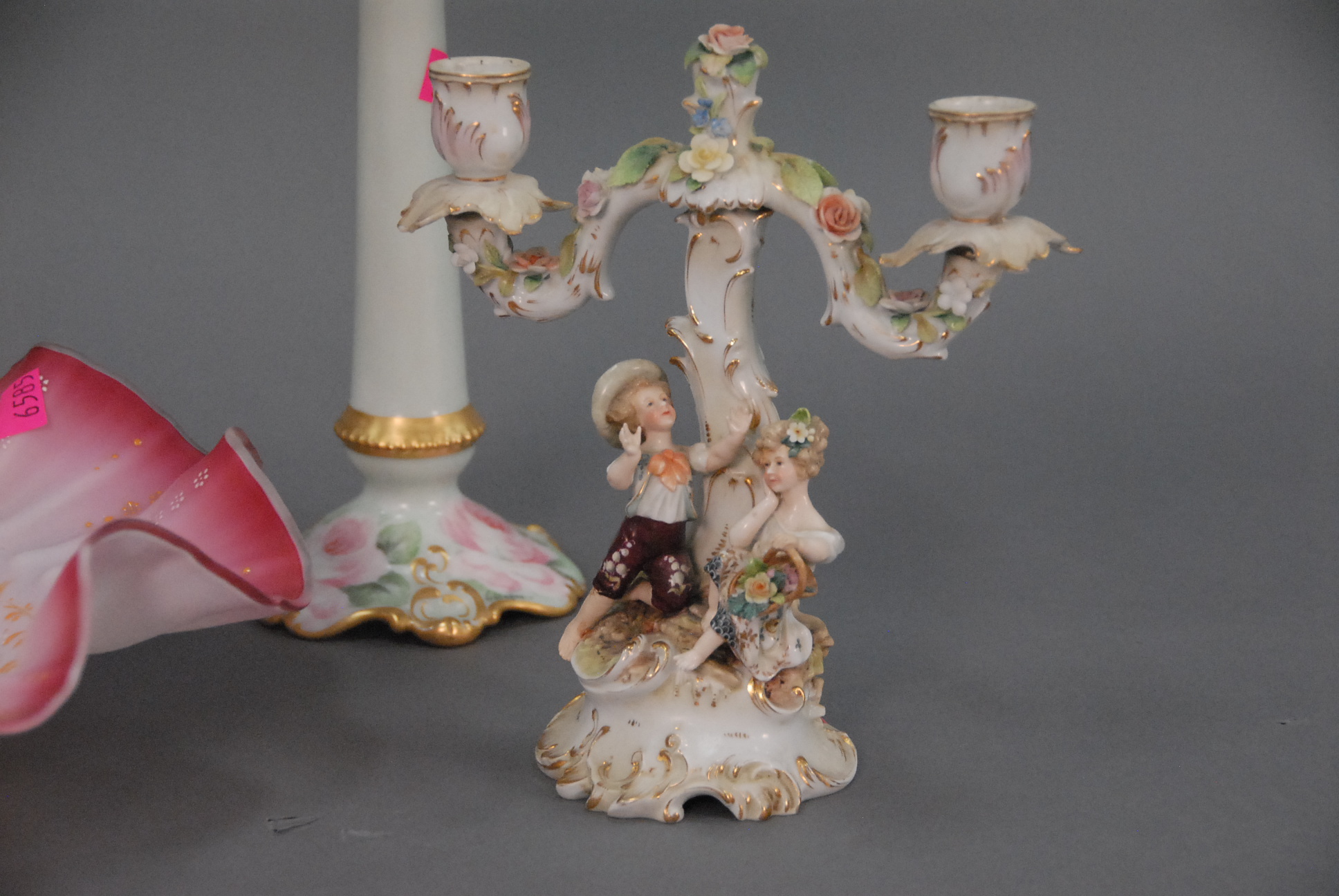 Group of four items glass flower bowl, large hand painted Limoge compote as is, and pair of porcelain figural candlesticks ht. 8.