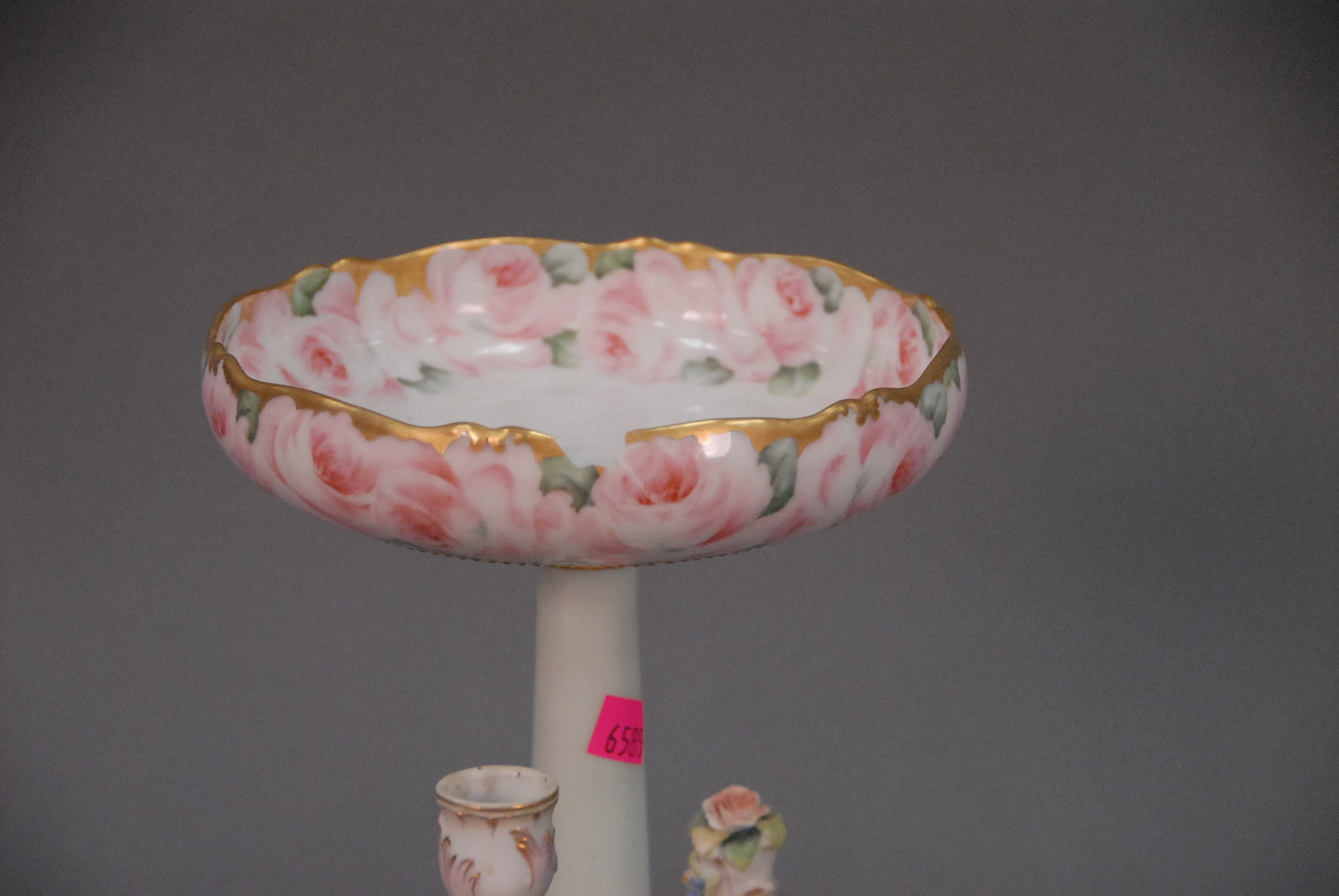 Lot 39: Group of four items glass flower bowl, large hand painted Limoge compote as is, and pair of porcelain figural candlesticks ht. 8.