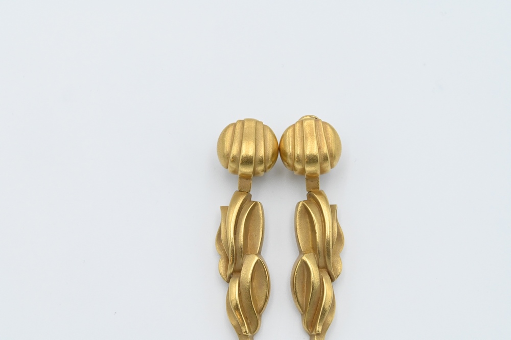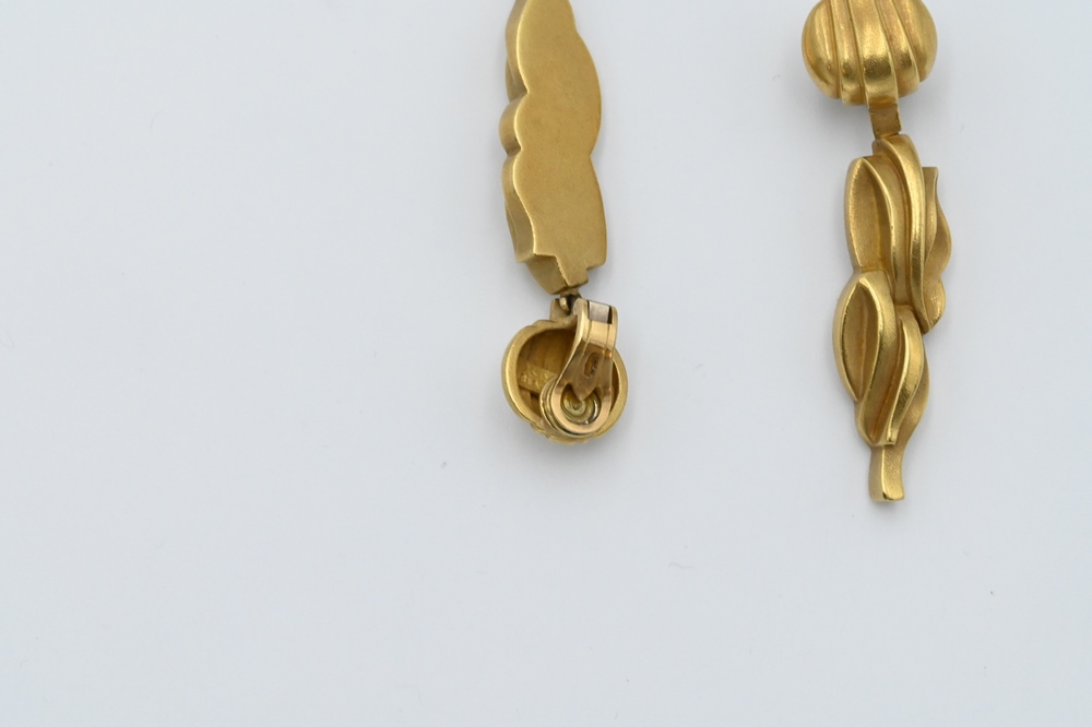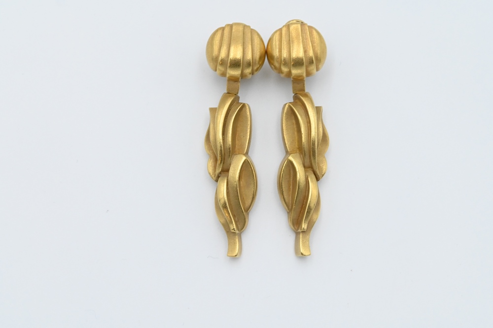 Lot 39: Kieselstein Cord Pair of 18 Karat Gold Ear Clips, having long dangling drops, height 2 1/4 inches, 34.4 grams.