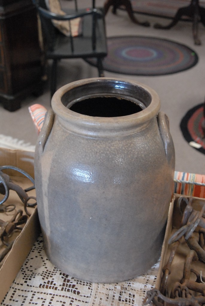 Stoneware crock with blue flower decoration, 2 gallon.