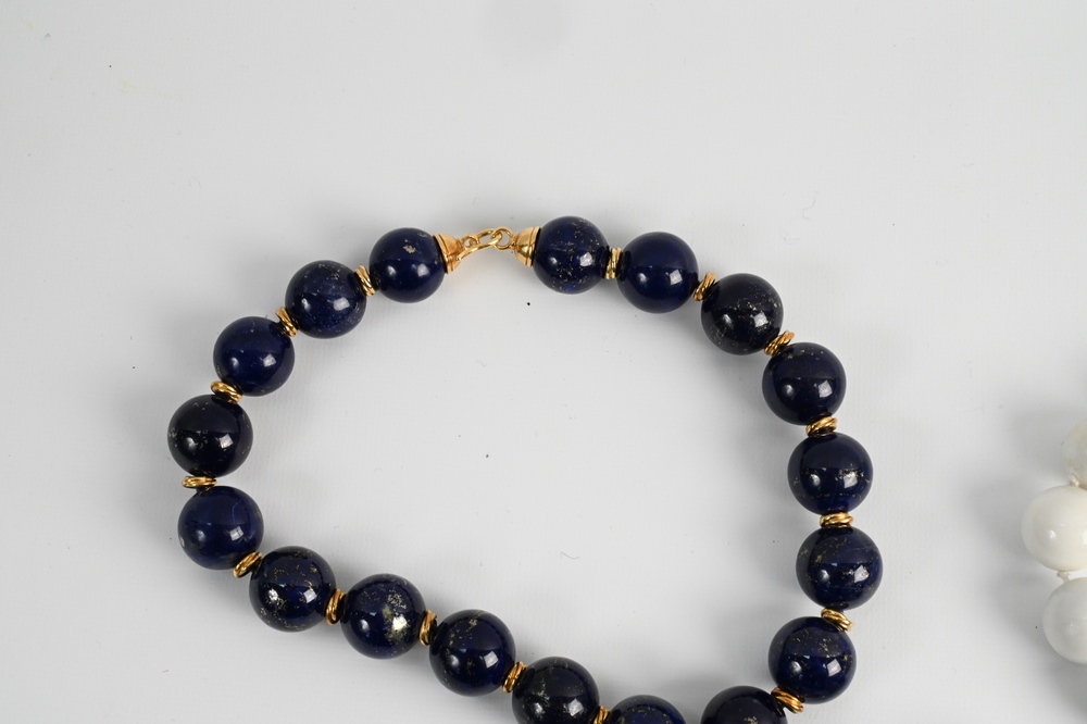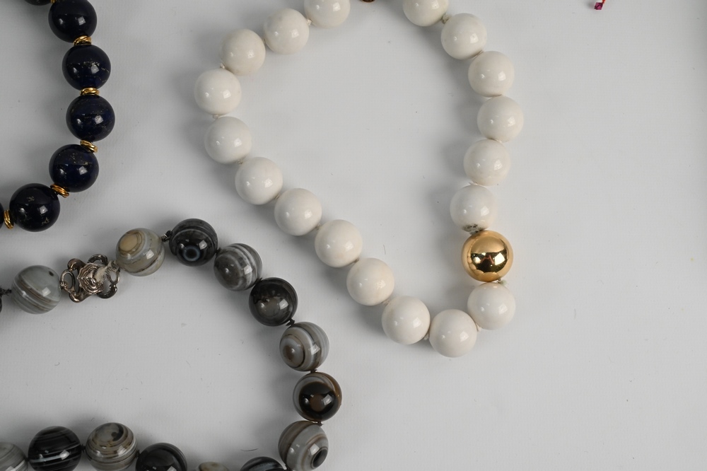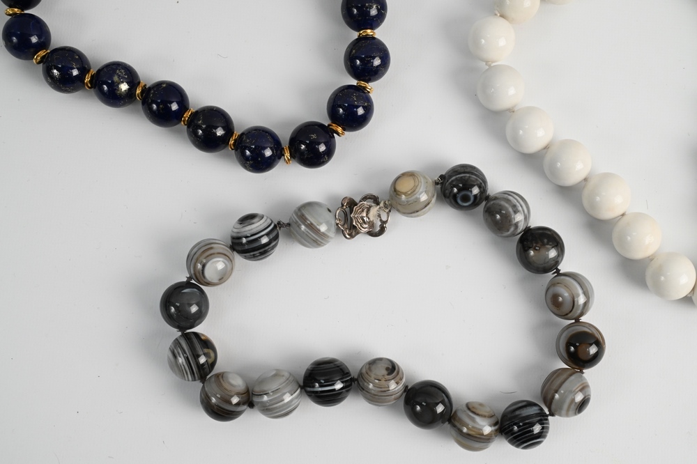 Three Large Beaded Necklaces, to include ringed agate having sterling clasp, large lapis lazuli, along with a white stone necklace, length 18 inches.