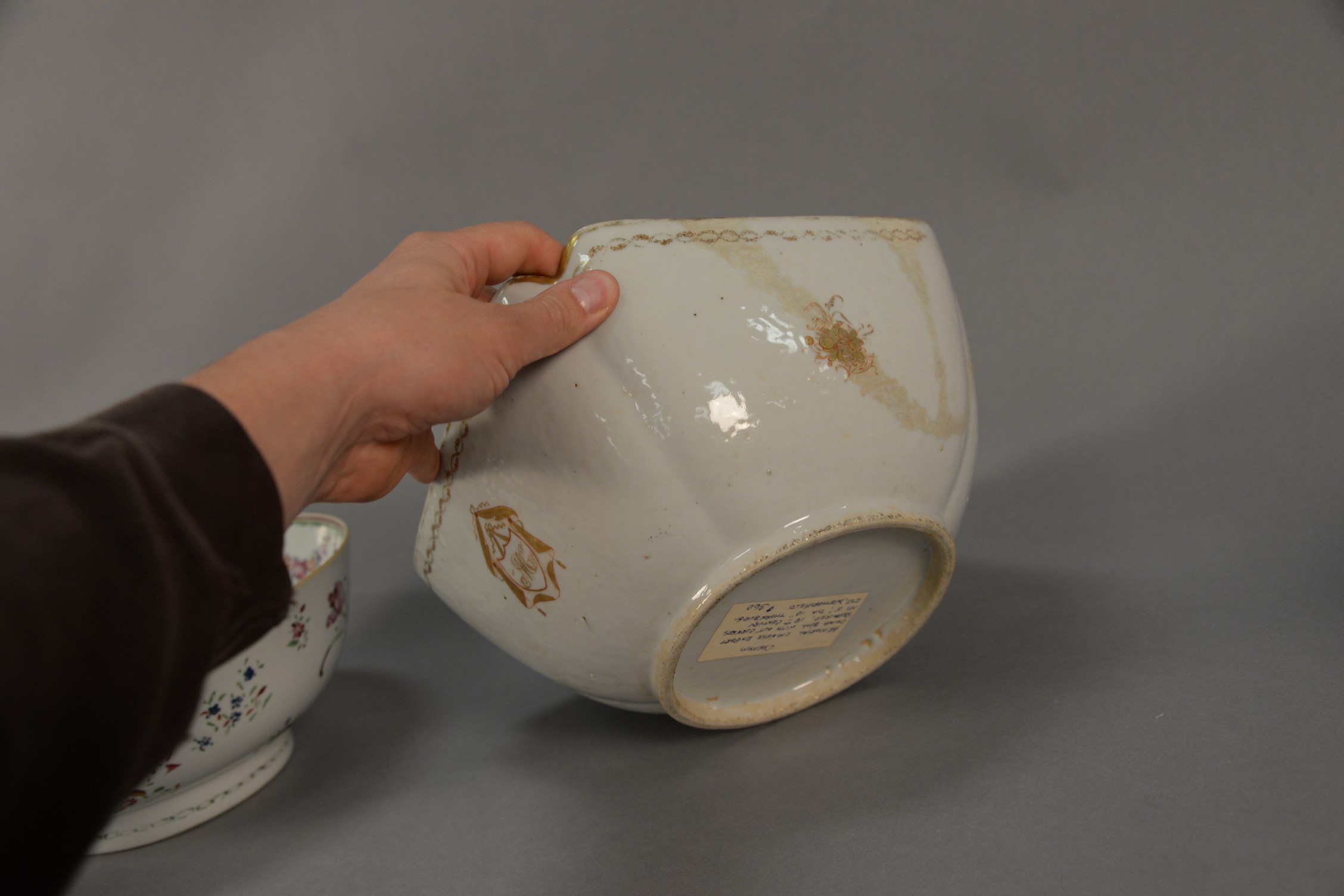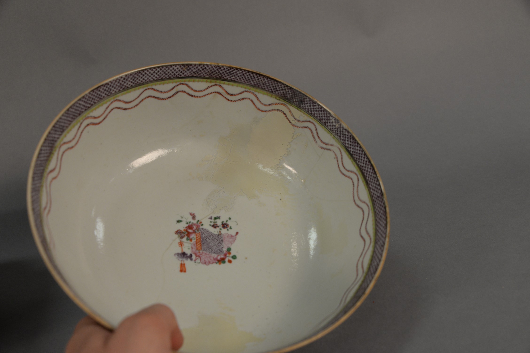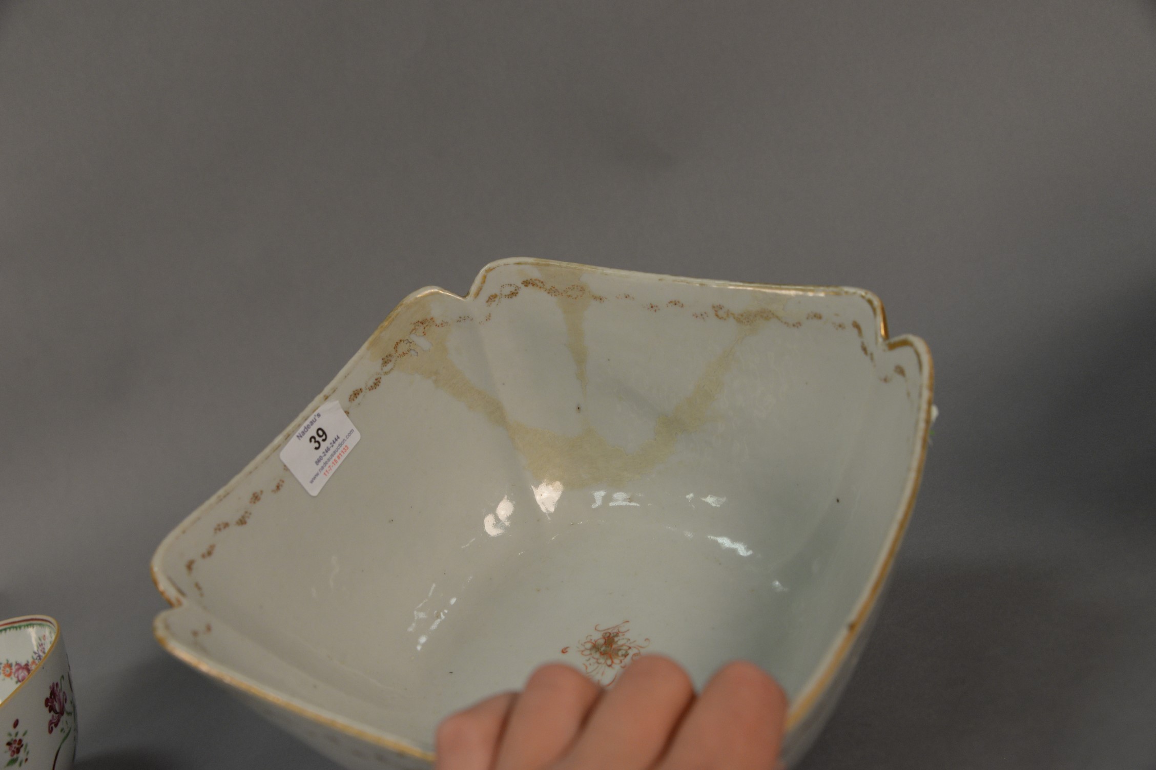 Lot 39: Three piece export lot with square bowl repaired and two export round footed bowls one repaired. ht. 4 1/4 in. dia. 10 1/4 in.