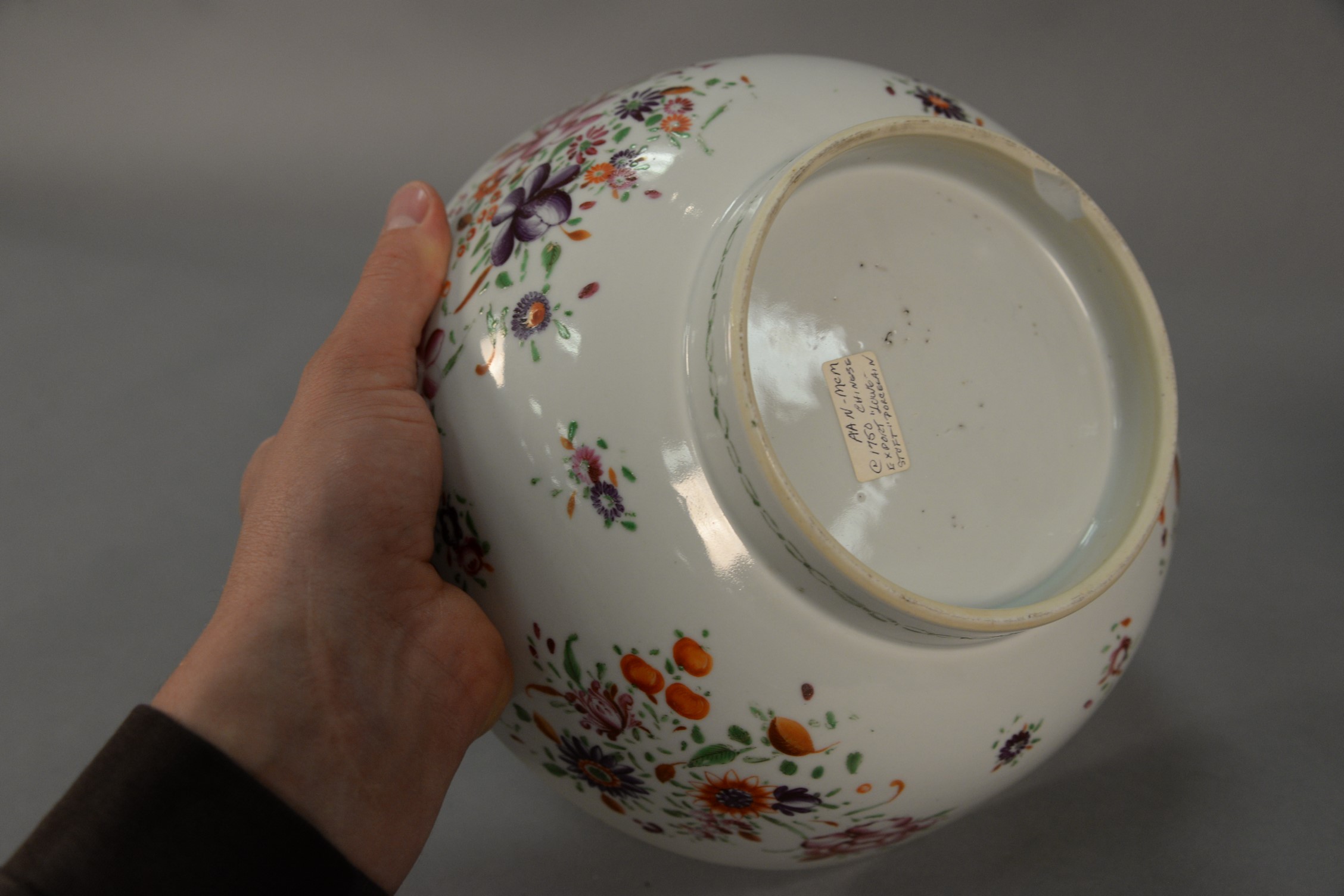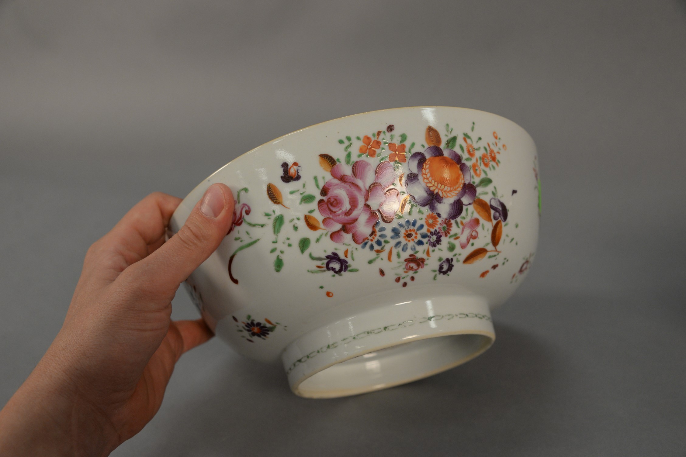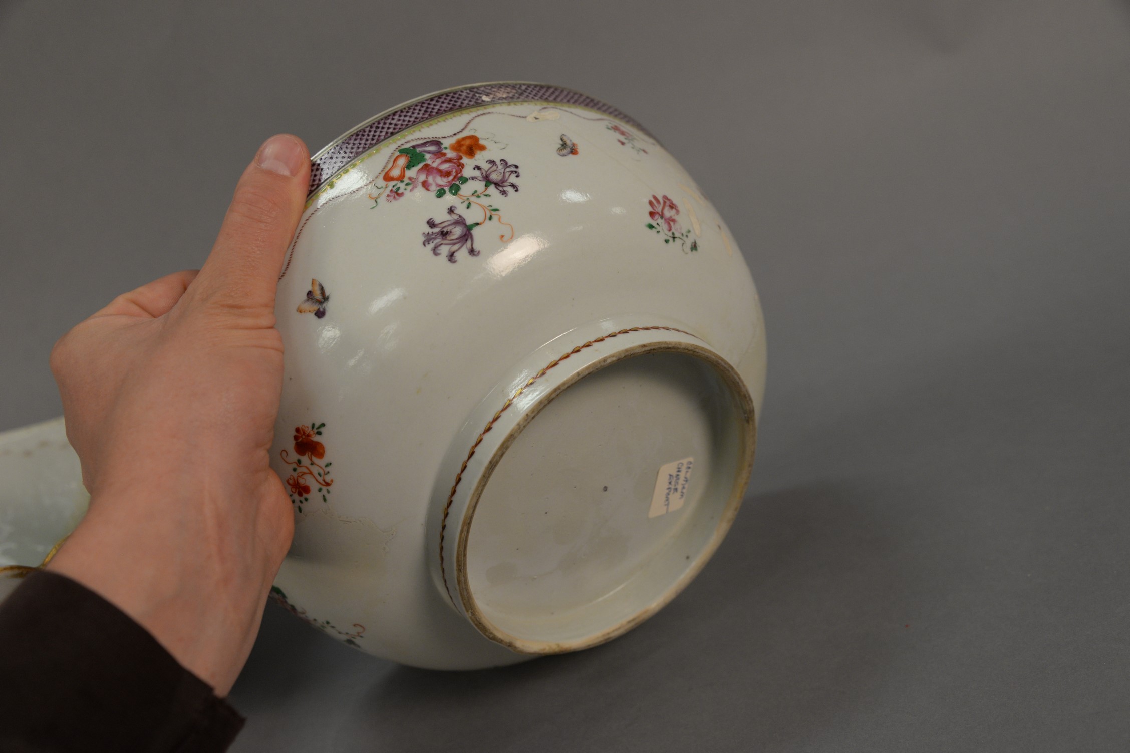 Lot 39: Three piece export lot with square bowl repaired and two export round footed bowls one repaired. ht. 4 1/4 in. dia. 10 1/4 in.