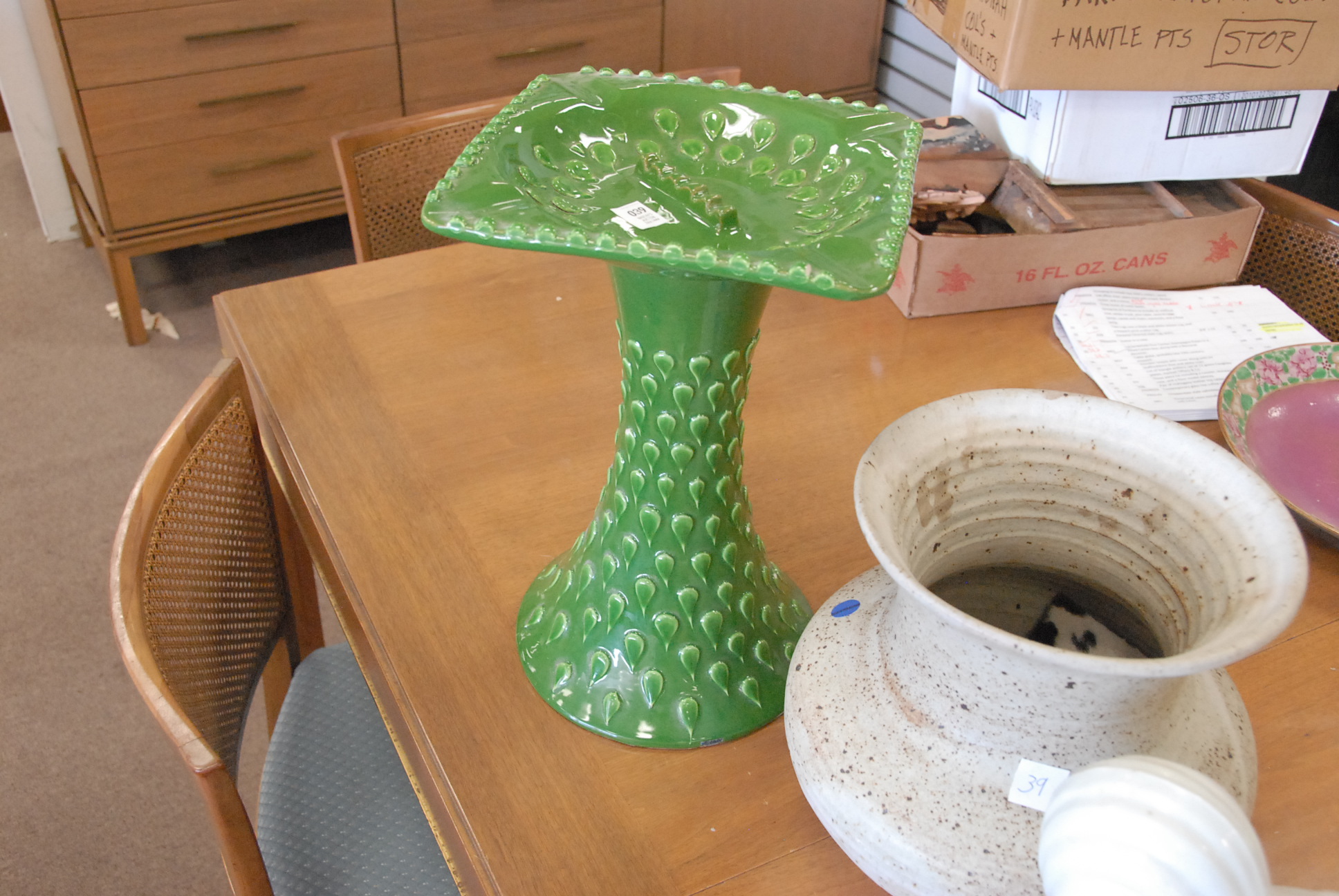Three piece lot including a rooster, stoneware vase, and a floor model ashtray.