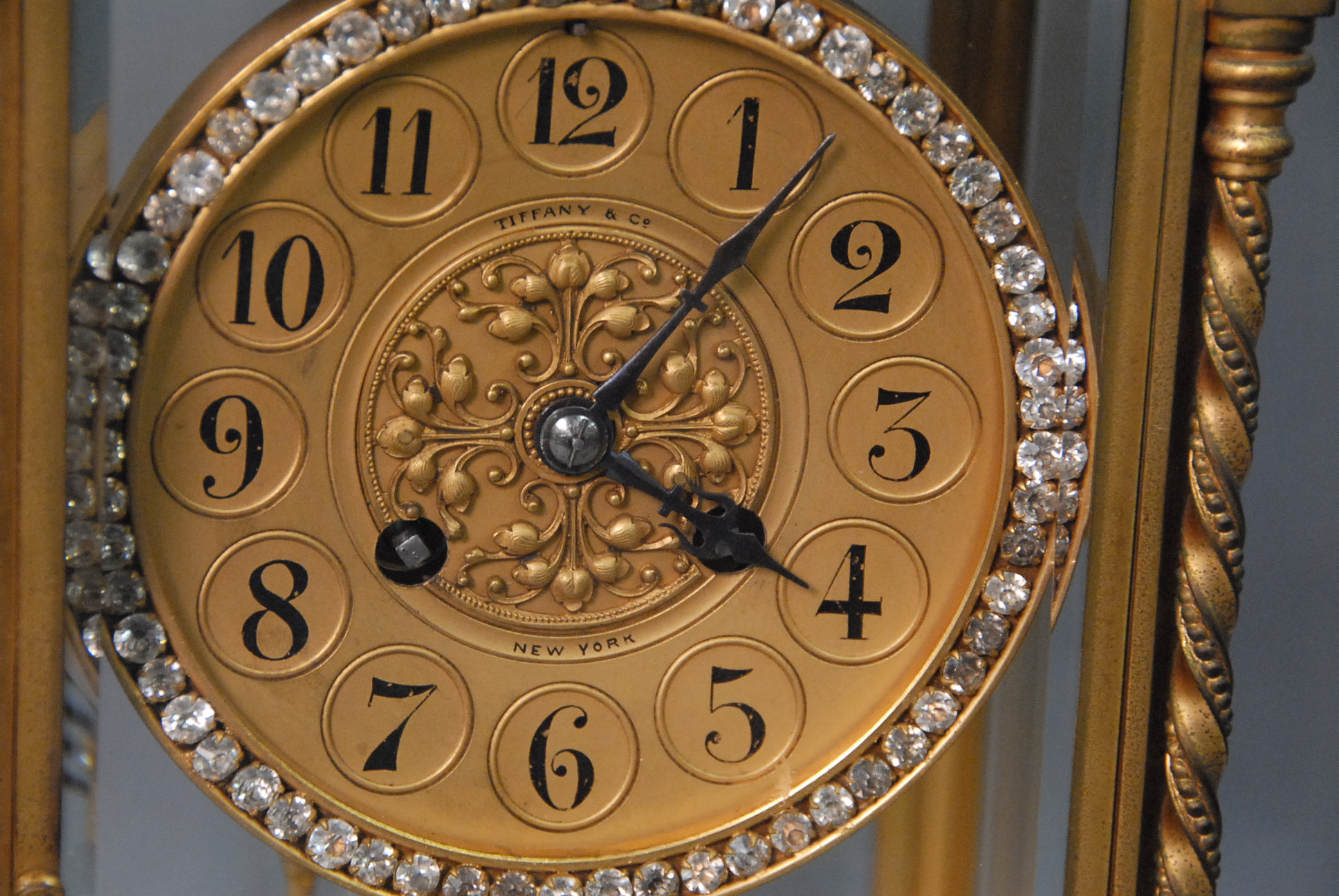 Tiffany & Co. brass and glass regulator clock dial mounted with rhinestones, marked Tiffany & Co., New York.