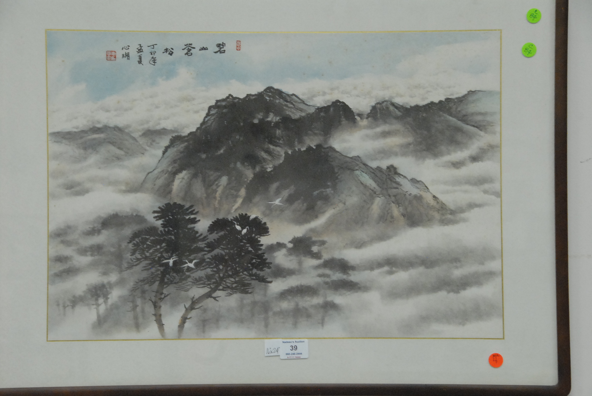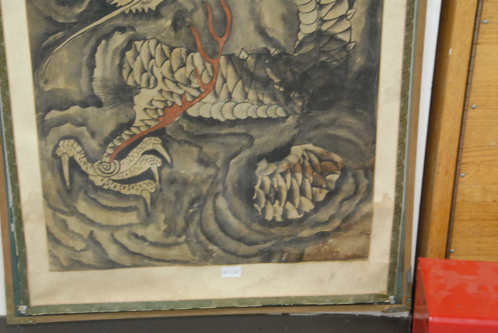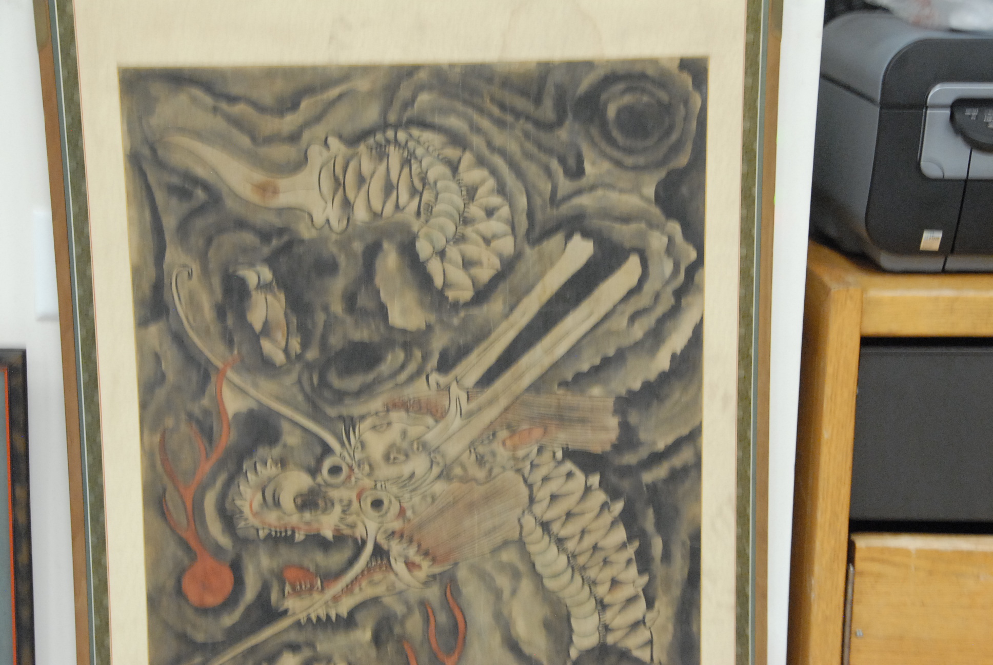 Two Oriental watercolors, one of a mountainous landscape and the other of a dragon.