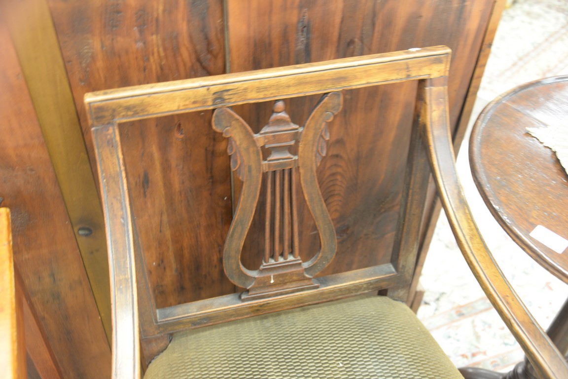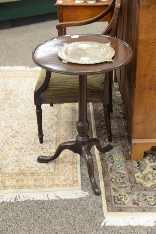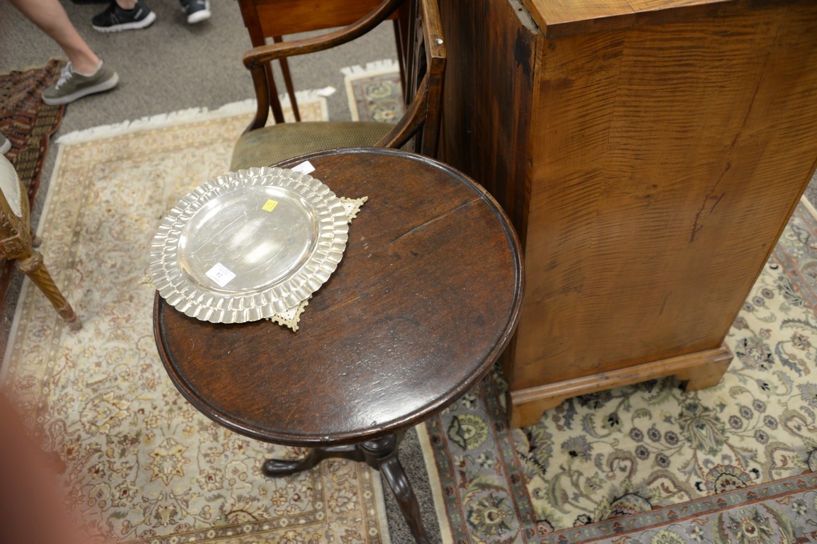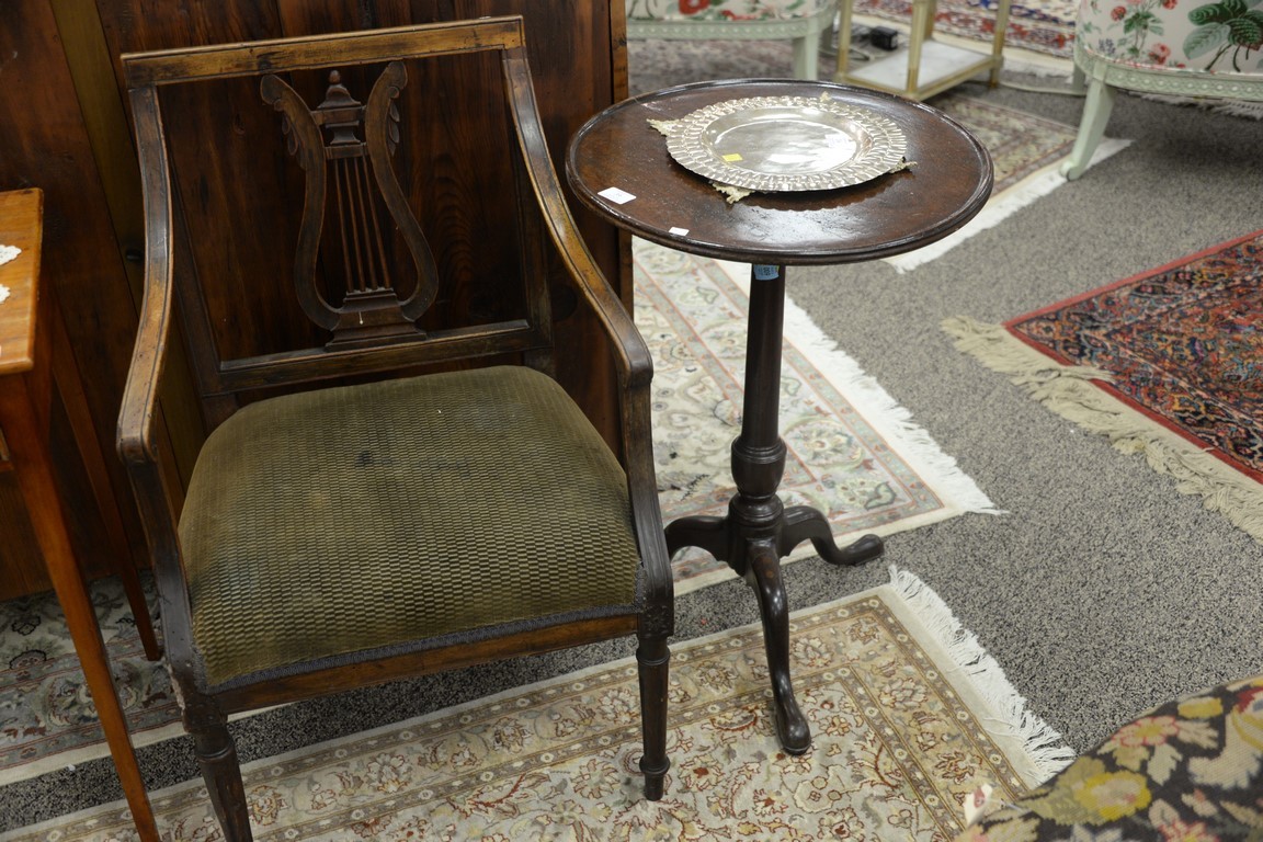 Lot 39: Two piece lot including a round mahogany candlestand ht. 28in., dia. 19 1/2in. and a Continental armchair, both 19th century.