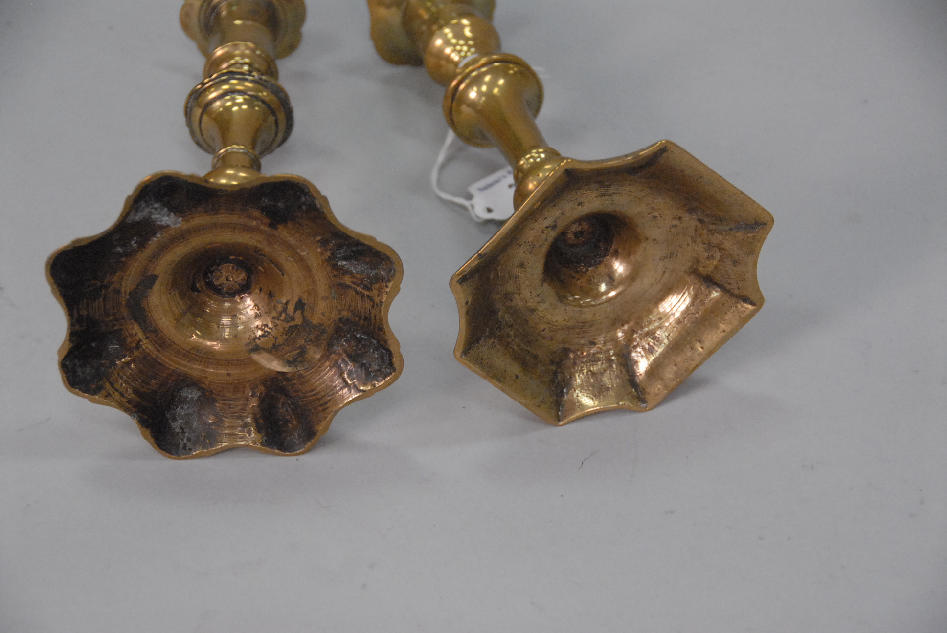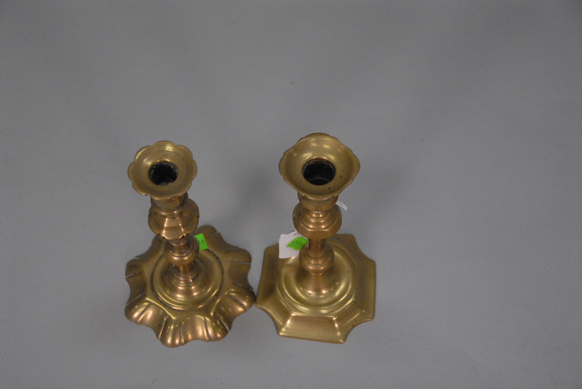Lot 39: Two Queen Anne brass candlesticks, one with petal base and top. ht. 7 3/4in.
