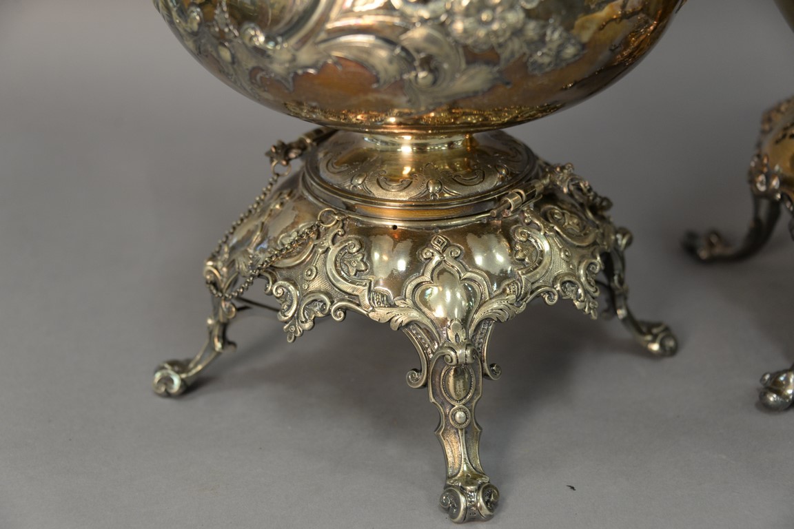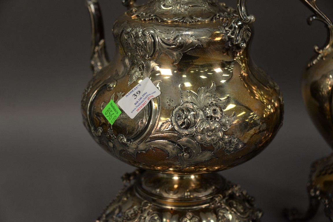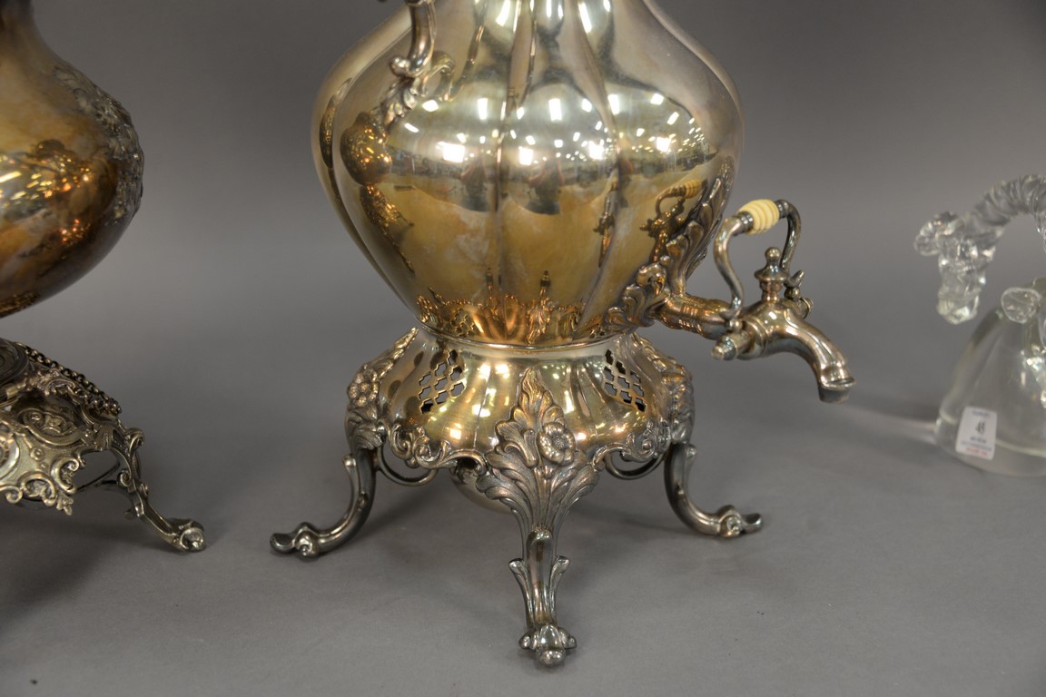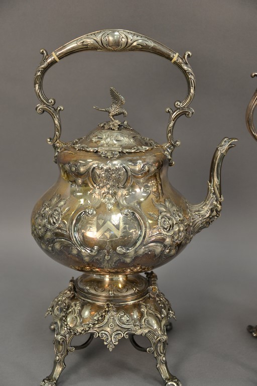 Two silverplate hot water pots, one with bird finial. ht. 16 1/2in. & ht. 17in.