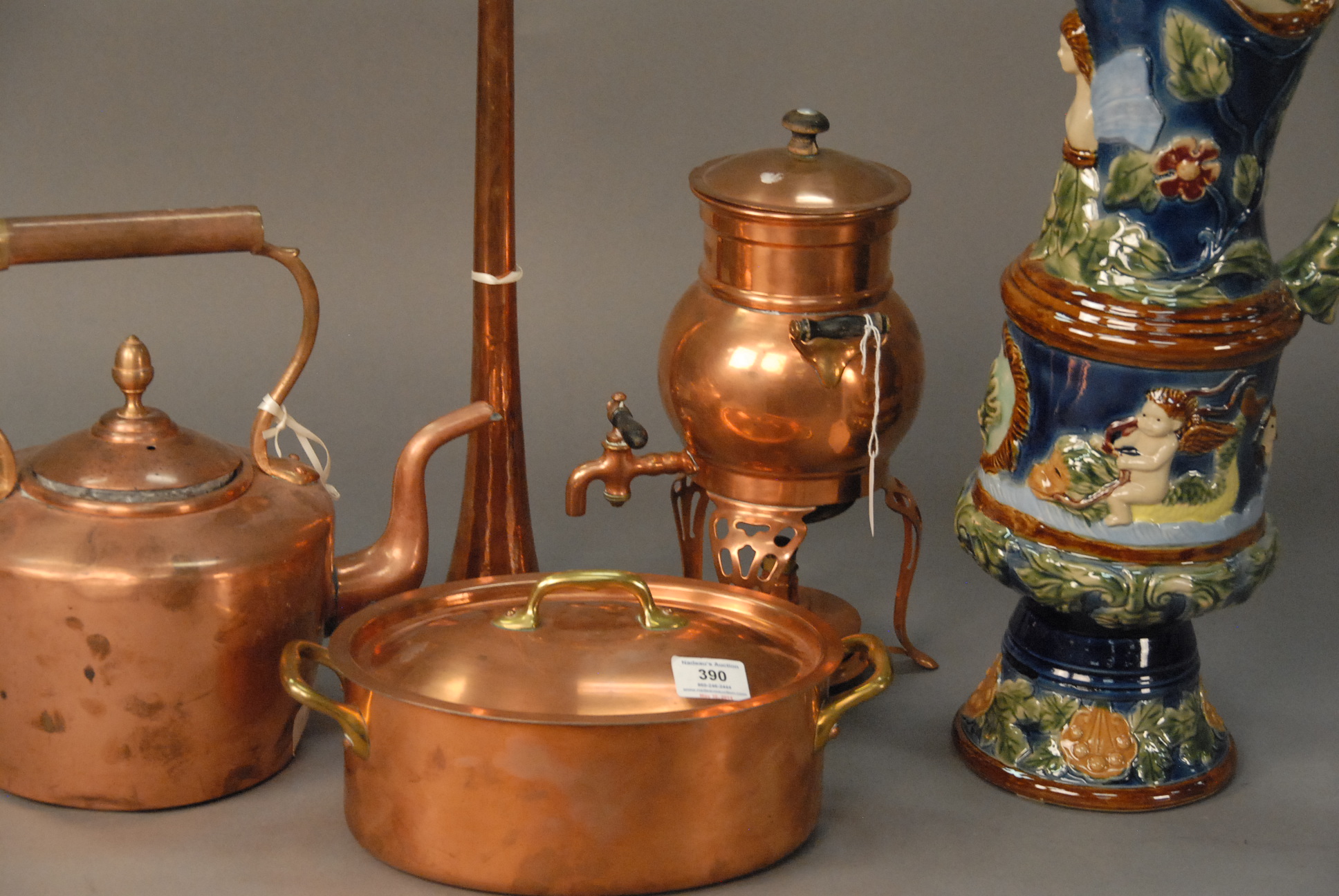 Lot 390: Five piece grouping including four copper pieces and tall pitcher.